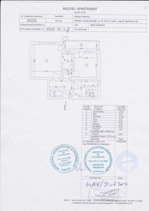 Ofer un colț de Rai. Un apartament cu două camere, decomandat, la etajul 3 al unui bloc aflat în vecinătatea Vilei Plopul, a Lacurilor cu nuferi, a Clinicii Olănești din cadrul Spitalului Elias, cu doar 16 apartamente, construit în 1970 fiind situat într-o curte (2500 mp) frumos întreținută de către unii proprietari. Prin ordin de prefect emis în anul 1990, noul proprietar va deține, în proprietate, si o suprafață de 108 mp de teren, în indiviziune, din cocheta grădină ce înconjoară blocul. Apartamentul prezentat în fotografii are o suprafață utilă de 63,72 mp (inclus balconul), compus fiind din două dormitoare, dressing, două holuri, baie, bucătărie și un balcon generos, cu vedere spre Paradis, cu suprafața de 6,41 mp, accesul în balcon fiind posibil din ambele camere. Micul Paradis (prima fotografie prezintă imaginea pe care proprietarul o vede în timp ce-și savurează cafeaua în balcon) se vinde cu dressing, baie și bucătărie utilate, perdele și rulouri pentru toate ferestrele, centrală de apartament pe gaz Ferolli (instalația confecționată din cupru și calorifere din aluminiu), A.C. 12 BTU NEO nefolosit, în camere parchet stejar rașchetat și lăcuit, ușă metalică intrare, balcon închis tâmplărie PVC, tocuri și uși noi confecționate din lemn de brad, un nou implant electric din cupru realizat în anul 2014: - baia pezintă: mobilier baie, baterii Kludi pentru duș și lavoar, ventilator Venter, - bucătaria prezintă: mobilier pe comandă, chiuvetă și baterie Franke, frigider no frost Samsung, plită gaz și cuptor electric Bompani, mașina de spălat Indesit, ventilatoar Venter. Reabilitarea termică a blocului este prevăzută în proiectele Primăriei Orașului Băile Olănești. Vecinii nu sunt nici mai buni și nici mai răi decât suntem noi toți, adică sunt oameni. Călătorule, nu rata ocazia, oprește-te din drumurile tale și bucură-te de oportunitate!