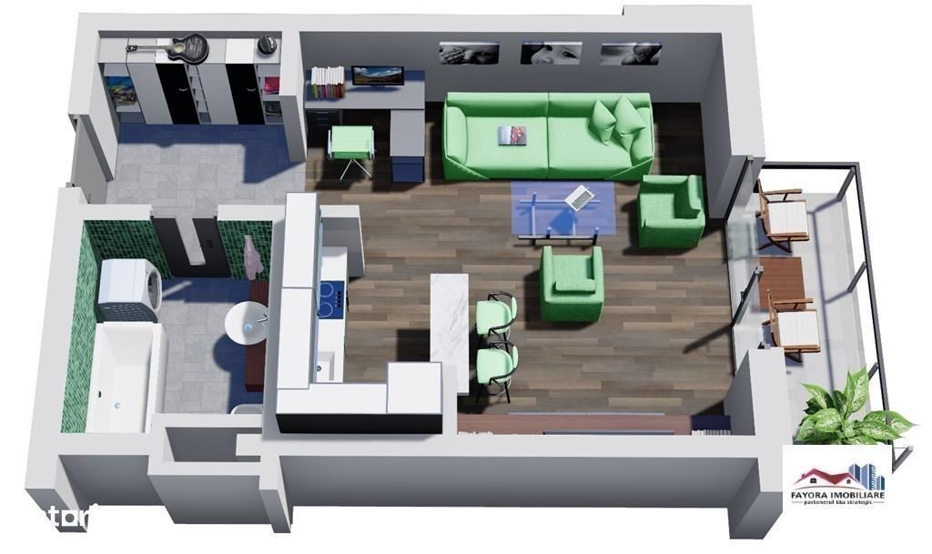 Apartament cu 1 Camera Tip A1 de Vanzare in Ansamblul Green Residence Apartament SMART - confortul viitorului, disponibil acum in Ansamblul Green Residence! Apartamentul este ideal pentru cei care vor o experienta de locuire inteligenta proiectata pentru stilul de viata al prezentului. Fayora Imobiliare impreuna cu Partenerii bancari te ajuta sa obtii un credit imobiliar si daca lucrezi in strainatate, pentru ca se pot lua in calcul si veniturile obtinute in afara tarii. Comisionul este 0 pentru achizitionarea oricarui apartament in Ansamblul Green Residence. Apartamentele Tip A1 au spatii largi avand suprafata utila cu terasa inclusa de 44,4 mp, fiind compuse din: o camera, bucatarie, baie, hol si terasa. Fiind concepute cu camere mari si terase generoase, apartamentele confera spatii luminoase si natural iluminate. Finisaje generale: Ușa de intrare în apartament: Ușă HPL vopsit de grosime 5.2 cm cu închidere multipunct SMART (deschidere prin amprentă, recunoaștere facială, cod sau cheie), include un sistem SMART de video sonerie, izolată fonic, maner Gun Grey, toc și pervaz MDF vopsit până în tavan. Uși interioare: Uși moderne, lisse (pline), din MDF vopsit, grosime de 40mm, cu toc reglabil, pervaze pe ambele părți, 3 balamale reglabile, garnitură, broască și maner negru de calitate superioara. Utilități: Apartamentele sunt contorizate individual și sunt racordate la rețeaua electrică și de gaze naturale. Conexiune la rețeaua de fibră optică (FTTH - fiber-to-the-home) prin rețeaua DIGI. Instalații termice: Fiecare apartament dispune de o centrală termică proprie în condensare Ariston 25KW, cu încălzire în pardoseală. Centralele în condensare oferă un consum redus de energie, cu până la 30% mai puțin față de o centrală standard, datorită randamentului mai ridicat. Finisaje interioare Apartamentele se predau in stadiu finisat, la cheie dupa cum urmeaza: Holuri: Peretii și tavanele sunt zugrăvite în alb cu vopsea lavabilă, iar pardoseala este placată cu parchet laminat de înaltă calitate. Fiecare apartament este dotat cu distribuitor-colector pentru încălzire în pardoseală, tablou electric, comutator si 2 termostate. Bucătării: Peretii sunt zugrăviți în alb. Pardoseala este placată cu parchet laminat. Bucătăriile sunt dotate cu centrală termică, încălzire în pardoseală, instalație de gaze, senzori de gaze, prize simple și duble. Livinguri: Peretii și tavanele sunt finisate cu glet și zugrăvite în alb. Pardoseala este din parchet laminat de 10 mm grosime. Livingurile sunt dotate cu, instalație TV, prize internet și prize TV. Dormitoare: Finisajele sunt similare cu cele din living, cu parchet laminat de 10 mm și încălzire în pardoseală. Băi: Peretii sunt placati cu faianță premium. Pardoseala este placată cu plăci ceramice de calitate superioară. Baia include obiecte sanitare de calitate, cum ar fi vană stand alone pe colț, mobilier vanity de calitate înaltă cu lavoar compozit Corain și baterii de calitate superioară, WC cu funcții SMART (încălzire capac, bideu, spălător, funcție de deschidere închidere cu sensor, lumina LED pe timp de noapte) cu rezervor, radiator portprosop, prize și ventilator. Finisaje exterioare si amenajare Structura de rezistență a imobilelor este alcătuită din fundații de beton armat tip radier general și sistem constructiv în cadre din beton armat format din stâlpi, grinzi și planșee din beton armat, precum și diafragme, scări și atice din beton armat monolit. Regim de înălțime P+10 etaje. Planșeele au o grosime de 20 cm, iar înălțimea utilă a etajului curent este de 2,6 m. Fiecare apartament beneficiază de balcoane generoase tip terasă (conform specificațiilor fiecărui tip de apartament). Zidăria exterioară este din termoizolant YTONG. Peretrii exteriori sunt izolați cu un termosistem din polistiren expandat de 10 cm, peste care se aplică o masă de spaclu armata cu fibră de sticlă, urmată de tencuiala decorativă texturată în culorile alb și roșu. Peretii despărțitori dintre apartamente și spațiile comune sunt din zidărie termoizolantă cu grosime de 25 cm și diafragme de beton de 25 cm, iar pereți