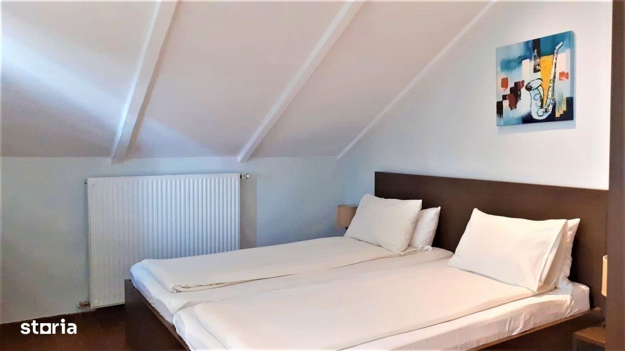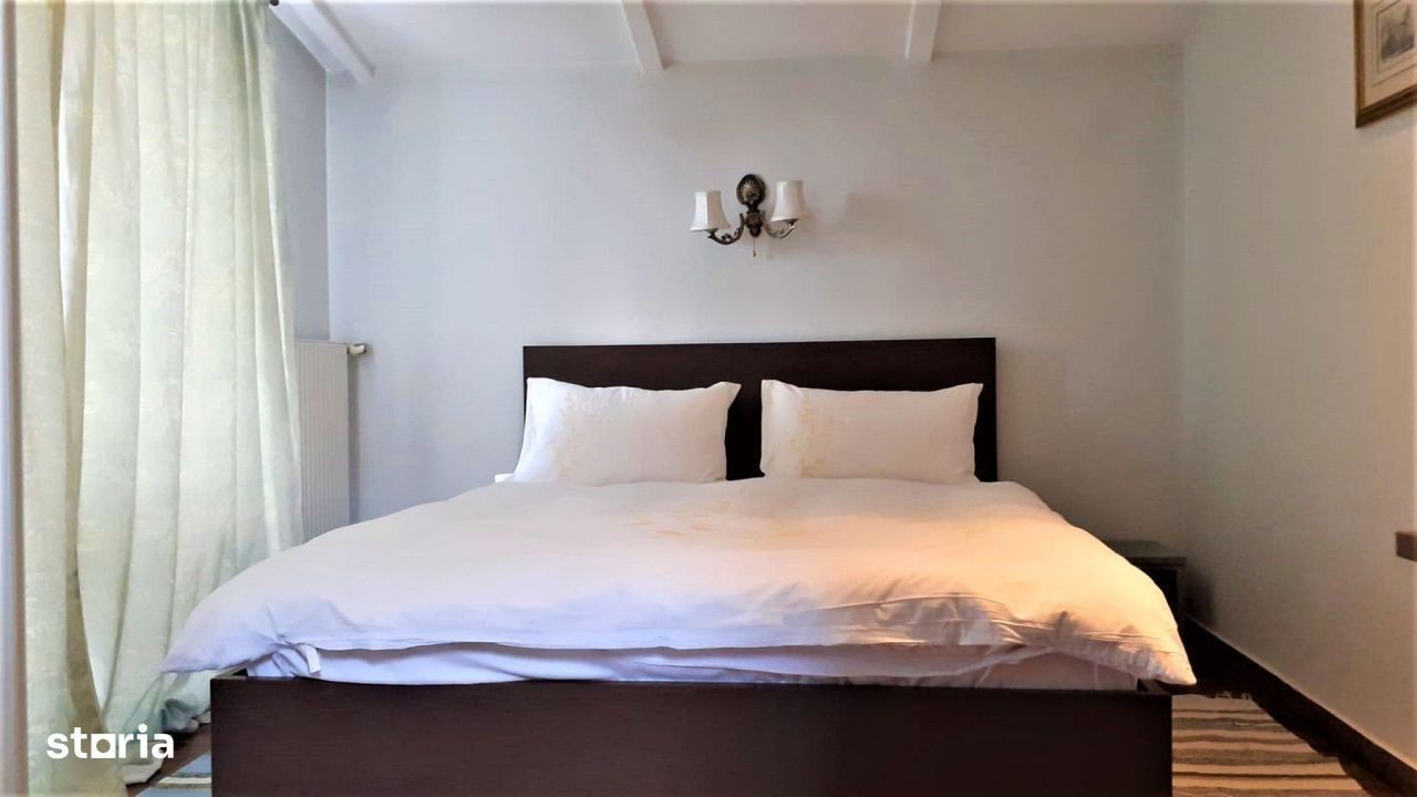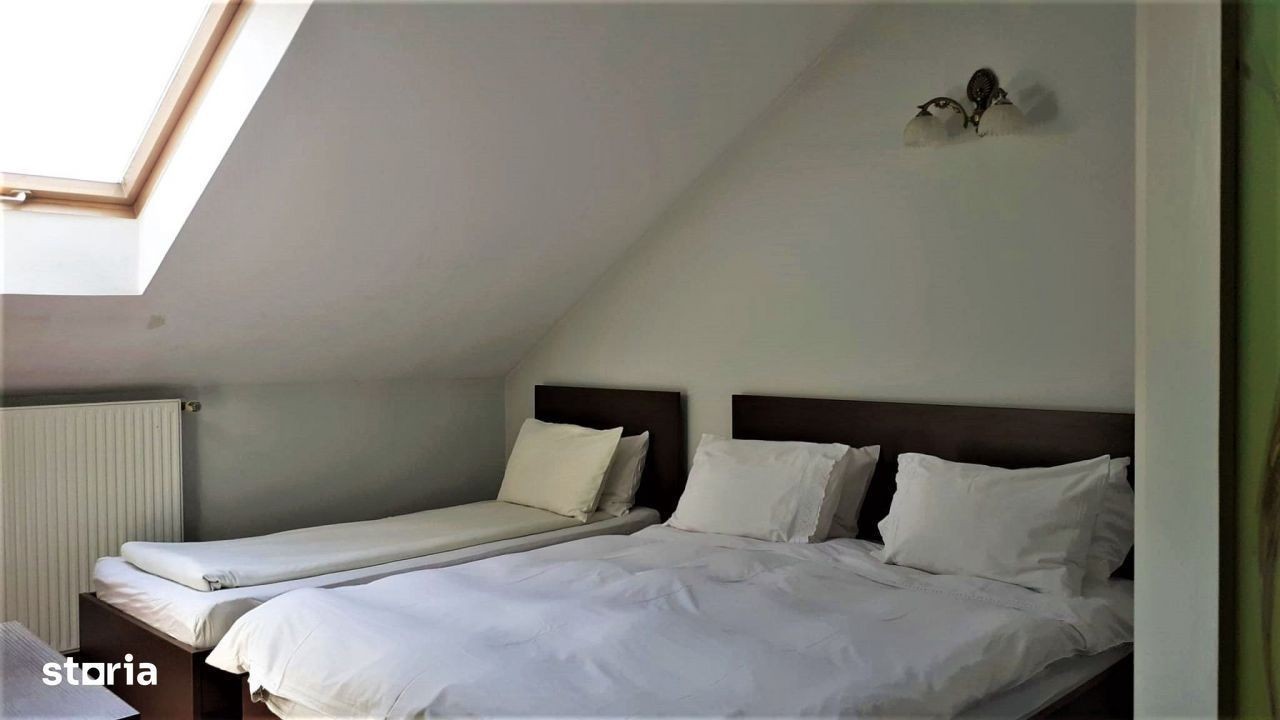 Proprietatea propusa spre achizitionare este situata in Cristian, cu multiple puncte de interes: scoala, gradinita, statie autobuz. Imobilul este situat la aproximativ 9 km distanta fata de orașul Brașov, la 20 km de Poiana Brașov si statiunea turistica Bran. Casa este de structurata P+E si beneficiaza de o gradina amenajata cu gazon si flori. Zona de zi aflata la parterul imobilului are in componenta: living spatios, bucatarie decomandata cu acces pe terasa generoasa (25 mp), hol si baie. Zona de noapte se afla la etaj si dispune de 5 dormitoare (unul dinre dormitoare cu acces la terasa), fiecare dormitor fiind dotat cu baie proprie ( unadintre bai este dotata cu jacuzzi). Proprietatea dispune de toate imbunatatirile : incalzire prin pardoseala ( la parter), gresie portelanata, izolatie termica de 5-10 cm (la exterior), grinzi de beton, centrala proprie. Imobilul se vinde complet mobilat si utilat cu electrocasnice: aragaz, frigider, hota, masina de spalat rufe, uscator, TV.