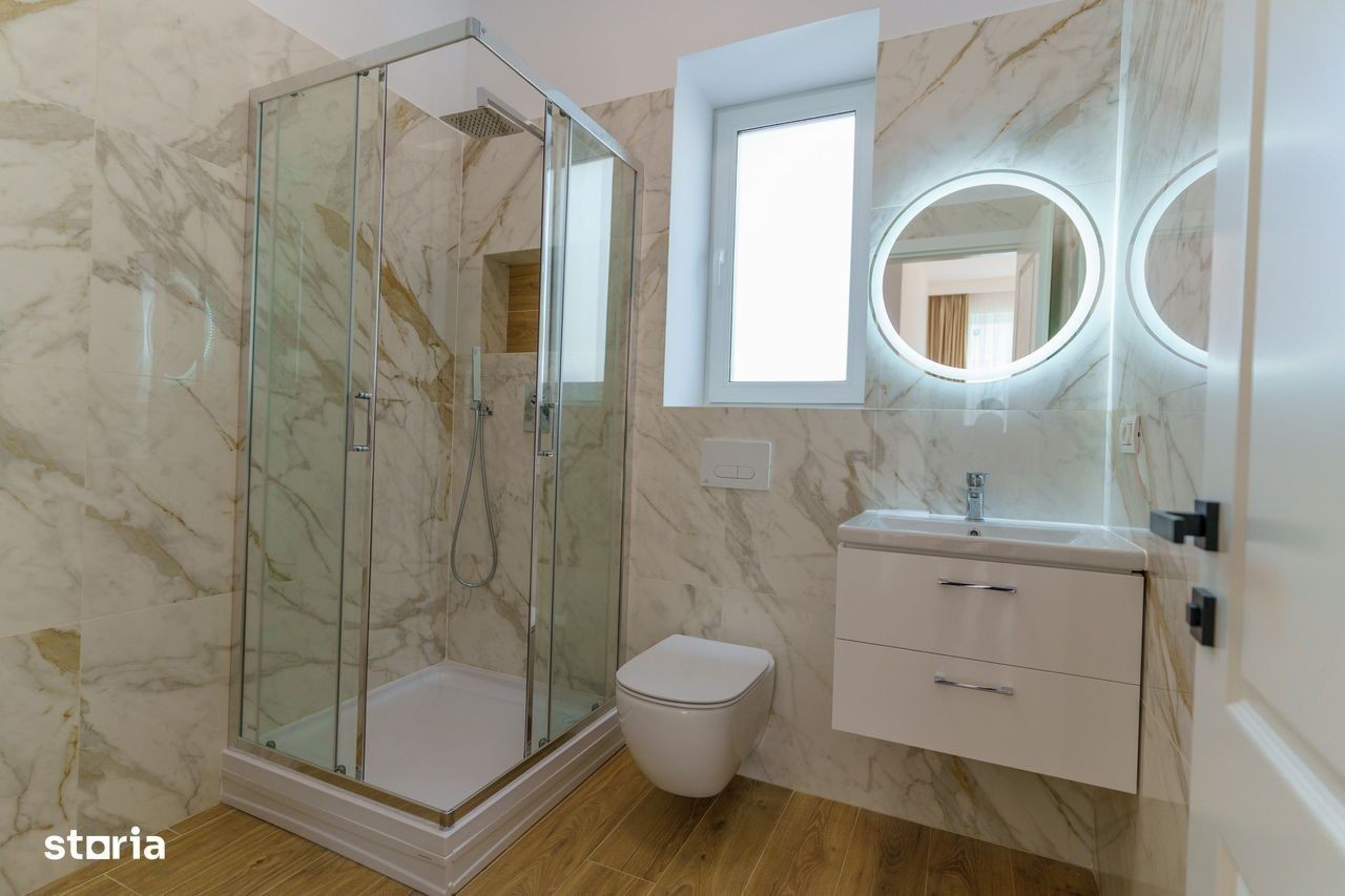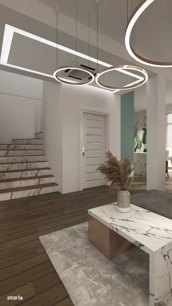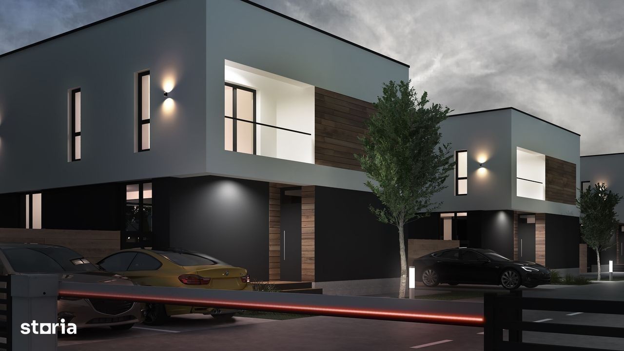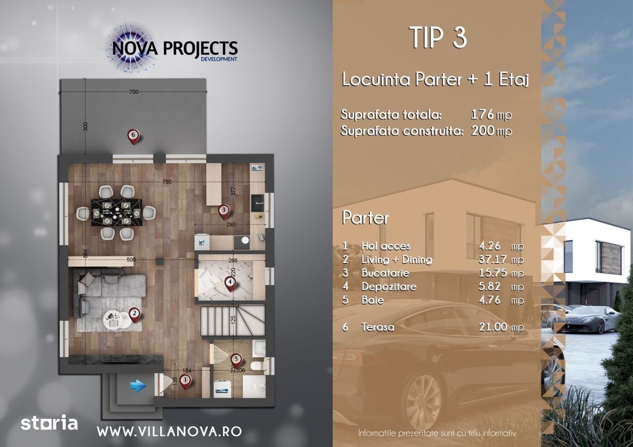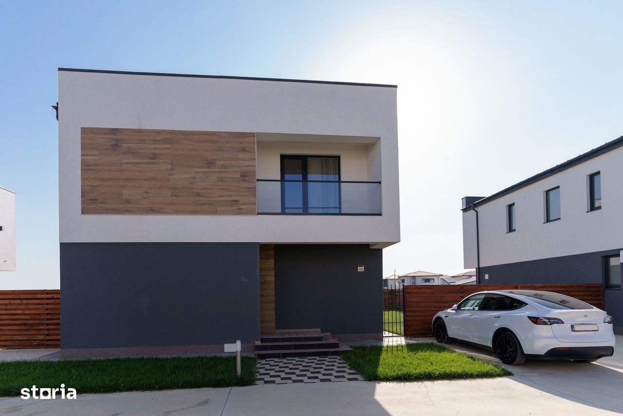 Pret promotional 314.000 Euro + TVA Villa Nova Residence, cu cel mai nou proiect de case individuale tip P+1, aduce un concept imobiliar autentic prin calitatea constructiei, finisajele premium si elementele de lux, designul ales si tehnologiile de ultima generatie (ventilatie cu recuperare energie HVAC, panouri fotovoltaice, pompa de caldura aer-apa, ventiloconvectoare), ce permit amenajarea unor locuinte moderne si eficiente energetic. Ne dorim sa oferim casa mult visata, un adevarat refugiu elegant si confortabil, intr-un cuvant: acasa, unde povestea ta incepe. Casele cu etaj Villa Nova se afla la 5 minute de Otopeni, in localitatea Tunari pe str. Nordului, unul dintre cele mai conectate locuri cu zona de nord a Bucurestiului. Este o zona cu acces usor catre aeroport și oras prin patru cai principale: Bd. Pipera, A3, DN1 si A0 (in curand), fiind aproape de centre comerciale importante (Baneasa Shopping City, IKEA, Mall Corbeanca etc.), gradinite, scoli private si de stat, zone de distractie si agrement (Western Dream - Club de Echitatie, Edenland, Therme, Gradina Zoologica) si de mijloace de transport in comun. In complex sunt cinci ansambluri de tip gated community a cate 8 case individuale cu etaj, primele trei deja locuite, iar urmatoarele doua, unul in curand finalizat, respectiv cel de-al doilea in stadiu de constructie, ambele disponibile la vanzare. In cadrul fiecarui ansamblu casele sunt dispuse 4 pe stanga și 4 pe dreapta, astfel incat sa rezulte spatii compacte verzi si de recreere, cu drum de acces privat si intrare in stil englezesc, fara trafic prin fata caselor, pentru siguranta si intimitatea unei comunitati restranse. Construite dupa norme nZEB (nearly Zero-Energy Building), casele sunt concepute pentru a fi independente energetic, cu costuri de intretinere aproape zero! Sunt dotate cu sistem integrat de incalzire si racire prin pardoseala conectat la pompa de caldura aer-apa, solutie SMART de climatizare cu ventiloconvectoare, panouri fotovoltaice instalate, au pregatita infrastructura trifazica pentru incarcarea a doua masini electrice, tehnologii avansate care optimizeaza cheltuielile cu intretinerea lunara si asigura un plus de calitate, sanatate si confort ca beneficii suplimentare in comparatie cu o locuinta standard. Ca noutate, casele Villa Nova sunt echipate si cu sistem centralizat de ventilatie HVAC ( Heating, Ventilation, Air conditioning ) cu recuperare de caldura si aport de aer proaspat, cu filtre pentru polen, praf si microparticule poluante, care asigura imbunatatirea semnificativa atat a calitatii si umiditatii aerului in interiorul locuintei, cat si a eficientei energetice. Si fiindca suntem pasionati de tehnologie, sistemul Smart Home pune in controlul tau o locuinta inteligenta! Arhitectura cladirii ofera unicitate locuintei prin designul modern, ce imbina armonios aspectele estetice cu cele tehnice si functionale totodata. Cu interioare spatioase și bine compartimentate, living și 3 dormitoare, camera tehnica si camera pentru dressing, cu terasa si gradina generoase, casele se disting prin stil si eleganta. Valori constructive: Suprafata construita 206 mp Suprafata totala 171 mp Suprafata utila totala 151 mp Suprafata teren 407 mp Casele tip P+1 se predau complet finisate: sistem centralizat de ventilatie HVAC, pompa de caldura aer-apa, panouri fotovoltaice, ventiloconvectoare, sistem Smart Home integrat, termostate de reglare a temperaturii pe fiecare zona individual, tamplarie termoizolanta cu sistem de microventilatie si suprafete vitrate tripan cu protectie UV, tigla metalica de la Wetterbest, bai amenajate, gresie si faianta calitate premium, parchet special pentru incalzirea prin pardoseala tip SPC, usi de interior si exterior Pinum Doors & Windows. Ne dorim sa oferim calitatea premium si stilul de viața confortabil la un pret echitabil, o investitie sigura si bine plasata intr-un proiect care redefineste standardele pentru comunitate, pregatit pentru viitor. Pentru mai multe detalii si programare vizionare, contactati-ne! Tel.