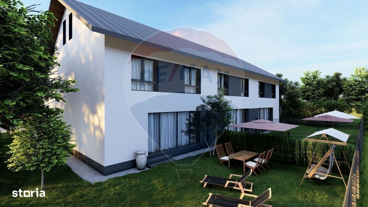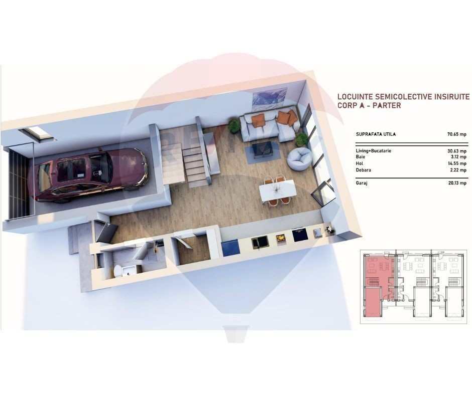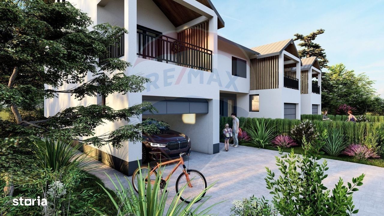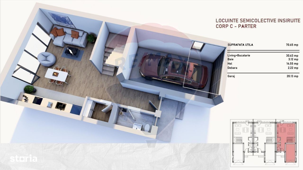 Corpul B Teren: 204 mp Suprafață utilă: 145,12 mp Parterul include: Acces cu gresie antiderapantă Hol + scară finisate cu gresie, pentru acces facil între etaje Grup sanitar cu gresie, asigurând confortul zilnic Debara finisată cu gresie - spațiu ideal pentru depozitare Living + bucătărie open space, ce oferă un ambient luminos și primitor Garaj cu acces direct, finisat cu gresie antiderapantă pentru siguranță Etajul include: Hol finisat cu gresie Două băi finisate cu gresie 3 dormitoare spațioase Terasa acoperită, perfectă pentru relaxare Aceste locuințe sunt ideale pentru cei care își doresc o combinație de modernitate și intimitate, într-un cadru rezidențial bine gândit. Poziționarea strategică a ansamblului în Brașov oferă acces rapid la principalele rute de transport naționale și europene, fiind ideală atât pentru familii, cât și pentru cei care apreciază un stil de viață urban și conectat.