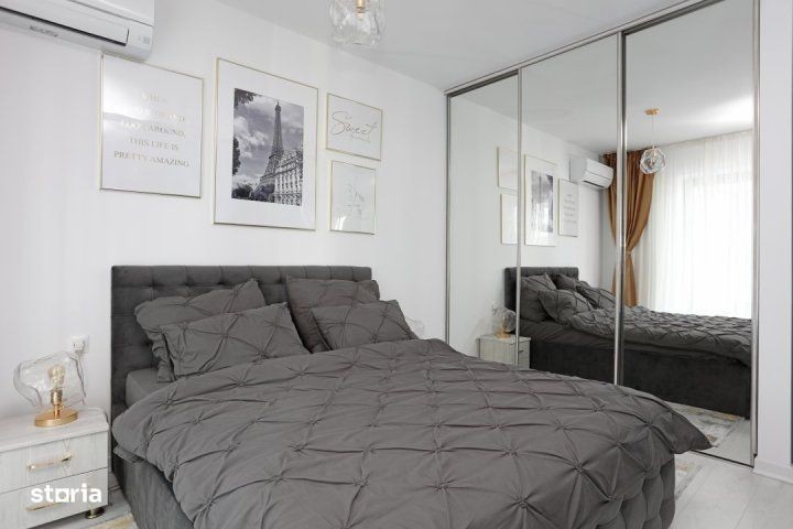 Apartament nou de lux complet mobilat si utiliat, cu parcare subterana inclusa, la prima inchiriere in Cloud 9 - Sos. Pipera, aflat in apropierea statiei de metrou Aurel Vlaicu, Promenada Mall si intreaga zona de cladiri de birouri din Pipera. Apartamentul este spatios, comfortabil si linistit, cu balcon acoperit si luminat cu doua iesiri, sistem de incalzire centralizat cu programare si reglare wireless a temperaturii pentru fiecare camera, lumina calda de tip LED si pereti din sticla. Bucataria este complet mobilata cu o multitudine de spatii de depozitare si utilata cu electrocasnice noi incorporate (combina frigorifica si masina de spalat vase Bosch, plita si cuptor electric Beko, cuptor cu microunde Samsung). Pe langa farfurii, tacamuri, pahare, oale speciale pentru inductie si altele - toate noi, bucataria are insula cu doua locuri de luat masa si expresor, fierbator si toaster incluse. Living-ul are canapea confortabila extensibila din catifea pentru 3 persoane si televizor Samsung 4K de 138 cm. Dormitorul beneficiaza de pat matrimonial de 180x200 cm din catifea (cu doua seturi de perne si lenjerii de pat de lux), noptiere cu veioze, aer conditionat si dresing multicompartimentat cu usi glisante silentioase si oglinzi din podea in tavan. Apartamentul beneficiaza de masina de spalat cu uscator, aspiratoare Karcher si robot amXea, purificator de aer, feon, masina de calcat si altele, dar si cablu TV, internet, Netflix si Disney incluse. Apartamentul are o suprafata de 50 mp si se afla la etajul 2 din 11, cu loc de parcare subteran la -2 cu access prin telecomanda. Scara are 2 lifturi Kone si beneficiaza de monitorizare video si paza non-stop. Luxury New Apartment for Rent - Fully Furnished and Equipped, with Underground Parking - First Rental in Cloud 9, Pipera (Sos. Pipera) This stunning, spacious, and quiet apartment is available for its first rental. Located in Cloud 9, just a short walk from the Aurel Vlaicu metro station, Promenada Mall, and the bustling Pipera business district, it's perfect for professionals and families alike. The apartment features a covered, illuminated balcony with two exits, central heating with wireless temperature control for each room, and warm LED lighting. The design incorporates glass walls, offering a sleek, modern aesthetic. The fully furnished kitchen comes with ample storage and brand-new, built-in appliances, including a Bosch fridge-freezer and dishwasher, Beko electric stove and oven, and Samsung microwave. You'll also find all the essentials, from plates and cutlery to induction-ready cookware. A breakfast island with seating for two, along with a coffee machine, kettle, and toaster, are included for your convenience. The living room boasts a comfortable velvet sofa that converts into a bed, perfect for lounging or hosting, alongside a 138 cm Samsung 4K TV. The bedroom offers a luxurious 180x200 cm velvet bed (complete with two sets of premium pillows and linens), nightstands with lamps, air conditioning, and a spacious wardrobe with silent sliding doors and full-length mirrors. The apartment also includes a Samsung washer-dryer, Karcher vacuum, amXea robot vacuum, air purifier, hairdryer, iron, and more. Cable TV, high-speed internet, Netflix and Disney are also provided. With a total area of 50 sqm, the apartment is located on the 2nd floor of an 11-story building. The underground parking space, located on level -2, is easily accessible via remote control. The building is equipped with two Kone elevators, 24/7 video surveillance, and security. Don't miss the opportunity to rent this premium, move-in ready apartment!