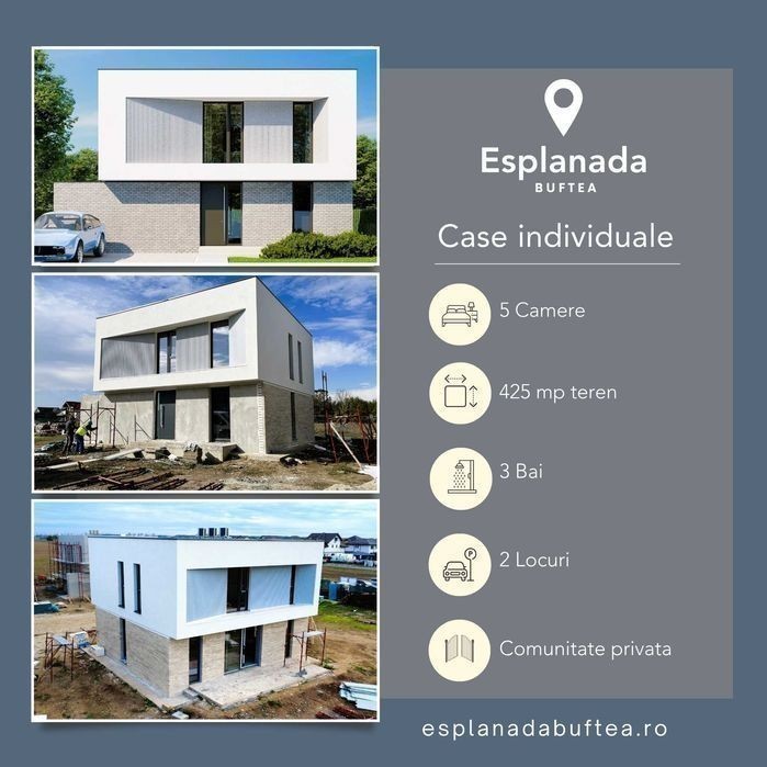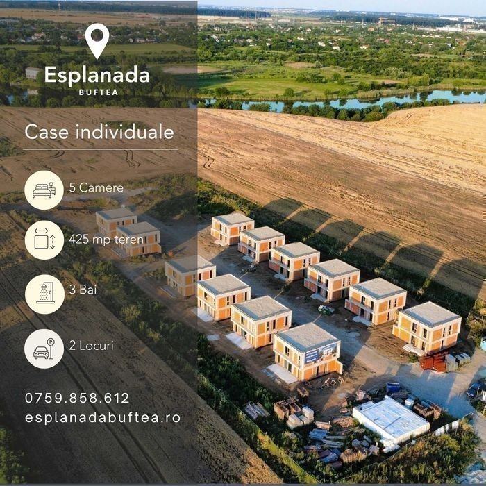 Informații generale proiect Esplanada Buftea Situat în orașul Buftea intre strada Independentei și lacul Buciumeni, cartierul Esplanada se desfășoară pe o suprafață totală de 117,000 de mp si va include locuințe individuale p+1 si p+2 cu loturi ample si grădini generoase, oferind spațiul personal de care ai nevoie acasă, într-un cadru liniștit pentru relaxare si joaca.