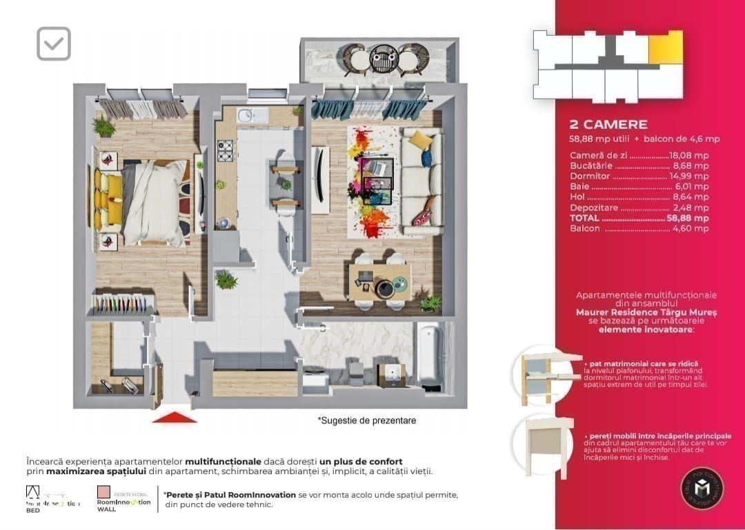 Va oferim spre vanzare un aprtament cu 2 cam in bloc nou la cheie,intro noua zona rezidentiala Maurer Residence. Apartamentul va fi compartimentat astfel hol,camera de zi cu bucatarie open space,1 dormitoar,1 baie, debara si un balcon 4,60 mp.