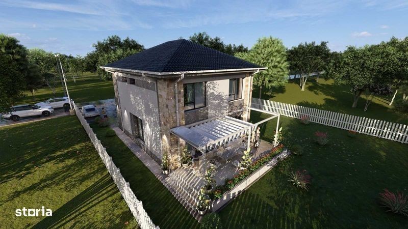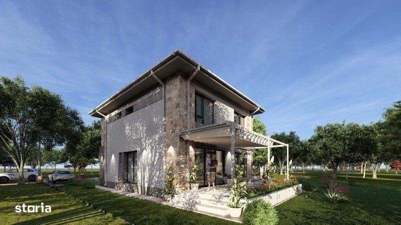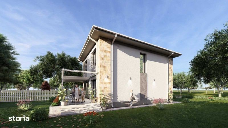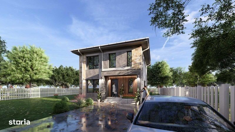 Proiect compus din doua locuinte,P+1E,avand arhitectura similara,cu mici accente de culoare si placari de piatra.Cele doua proprietati sunt situate fata in fata,de o parte si de alta a drumului. Casele se vor preda complet finalizate,cu finisaje alese de designer,curtile nivelate pregatite pentru insamintare si sistem de irigare automatizat,zona de parcare si terase. Suprafata construita este de 187 mp,amprenta la sol de 95 mp,suprafata teren de 704 mp. Toate utilitatile vor fi functionale si individuale pentru fiecare unitate in parte,apa si canalizare,gaz si curent electric. Compartimentare interioara: PARTER:living-dinning 25,88 mp,bucatarie deschisa/inchisa 11,88 mp,camera tehnica 3,45mp,birou 13,63 mp, baie cu cabina de dus 3,68 mp,hol 5,44mp,spatiu de depozitare sub scara si o terasa acoperita la cerere de 25,36 mp. ETAJ:dormitor matrimonial 17,97 mp cu dressing de 5,01 mp si baie (cu cada) de 6,19 mp;doua dormitoare de 15,12 mp respectiv 11,88 mp,o baie pe hol (cu cabina dus) de 4,51 mp,hol 5,13 mp Living & Dinning Pardoseala va fi din parchet laminat de 12 mm,folie speciala pentru incalzirea in pardoseala. Peretii tencuiti si zugraviti cu vopsea lavabila alba; Tavanul din dala beton de 18 cm si izolat cu rigips pe structura metalica, gletuit si zugravit cu vopsea lavabila alba; Cablare TV/internet. Bucatarie Pardoseala va fi din parchet laminat de 12 mm,folie speciala pentru incalzirea in pardoseala,plinta in culoare/ alba; Alte dotari prevazute:priza si scurgere pentru masina de spalat vase,racorduri pentru chiuveta,aragaz/hota,cuptor,frigider/congelator. Camera tehnica Pardoseala din placi ceramice. Peretii zugraviti cu vopsea lavabila alba; Prize si scurgeri pentru masina de spalat rufe si uscator. Bai Pardoseala din gresie; Peretii placati cu faianta,toti sau partial,la inaltimea de 2 m; Tavanul izolat cu rigips rezistent la umezeala pe structura metalica,gletuit si zugravit cu vopsea lavabila alba; Baia de la parter si cea de pe hol etaj vor fi cu cabine de dus,iar cea matrimoniala cu cada si baterie freestanding,mobilier,oglinzi,Wc-uri cu mecanism incastrat; Prize pentru uscator,aparat de ras. Scara interioara va fi placata cu un parchet special. Dormitoare Pardoseala va fi din parchet laminat de 12 mm,folie speciala pentru incalzirea in pardoseala,plinta in culoare / alba; Peretii tencuiti,gletuiti si zugraviti cu vopsea lavabila alba; Tavanul izolat cu rigips pe structura metalica,gletuit si zugravit cu vopsea lavabila alba; Cablare TV/internet in toate camerele Terasa intrarea in casa Terasa laterala de 25,36mp,neacoperita,din pavaj Priza si TV/internet pe terasa; Intrarea in casa va fi placata cu travertin. Usi Porta Doors sau similar de culoare alba Constructia este executata pe fundatii continue din beton armat,structura cu stalpi,grinzi si planseu armat peste parter de 18 cm grosime.Fundatiile vor fi hidroizolate cu bitum pensular si apoi placate cu polistiren extrudat de 5 cm.Zidaria nu este portanta si este executata din blocuri ceramice de 30cm. Invelitoarea este din tigla metalica BILKA.Sarpanta este din lemn. Fatada executata cu tencuiala decorativa, cu mici accente din piatra.Izolatia la exterior va fi realizata cu polistiren grafitat EPS80 de 10cm.Scara de la intrare finisata cu placari din granit sau travertin.Tamplaria este din PVC marca Salamander,cu geam tripan si feronerie MACO MM Titan.Glafurile interioare executate din marmura.Glafurile la exterior din tabla.La intrarea principala usa metalica produsa de Tracia. Instalatia de incalzire interioara a locuintei realizata din PEX+PPR.Casa are incalzire in pardoseala pe intreaga suprafata cu un termostat WIFI de reglare a temperaturii si preechipare pentru senzorii de reglare a temperaturii in fiecare camera. Instalatia interioara de apa rece din PEX+PPR.Traseele pentru instalatia interioara de apa rece alese astfel incat sa asigure accesul in timpul exploatarii.Alimentarea cu apa calda se realizeaza prin conducta de distributie,prin centala termica in condensatie de 24 kw. Instalatia electrica este realizata din cupru pe toate incaperile su