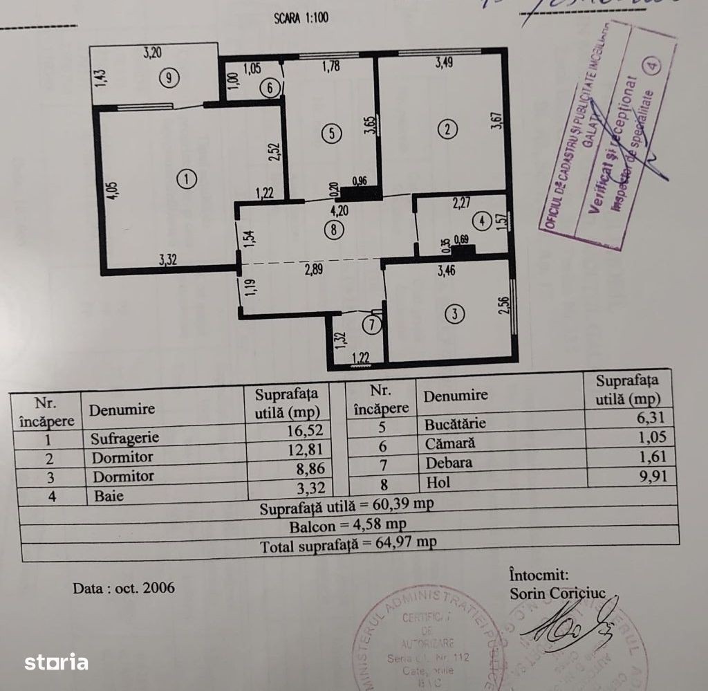 Apartament 3 cam decomandat, stradal (balcon Spațiu comercial în acte)