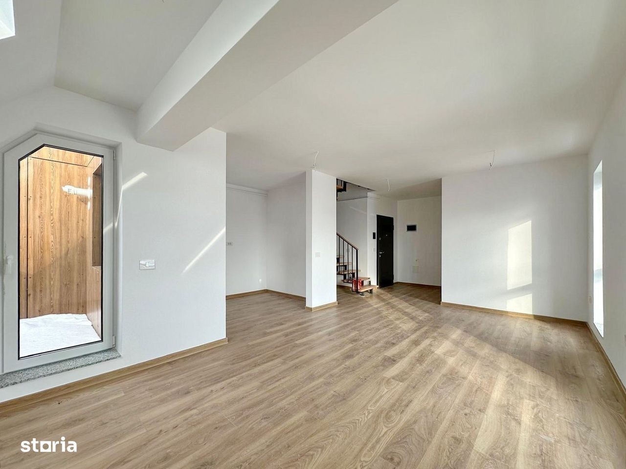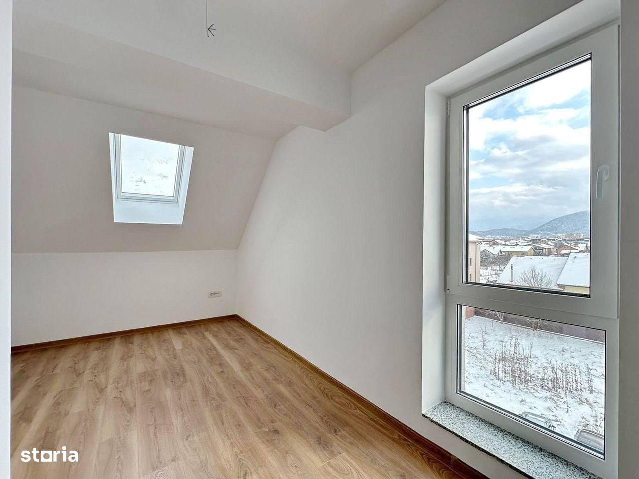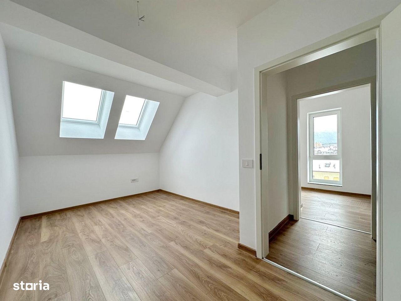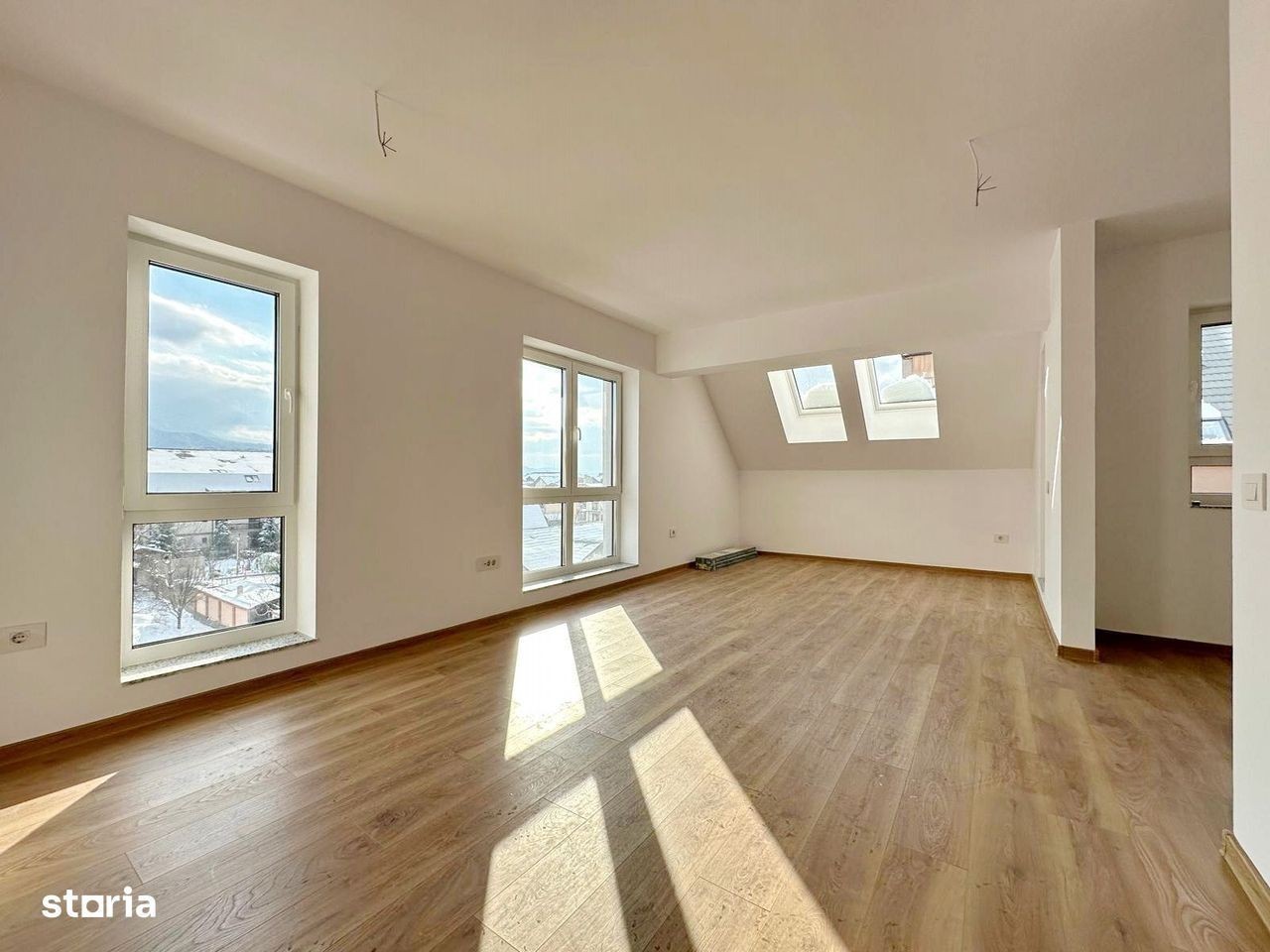 Proprietatea propusă spre achiziționare este situată în apropierea centrului comercial Coresi, într-o zonă cu acces facil către multiple puncte de interes. Locuința este dispusă pe ultimele două niveluri ale clădirii și oferă o suprafață utilă de 91 mp, la care se adaugă un pod generos de 26 mp. Zona de zi include un living spațios cu zonă de dining și bucătărie deschisă, un balcon, un spațiu de depozitare sub scară și o baie ce deservește acest nivel. La etaj se află trei dormitoare luminoase, un hol și o baie, iar din hol se poate accesa podul individual al apartamentului, care oferă posibilitatea de amenajare a unei încăperi suplimentare, în funcție de necesități. Apartamentul se vinde la cheie, conform prezentării, iar în prețul afișat este inclusă și o boxă pentru depozitare la subsolul clădirii. Opțional, se poate achiziționa și un loc de parcare subteran, la prețul de 15.000 euro + TVA. *La pretul afisat se adauga TVA 19%.