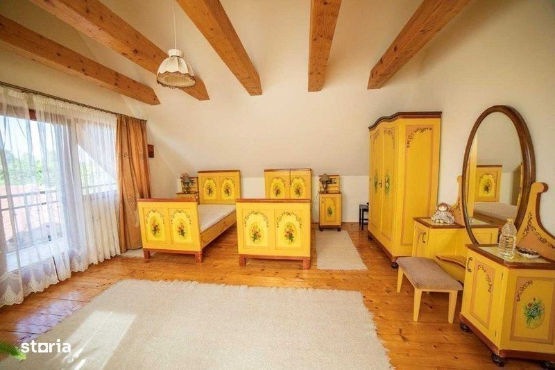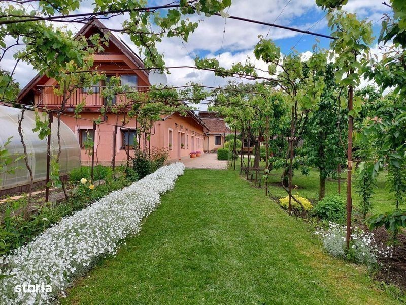 Proprietatea se afla pe cea mai buna strada din Sanpetru si este desfasurata pe 1960 mp., avand toate utilitatile. Este compusa din 2 corpuri de cladire de 257 mp, suprafata utila (309 mp suprafata desfasurata) si 134 mp suprafata utila (160 mp, suprafata desfasurata) + beci (67 mp), la care se mai pot aduga: foisorul (29mp), garaj (30mp), atelier (24mp), sopron, sera, etc. Proprietatea este pe strada asfaltata, linistita, nu se mai construieste impreur, cu vedere inspre Tampa, Postavarul, Bucegi, Piatra Craiului, Fagaras, Dealul Lempes. Cladirea 1: Este compusa din urmatoarele: la parter hol 1 intrare, baie cu cabina dus, wc, bideu, bucatarie, sufragerie, living, dormitor 1; scara interioara spre mansarda, 3 intrari-iesiri independente din-spre curte. Suparafata parter, aprox. 130 mp. La mansarda: scara interioara, hol 2, dormitor 2 cu balcon, dressing, hol 3, baie cu cabina dus, wc, bideu si jacuzzi, dormitor 3, (actualmente birou) si dormitor matrimonial 4. Suprafata mansardei este de inca 130 mp. Total cladirea 1 - 257 m.p. + balcon 10 mp Finisarile sunt de categoria lux, gresie, faianta, Italia, Spania, parchet triplu stratificat (nu laminat), lemn cires, sistem performant de monitorizare - video de la distanta, sistem alarma, televiziune si internet prin fibra optica de la 2 furnizori etc. Are izolatii termice exterioare de 10 cm, pereti exteriori grosi de aprox. 50 cm, acoperisul are izolatie cu spuma poliuretanica in strat de 5 cm. la interior pe astereala, urmata de 30 cm. vata minerala, folii, rigips, etc. Usile, ferestrele sunt din lemn stratificat, termopan, iar la mansarda sunt ferestre Fakro din lemnn stratificat. Am poze de la toate fazele renovarilor. Casa este in cea mai mare parte independenta energetic, avand montate panouri fotovoltaice solare, 7 KW/h, care produc aproximativ de 3 ori mai mult curent decat se consuma, 4 panouri solare pentru apa calda menajera, boiler apa calda menajera 200 l., centrala incalzire si apa calda in condensare pe gaz metan, termosemineu pe lemne care este de fapt tot o centrala care produce caldura in calorifere si apa calda, instalatie electrica 220 si 380V., fantana cu pompa pentru alimentarea cu apa a curtii, serei si gradinii. Proprietatea este legata la reteaua electrica, de gaz, de apa si canalizare a comunei. Performanta energetica ridicata, A +, A Cladirea 2: In stil sasesc, compusa din veranda, hol, baie, cu wc, bideu, cada, living mare cu bucatarie mobilata, utilata, open space, aprox. 70 mp., cu parchet din pluta naturala, geamuri termopan, un dormitor cu tavan casetat din lemn, grinzi originale inscriptionate 1837, reconditionate, in stare excelenta, fara carii; centrala noua pe gaz. Beciul este de aprox. 67 mp. compus din 2 incaperi, in stil sasesc, cu bolta din caramida, care poate pastra in cele mai bune conditii peste 2000 l. de vin + muraturi, conserve, legume, alimente, etc. Casa necesita anumite renovari (se poate construi o mansarda peste suprafata podului de aprox. 140mp). Performanta energetica ridicata, B, B Curtea este foarte mare, cu gazon si pavele puse recent, lampi solare, instalatie de apa peste tot. In curte mai exista un foisor de aprox. 30 mp, o magazine/garaj, un atelier, inca o magazine scule pentru gradina, sopron acoperit pentru lemne, aprox. 20 mc., sera acoperita cu policarbonat de 24 mp., bolta cu vita de vie desfasurata pe 4 zone, din care anual se fac aprox. 200-250 l de vin. Mai avem gard viu minune, arbusti ornamentali, flori, etc. In gradina sunt aprox. 60 de pomi: meri, peri, visini, ciresi, pruni, caisi, piersici, gutui, de unde recoltam in jur de 300 - 400 kg de fructe, straturi pentru ceapa, usturoi, dovlecei, rosii, castraveti, mazare, fasole, morcovi, etc. Proprietatea se poate vinde si mobilata (contra cost separat), utilata cu tot ce trebuie, cu mobila stil si mobila noua, de calitate premium. Bucataria din cladirea 1 cu mobilier pe comanda din lemn masiv, la o renumita firma din Tg. Mures care lucreaza in principal pentru export Italia. Mobila de bucatarie, impreuna cu echipamentele aferente sunt in stare perfecta (plit