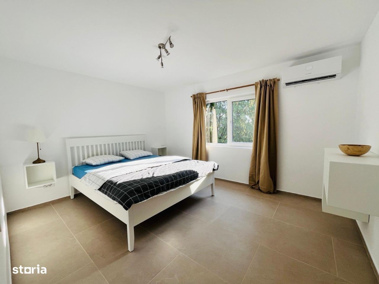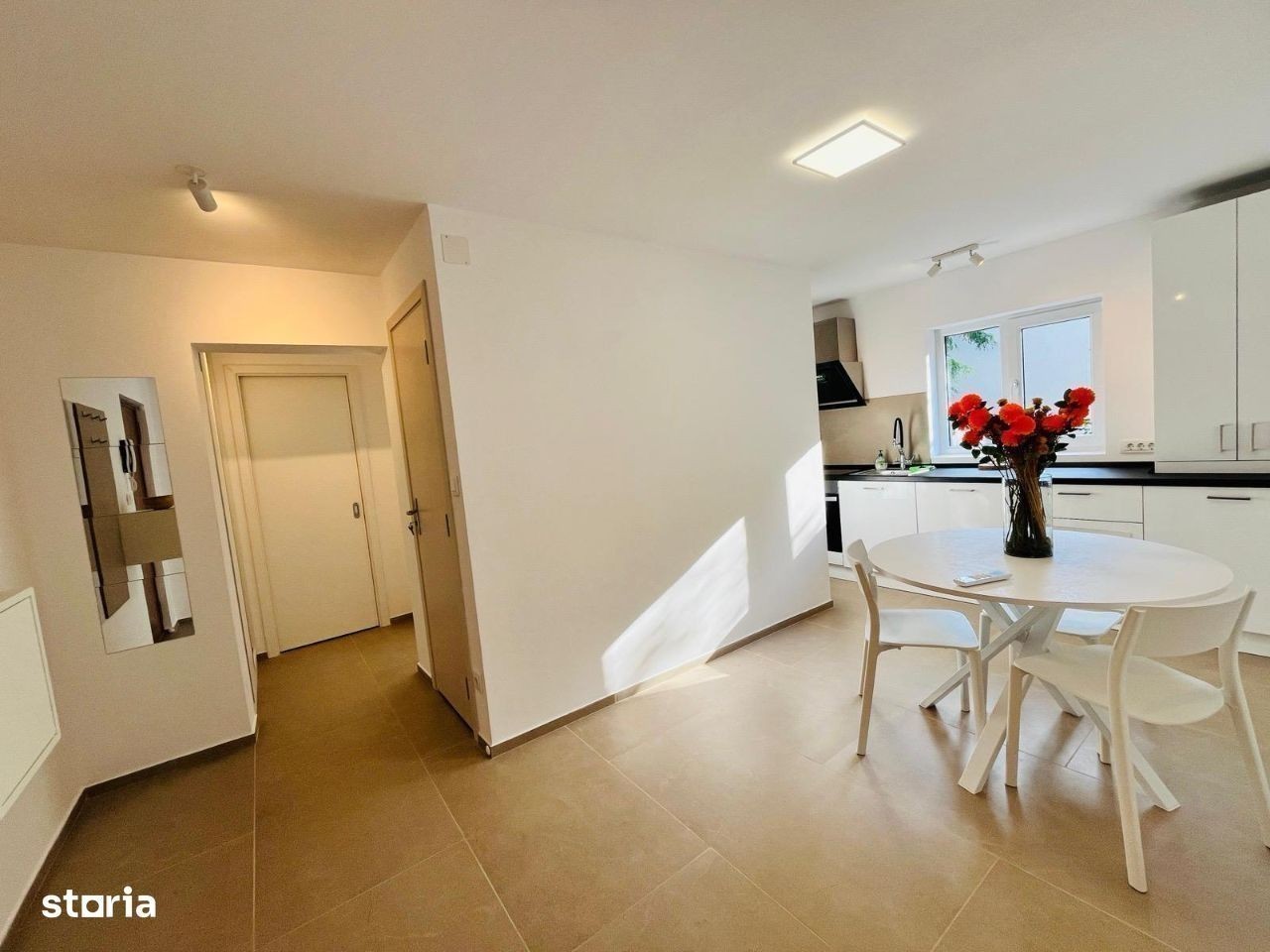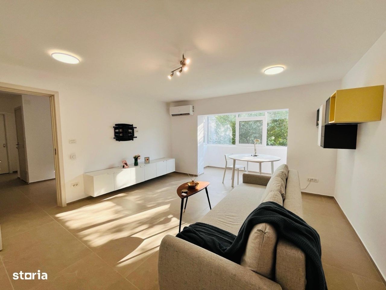 Apartament proaspăt renovat de înaltă calitate, cu pereți de rigips, geamuri termopan dublu canat, încălzire în pardoseală, complet mobilat cu mobilier nou și complet utilat cu electrocasnice noi și echipamente noi, cu o suprafață totală aproximativă de