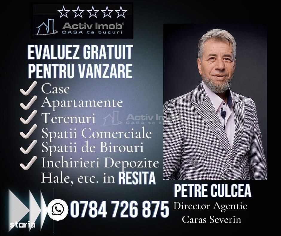 BENEFICII PENTRU CLIENTII ACESTEI OFERTE:Comision ZERO Chirias! Agentia Imobiliara Activ Imob Resita va ofera spre inchiriere 4 spatii, fiecare Open space unele chiar si cu terasa exterioara cu urmatoarele suprafete: - doua spatii de cca 230 mp. - un spatiu de cca 160 mp. - un spatiu de cca 300 mp.toate la pretul de 7 euro mp.cu usoare negocieri daca perioada de contract depaseste 3 ani,CONDITIA DE BAZA fiind de minim 2 ani.Fireste se poate inchiria si unul singur, functie de nevoi cu perioada de gratie de o luna de zile dupa semnarea contractului. Spatiile sunt amenajate intr-o singura constructie noua, aflate pe etaje diferite in Municipiul Resita,zona centrala din Govandari, in apropiere se regasesc blocuri de locuinte cu spatii comerciale la parter, diverse unitati comerciale si bancare etc. Transportul public este bine deservit, in imediata apropierea aflandu-se statiile de autobuz cu rute interne, precum si inter-judetene. Oferta de inchiriere se adreseaza investitorilor care doresc spatii de afaceri, birouri,etc; Toate spatiile au ferestre cu larga deschidere la lumina naturala, sunt uscate, nu sunt urme de infiltratii sau miros neplacut si sunt racordate la reteaua de apa, canalizare, curent 220w si 380 w,gaz.Incalzirea si apa calda asigurata de centrala termica pe curent. Spatiile pot fi inchiriate individual sau mai multe functie de nevoi pe o perioada de MINIM 2 ANI, insotite de documentatie, Extras de Carte Funciara, liber de sarcini, Certificat Fiscal fara datorii,NU SE PERCEPE TVA. Daca si dumneavoastra aveti o proprietate in Resita sau in Judetul Caras-Severin si doriti sa o vindeti sau inchiriati va rugam sa sunati la numerele de telefon- Petre Culcea,Broker Imobiliar: