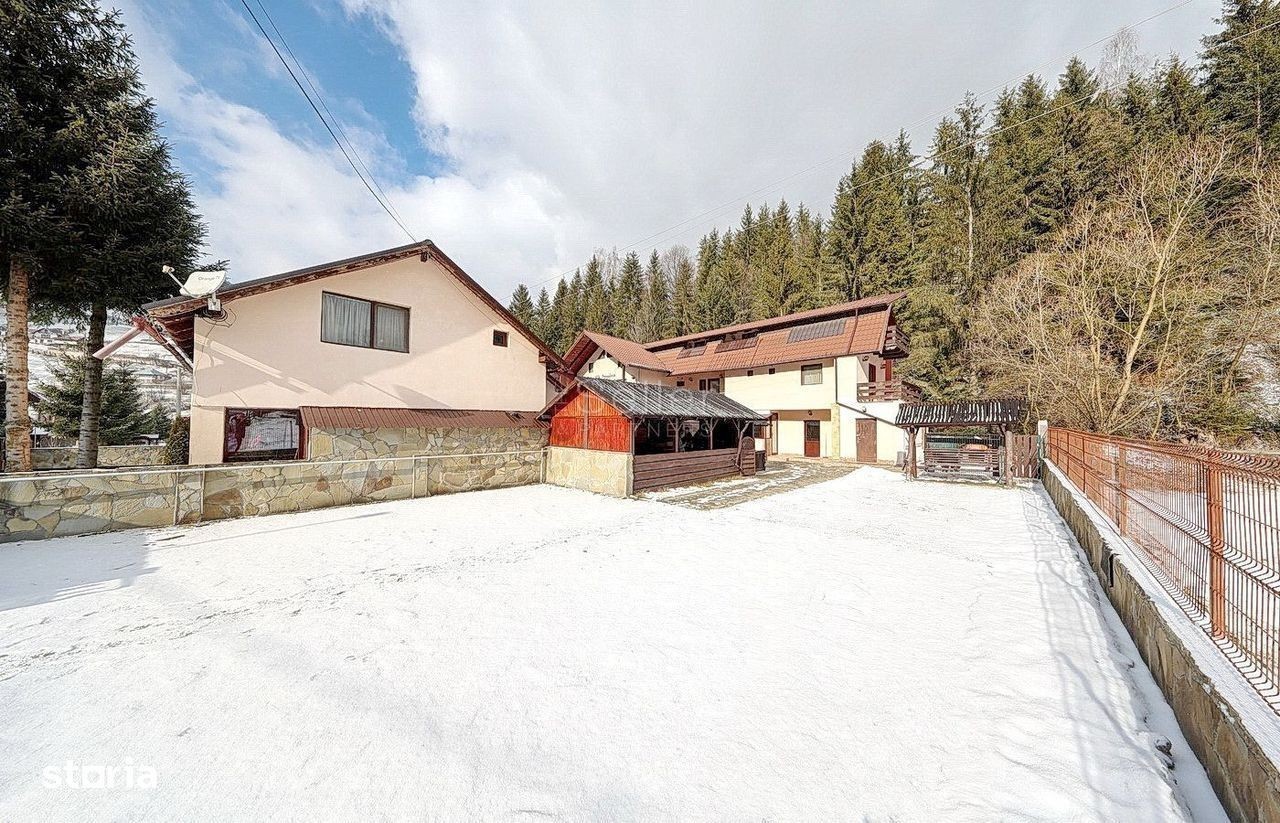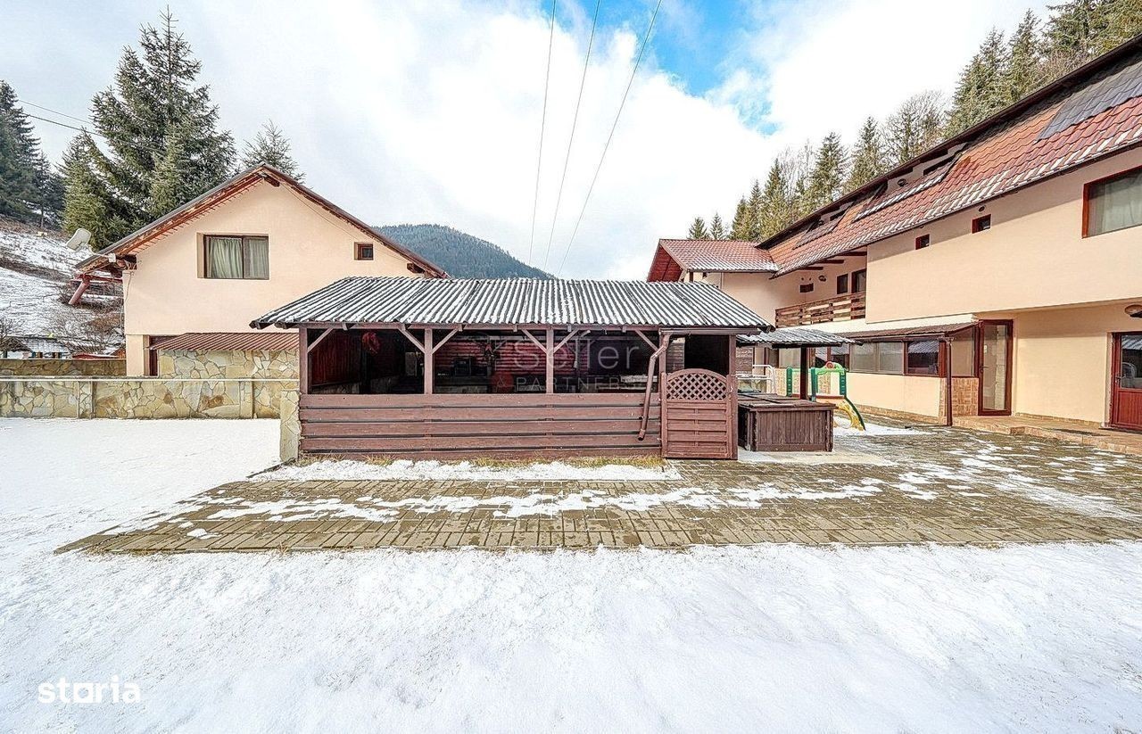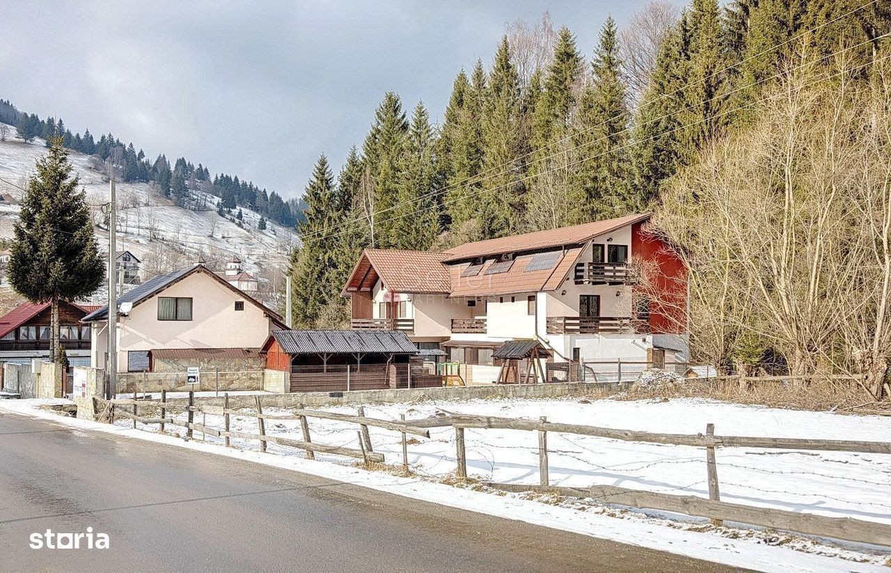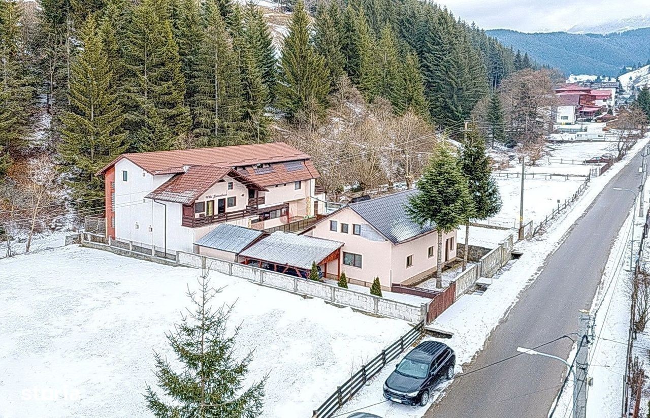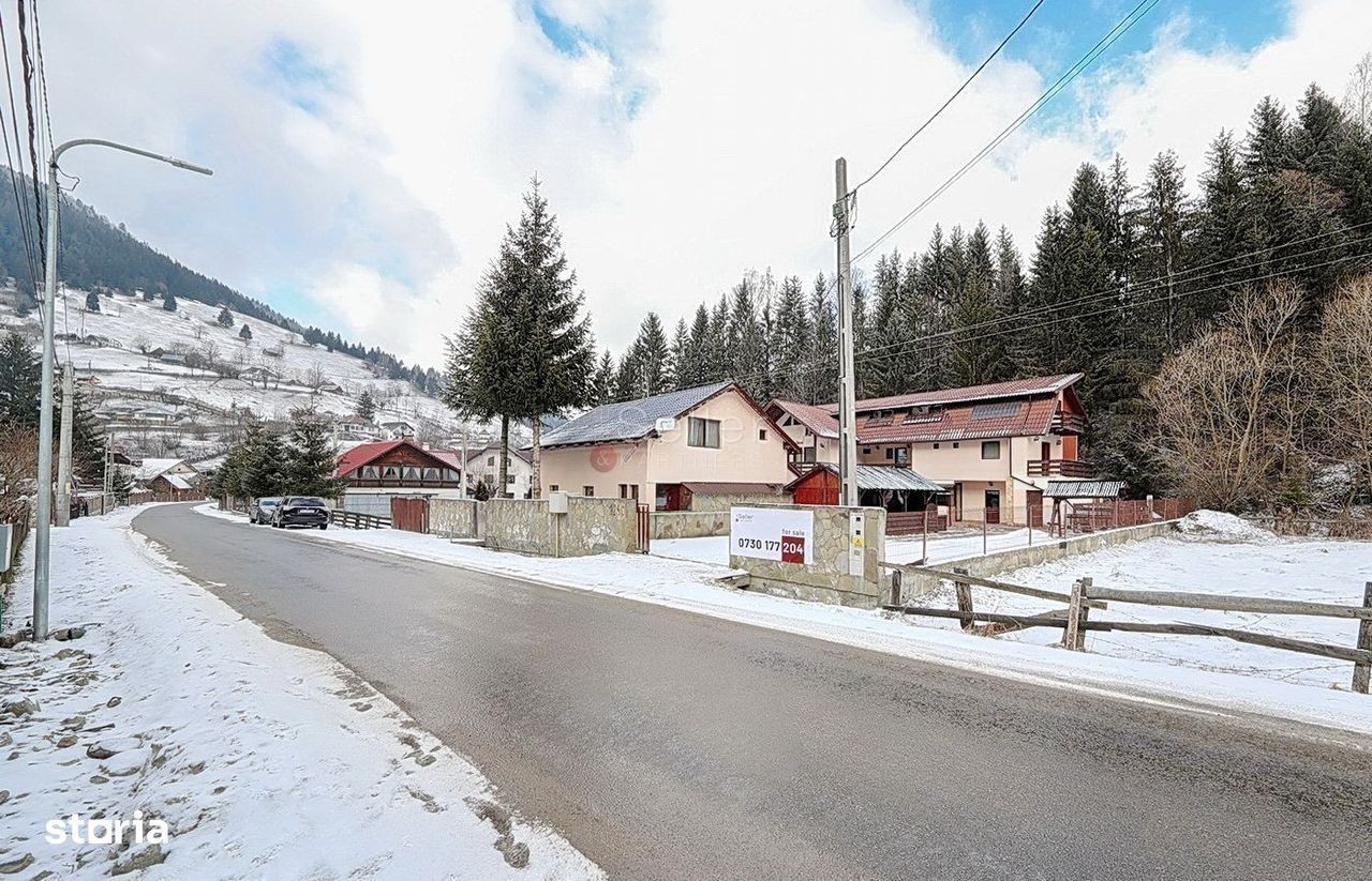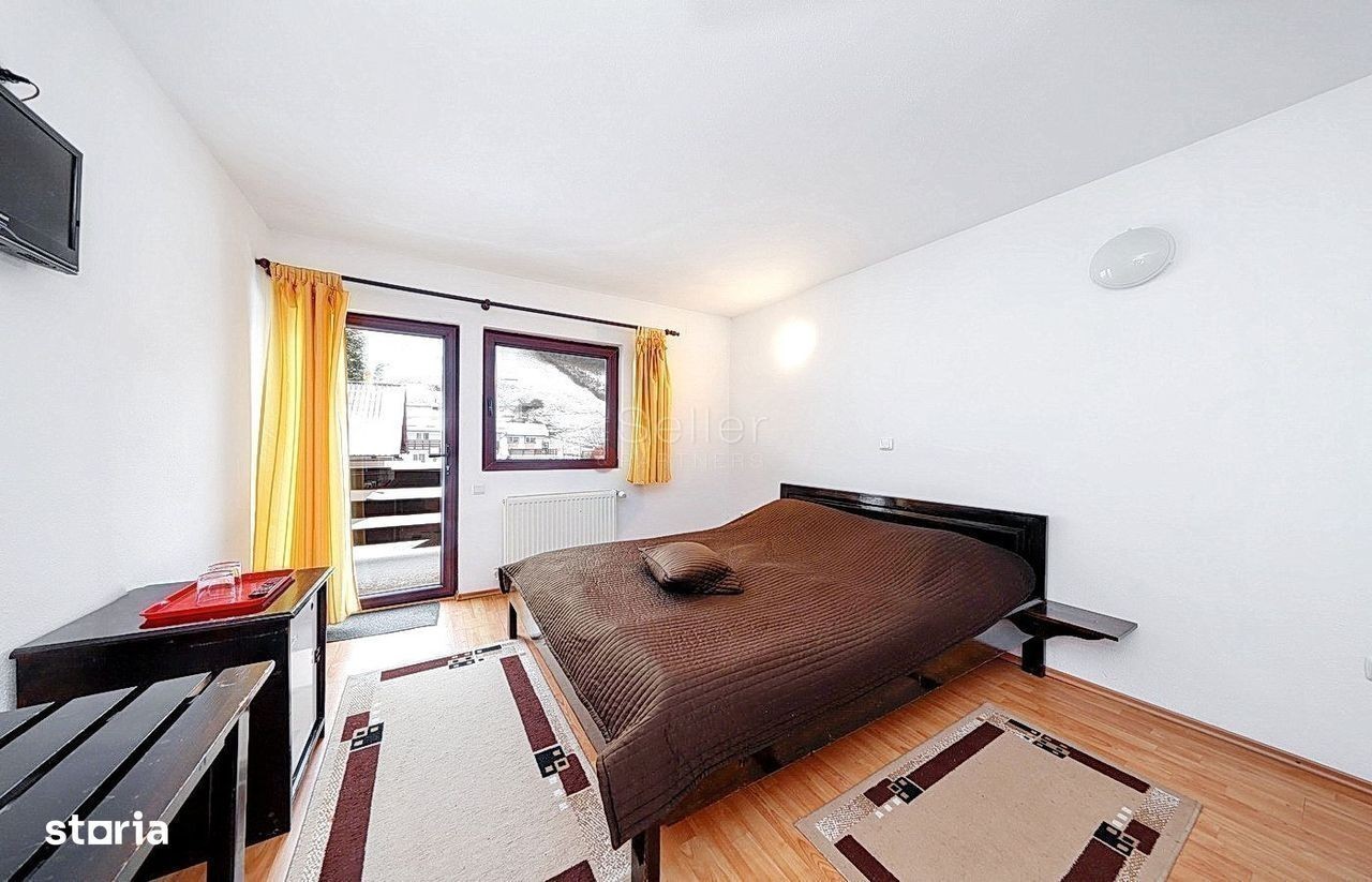 Ati accesat un imobil situat in zona Moieciu de Sus. LOCALIZARE: Proprietatea propusa este situata in Moieciu de Sus, in centrul localitatii, in imediata apropiere a Scolii Gimnaziale. Amplasata intr-o zonă montana deosebita, cu un rau ce curge prin spatele proprietatii, aceasta beneficiaza de peisaje spectaculoase si acces facil la atractii turistice locale. COMPARTIMENTARE: Dispusa pe un regim de inaltime P+1+M, proprietatea detine 12 incaperi, dintre care 9 camere duble, cu baie proprie si balcon, 1 apartament format din 2 camere, cu baie proprie, grup sanitar si balcon. Din punctul de vedere al compartimentarii, aceasta este dispusa astfel: PARTER: - holul, din care se face accesul catre incaperile de la parter si accesul la etaj; - terasa inchisa; - salonul, care este dotat cu o masa de biliard; - living-ul, cu o suprafata generoasa, dispune de acces la bucatarie si, totodata, de acces spre zona de barbeque; - 2 grupuri sanitare; ETAJ: - acest nivel este compus din 4 camere duble si 1 apartament cu doua incaperi, cu bai proprii si balcon, de unde se poate admira privelistea deosebita, spre munti si imprejurimi. MANSARDA: - patru dormitoare, fiecare avand baie proprie; - trei dintre aceste dormitoare detin acces la balcon; DOTARI: - 2 centralale termice, pe gaz; - tamplarie PVC; - acoperis din lemn, cu invelitoare din tabla; - terasa exterioara; - camera tehnica; - 8 locuri de parcare, in curte; - fosa ecologica; - foisor cu zona pentru barbeque. AVANTAJE: Potrivita pentru afaceri turistice, avand potential de venituri constante; Accesibilitate: Drumuri asfaltate; Investitie sigura: Zona montana in continua dezvoltare turistica, asigurand o apreciere constanta a valorii proprietatii. Tranzactionarea proprietatii se va face cu mobilierul aferent prezentei ofertari.