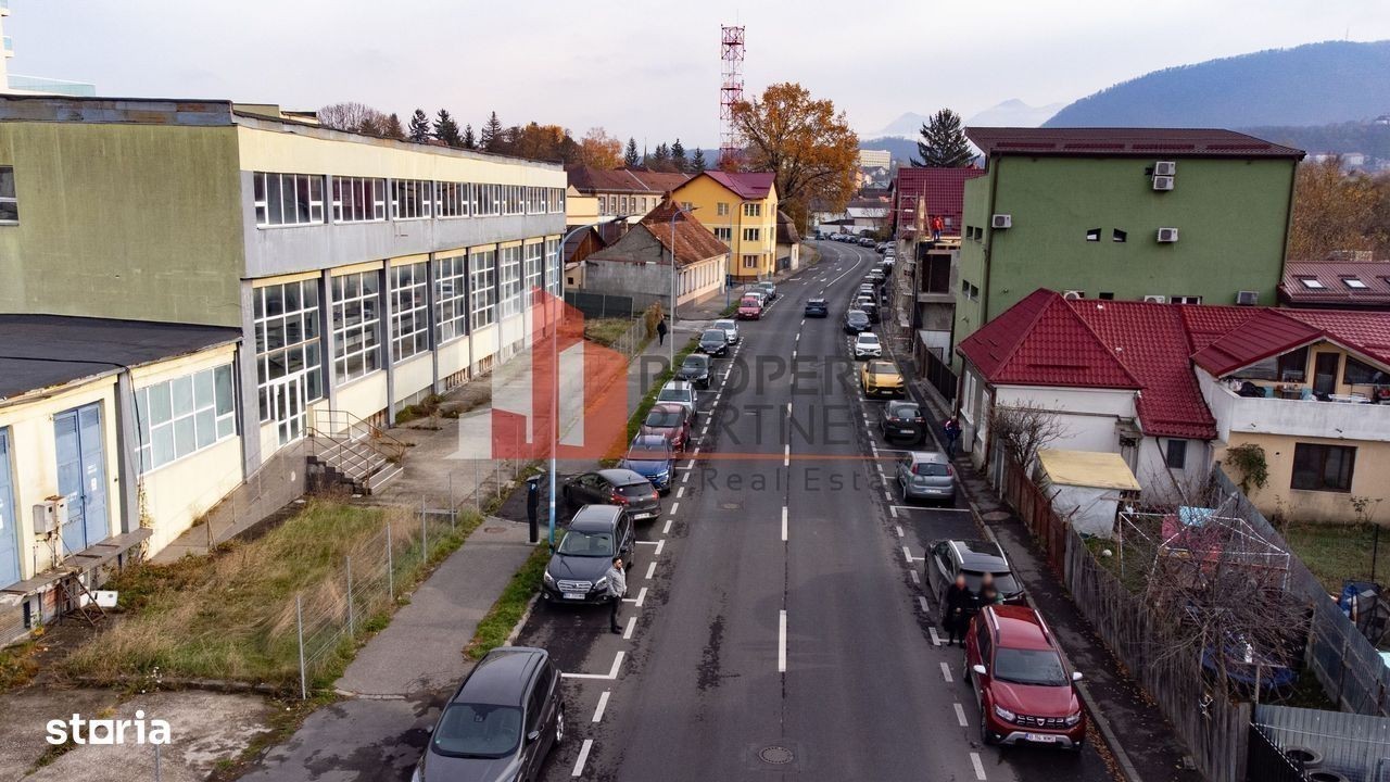 Proprietatea este situată pe Strada Mihai Viteazul nr. 166, în cartierul Bartolomeu din Brașov. Această zonă este predominant rezidențială, fiind completată de spații de birouri și comerciale. Terenul beneficiază de o conectivitate excelentă, cu acces imediat la rețeaua de transport public din Brașov și la doar câțiva pași de un hipermarket Kauffland. De asemenea, locația se află la mai puțin de 3 km de puncte importante ale orașului, cum ar fi centrul istoric, AFI Brașov, Coresi Shopping Resort și gara principală. Clădirea, cu o suprafață de 3.556 mp, a fost inițial construită ca o unitate industrială/de producție și este dispusă pe trei niveluri: - Subsol cu suprafata 981 mp si o inaltime de 4,0 - Parter cu suprafata de 1.171 mp si o inaltime de 6,0 - Etaj 1 cu suprafata de 1.078 mp si o inaltime de 4,0 Caracteristici suplimentare: • Platformă betonată de 820 mp • Post de transformare electrică propriu • Front stradal de 180 metri la Strada Mihai Viteazul • Racord complet la utilitățile publice Suprafața totală a terenului este de 2.856 mp. Potential de dezvoltare: Această proprietate oferă oportunități semnificative de reamenajare și reconversie, inclusiv: • Transformarea într-o clădire multifuncțională de birouri și/sau showroom-uri comerciale • Demolarea și construirea unui ansamblu rezidențial nou, clădire de birouri sau hotel Municipiul Brașov a indicat că pentru un astfel de proiect este necesară elaborarea unui PUZ (Plan Urbanistic Zonal). Indicatorii urbanistici preliminari sunt: • POT (procent de ocupare a terenului): 35% • CUT (coeficient de utilizare a terenului): 3 • Înălțime maximă: S+P+7E (Subsol + Parter + 7 Etaje)