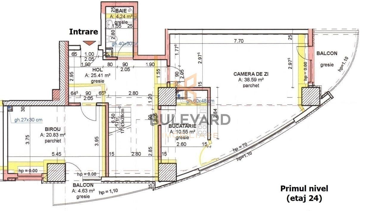 Comision 0%! Bulevard Imobiliare vă oferă spre vânzare un penthouse situat într-un bloc nou, cu o arhitectură modernă, ideal pentru orașele aflate în plină expansiune. Imobilul are regimul de înălțime 2S+3D+P+25E+Et.Tehnic și este amplasat în cartierul Mănăștur, la doar 4 km de punctul zero al orașului Cluj-Napoca (Piața Unirii). Poziționarea strategică asigură acces facil către toate punctele de interes ale orașului, atât cu mașina, cât și cu mijloacele de transport în comun. Acest penthouse este situat la etajele 24 și 25 (ultimele două etaje ale imobilului), având o suprafață utilă de 193,52 mp la care se adaugă 4 balcoane cu o suprafață totală de 21 mp. Compartimentare: Primul nivel: -cameră de zi; -bucătărie; -dormitor/birou; -baie; -hol; -2 balcoane. Al doilea nivel: -3 dormitoare; -2 băi; -hol; -2 balcoane. Dotări și finisaje Apartamentul se predă la stadiul de semifinisat, beneficiind de: -pereți cu glet; -instalații sanitare și electrice trase pe poziție; -încălzire în pardoseală; -tâmplărie din aluminiu cu geam tripan; -ușă metalică la intrare; -șapă egalizatoare. Detalii tehnice -Structură mixtă din beton armat cu nucleu central, diafragme, stâlpi și grinzi; -Subsol realizat în sistem top-down, cu piloți și radier; -Tâmplărie exterioară din aluminiu ALUMIL cu geam tripan 4season; -Compartimentări interioare din cărămidă Cemacon Evoceramic; -Izolație termică din plăci de vată bazaltică Rockwool (10 cm); -Instalații sanitare Rehau și module termice Caleffi (Italia); -Uși metalice antifoc Portadoors; -3 lifturi, dintre care unul panoramic, din sticlă; -Generator electric. Informații suplimentare Apartamentul deține extras de carte funciară; Prețul afișat nu este purtator de TVA. Pentru mai multe detalii sau pentru a programa o vizionare, vă invităm să ne contactați la numărul afișat!