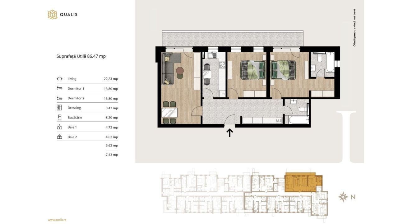 Qualis I: Apartament 3 camere, 86.47 mp, parcare inclusa