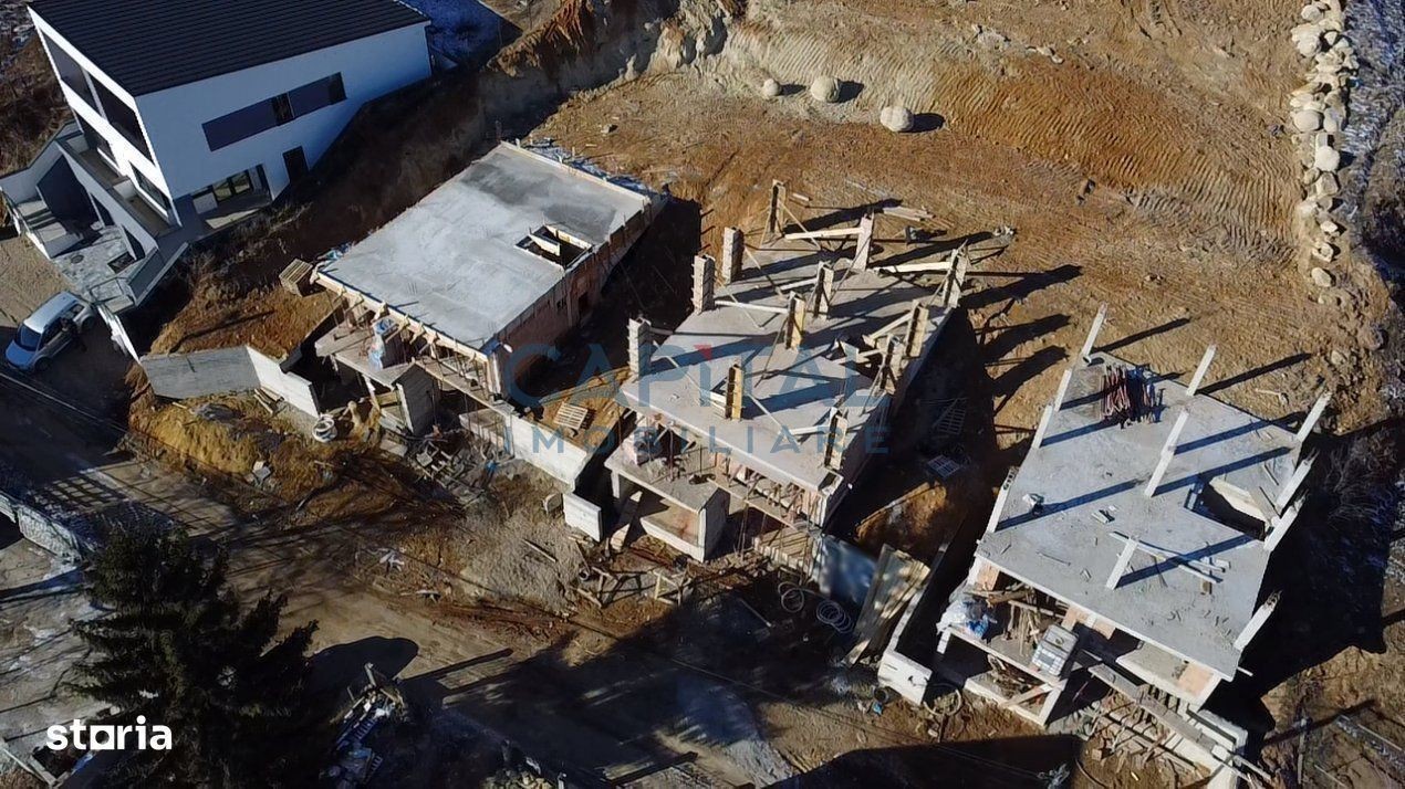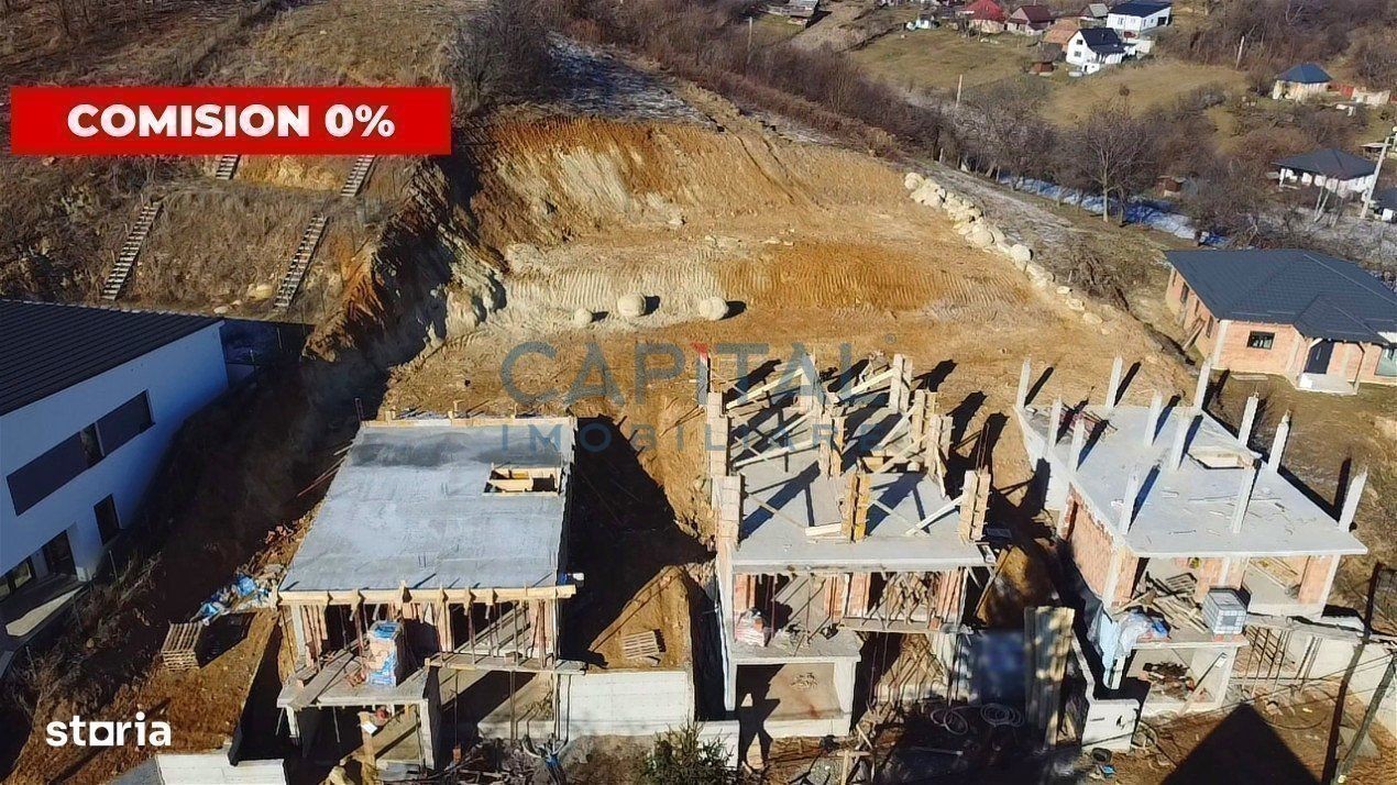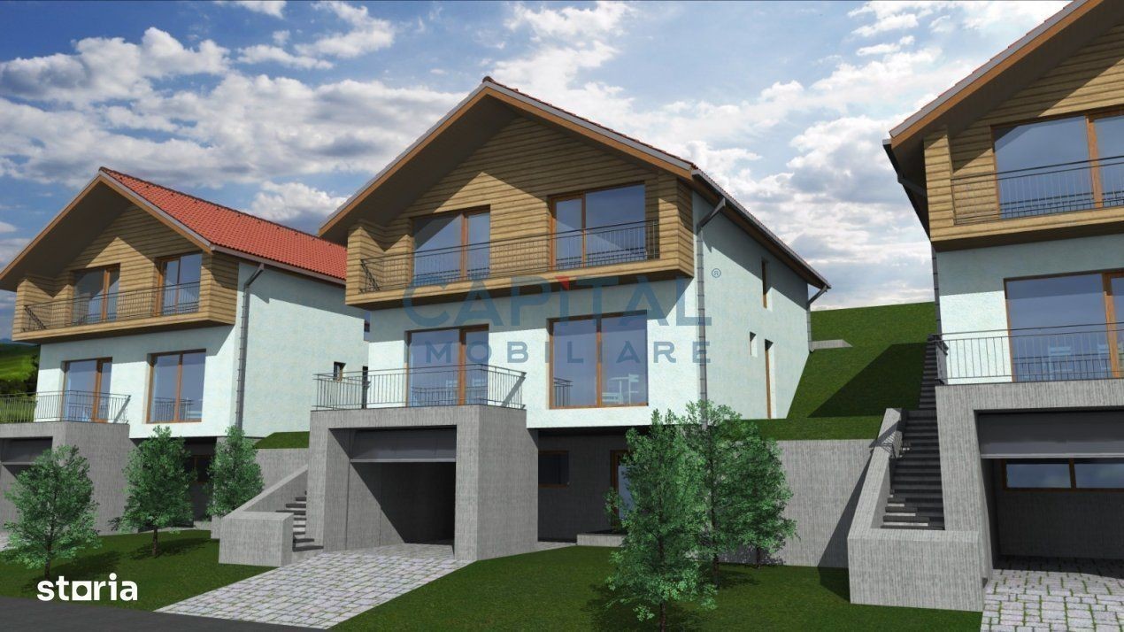 Capital Imobiliare va ofera spre vanzare, fara comision din partea cumparatorului, o casa unifamiliala noua (3 case disponibile), in suprafata utila de 130mp edificata pe 3 niveluri (S+P+M) pe un teren de 1000 mp in Feleacu, jud. Cluj. Casa aflata in constructie, cu un termen de predare in august 2024 este compartimentata astfel: S- garaj, camera tehnica, hol P- living cu loc de luat masa, bucatarie, baie, hol,terasa M-3 dormitoare din care unul cu baie si dressing si iesire spre terasa de 31mp, o baie. Casa este edificata de constructori consacrati cu mai multe case executate in zona si cu materiale de calitate avand urmatoarele caracteristici: zidarie caramida porotherm 25cm + termosistem 15 cm polistiren, acoperis de tigla, geamuri cu 3 foi de sticla, incalzire in pardoseala, fatada decorata cu insertii de lemn si gazon semanat. Proprietatea se vinde la stadiul de semifinisat incluzand fatada, imprejmuirea cu gard cu fundatie de beton in partea din fata, pereti interioari gletuiti, centrala termica si incalzire in pardoseala si gazon semanat. Zona este centrala cu acces usor spre mijloacele de transport in comun, iar casa este orientata spre sud si va oferi o priveliste neobturata spre vale. Pentru mai multe informatii, va rugam sa ne contactati.