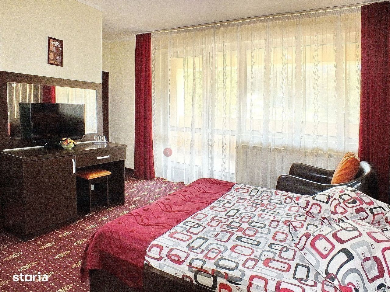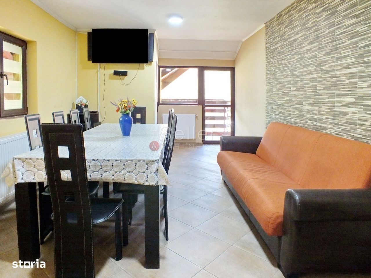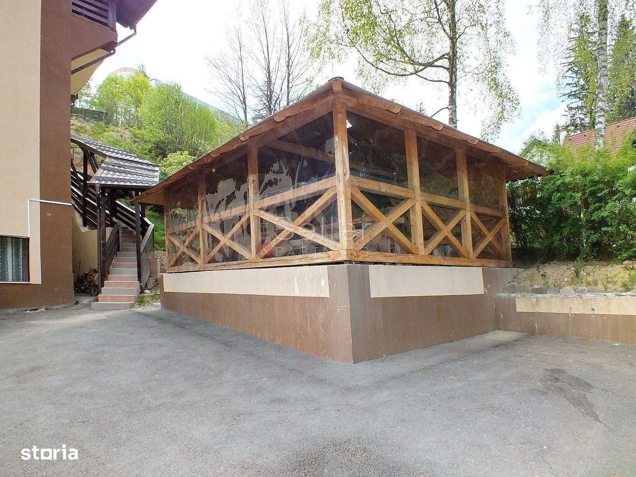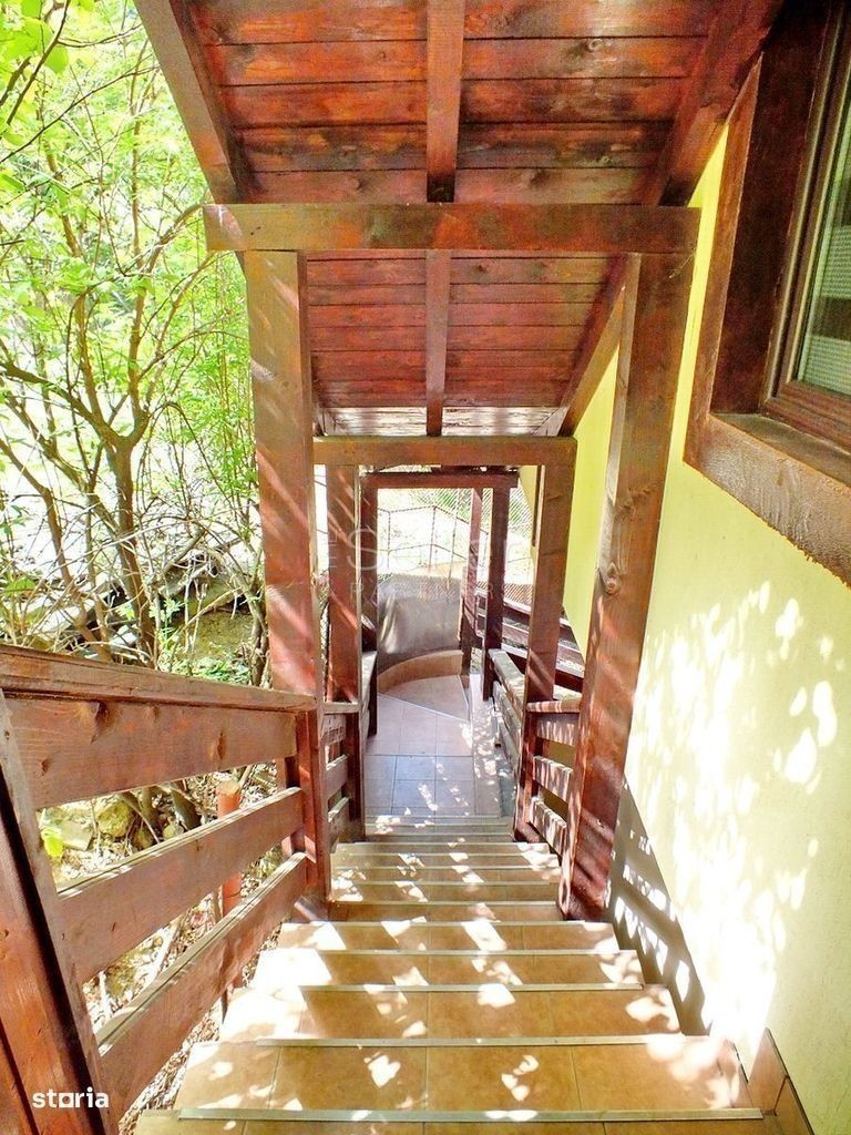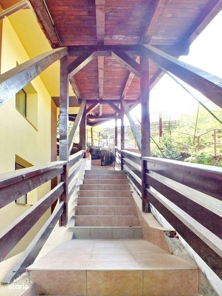 Imobilul propus este situat in Poiana Brasov, fiind dispus pe un regim de inaltime P+2E+M. Aceasta proprietate este situata in zona centrala a statiunii, la o distanta de aproximativ 200 metri de partia de ski. Pensiunea este clasificata cu 4 Margarete. Proprietatea este situata intr-o zona linistita si poate fi descrisa astfel: PARTER: Aici regasim receptia, 2 bucatari complet utilate, un living generos, cu iesire spre terasa acoperita si o toaleta comuna ETAJ 1 si 2: La etajele 1 si 2 regasim 8 camere spatioase, cu bai proprii, 4 dintre ele avand iesire la balcon si vedere catre statiune. Alte 4 camere au vedere spre padure MANSARDA: Aceasta este prevazuta cu intrare separata de restul cladirii si este compusa din 5 camere, cu bai si balcoane proprii, un living comun si o bucatarie complet utilata. CURTE: Aici regasim un foisor, cu o capacitate de 40 persoane, prevazut cu 2 gratare.