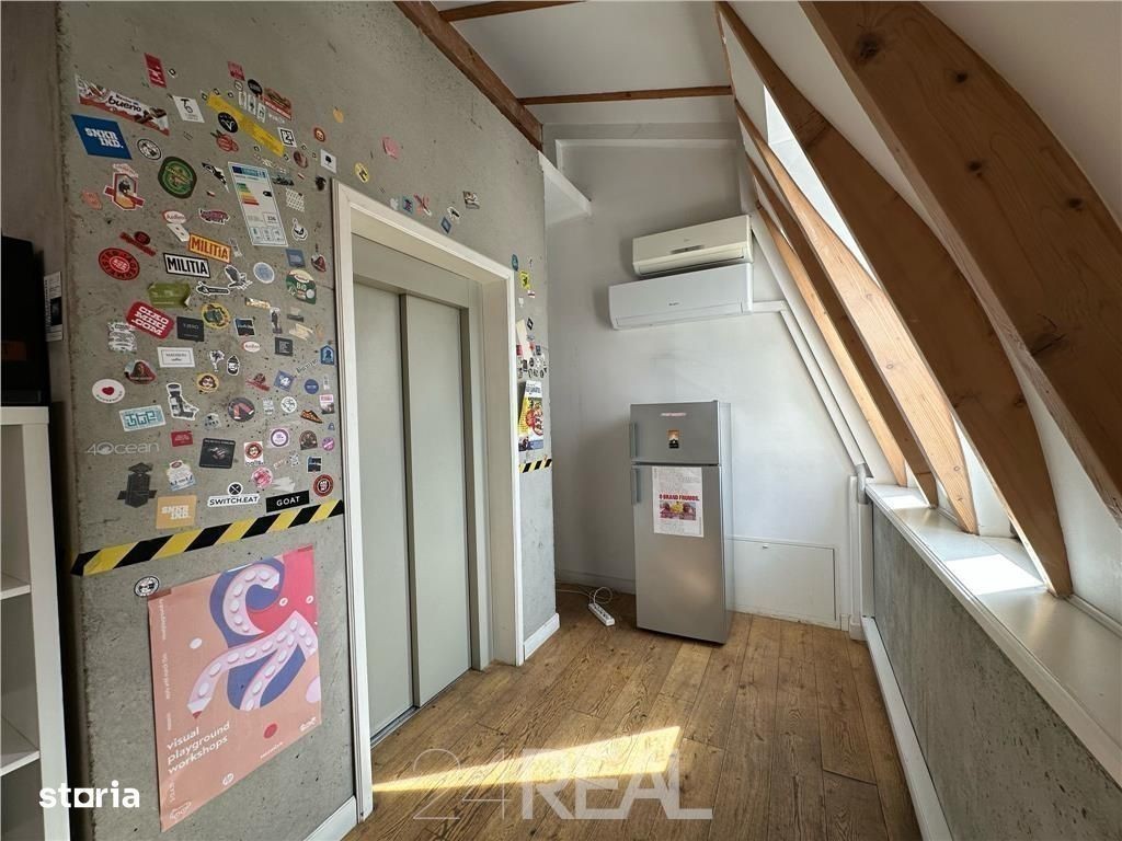 Spatiu de birouri - inchiriere - in vila, clasa B, in zona Universitate, sector 1, Bucuresti, cu urmatoarele dotari si finisaje: structura caramida, beton, perete lavabil, faianta, inaltime spatiu 2,7 m, plansee beton armat, gresie, parchet. Dotari tehnice: telefon, internet. Servicii disponibile in cladire: contorizare separata. Mentenanta: 250euro Mansarda exceptionala situata intr-o vila monument istoric in plin centru al Bucurestiului, la aproximativ 5 minute de mers pe jos de statia de metrou Universitate, in spatele Pietei Rosetti, intr-o zona valoroasa a orasului din punct de vedere arhitectural si urbanistic. Vila a fost consolidata si reconditionata integral. Spatiul spre inchiriere detine 2 cai de acces (ascensor si scari) si 2 locuri de parcare securizate. Detine incalzire in pardoseala, aer conditionat, centrala proprie si este termoizolata. Suprafata utila - 233,5 mp, compusa din: 1 Birou open space - 165,9 mp; 3 sali de private meeting - cca 17 mp fiecare; 2 Grupuri sanitare; 1 Chicineta; 1 Camera tehnica - ascensor si centrala termica.