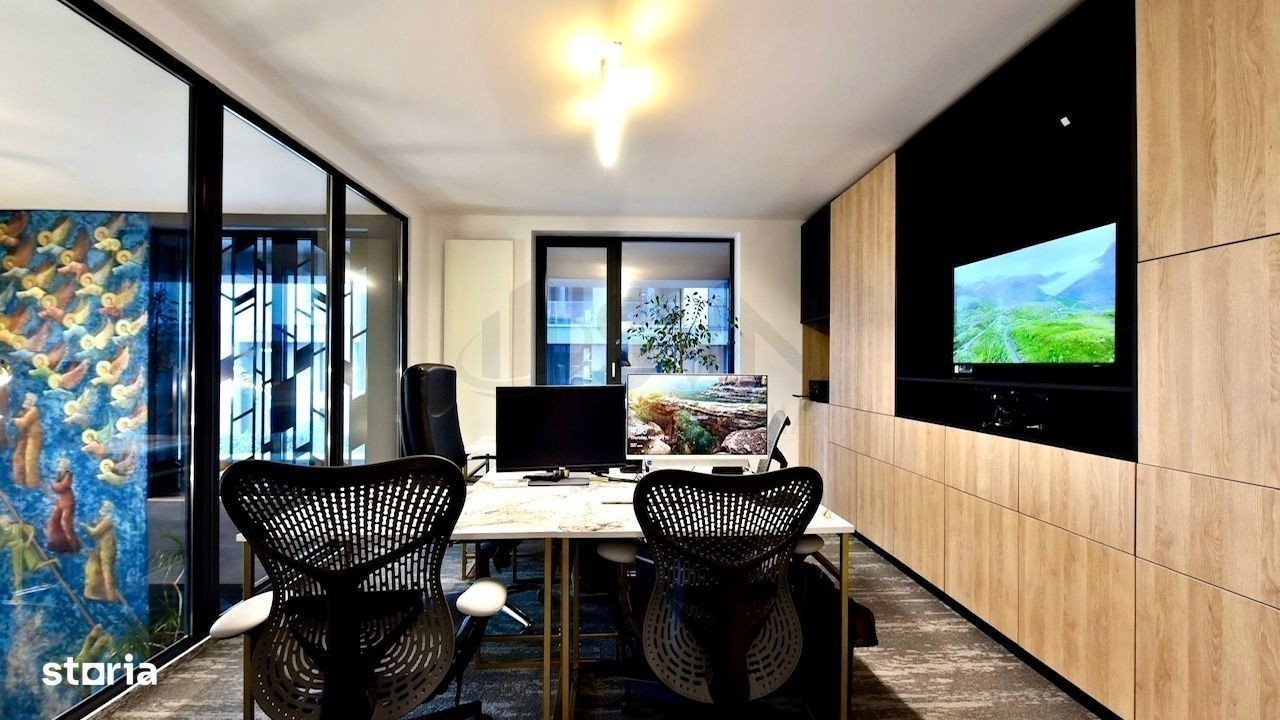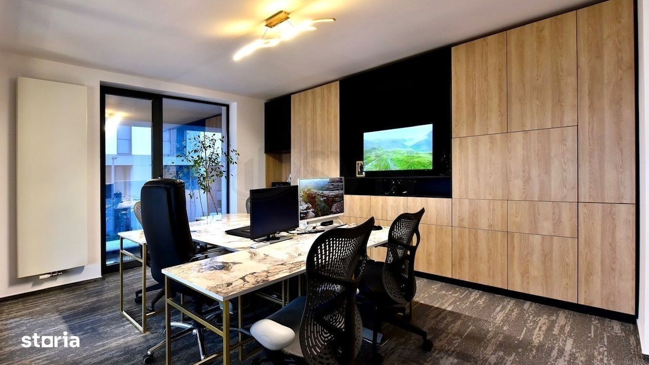 REA1021930 SVN Romania va propune spre achizitie/inchiriere un duplex cu 3 camere complet mobilat si utilat pentru sediu firma, situat in complexul Cloud9, in cea mai dezvoltata zona de birouri si la 3 minute de Metroul Aurel Vlaicu. Duplexul este situat la parter si mezanin si are o suprafata utila de 97 mp la care se adauga 3 terase ce insumeaza 20 mp si o curte de 90 mp. Se vinde complet mobilat si utilat, exact cum se prezinta in imagini. Apartamentul poate fi eliberat si amenajat de catre viitorii proprietari de asemenea pentru locuinta. A fost amenajat cu ajutorul unui designer de interior, cu materiale de calitate premium, marmura, mobilier lemn, piatra naturala, usi Filomuro etc. Apartamentul dispune de sauna interioara. Separat, se pot achizitiona 3 locuri de parcare in fata biroului. Finisajele si dotarile cladirilor si apartamentelor din complex au acordat o atentie deosebita detaliilor, avand materiale de inalta calitate si finisaje de top. Certificatul energetic va fi disponibil la vanzare. Pentru mai multe informatii sau programarea unei vizionari, va rog sa ma contactati.