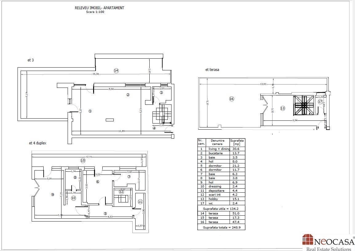Neocasa propune spre vanzare un penthouse impartit pe 3 niveluri. Acest apartament impresionant de 4 camere ofera un spatiu luxos si aerisit, cu o suprafata utila de 134 mp si 3 terase generoase ce impreuna aduna o suprafata de 115 mp, ideale pentru a va bucura de privelisti panoramice si momente de relaxare in aer liber. Detalii principale: Suprafata utila: 134 mp Terase: 115 mp, perfecte pentru relaxare, socializare si amenajarea unui spatiu exterior unic. Configuratie: Living spectaculos cu spatiu deschis, 2 dormitoare spatioase, 4 bai moderne, bucatarie open space (nemobilata), spatiu pentru dining plus o camera ce face legatura catre terasa de pe acoperis Triplex: Dispus pe trei niveluri oferind intimitate si un sentiment de spatiu deschis, cu design contemporan Nemobilat: Puteti personaliza si amenaja interiorul dupa propriul stil si preferinte Acest penthouse este alegerea perfecta pentru cei care cauta un stil de viata exclusivist, un spatiu generos si o terasa impresionanta, intr-o locuinta moderna si sofisticata. Locurile de parcare se pot achizitiona separat: loc de parcare subteran 20.000 de euro, loc de parcare suprateran 15.000 de euro.
