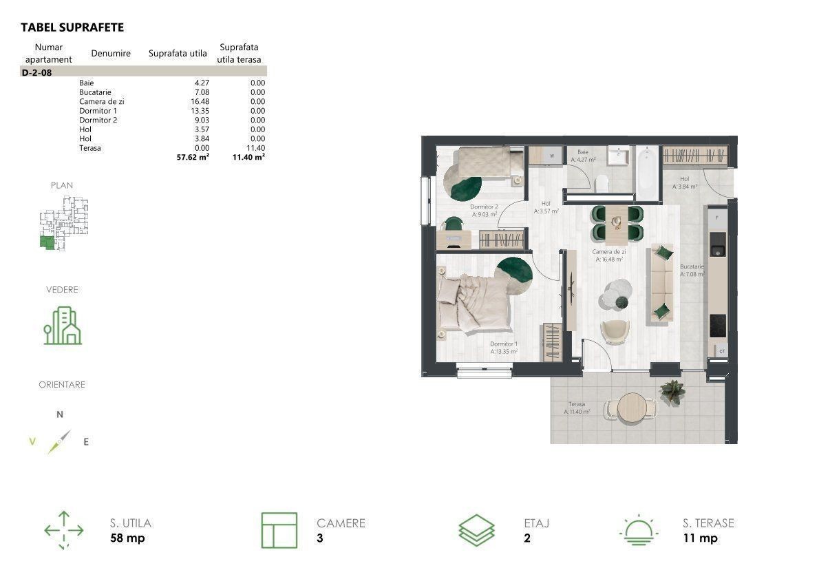 Denya Forest a fost gândit ca un loc de refugiu perfect, într-o locație privilegiată din nordul Timișoarei, la marginea Pădurii Verzi, în mijlocul unei comunități ce împărtășește aceleași valori ca și tine. Cu un total de 117 apartamente construite la standarde occidentale, blocul 7 oferă finisaje de calitate superioară și sisteme moderne de încălzire în pardoseală. Gama variată de locuințe include apartamente cu 1.5, 2, 2.5 și 3 camere, precum și penthouse-uri, cu multiple opțiuni de compartimentare, astfel încât să răspundă nevoilor și dorințelor tale. Designul inteligent al spațiilor interioare asigură un confort maxim, iar ferestrele mari și terasele spațioase creează o legătură naturală între căldura locuinței și prospețimea pădurii din apropiere. Atmosfera unică te face să te simți acasă, într-un echilibru perfect între natură și modernitate. Blocul 7 aduce un plus comunității Denya Forest prin adoptarea conceptului inovator nZEB (Nearly Zero Energy Building), care reduce semnificativ consumul energetic și implicit costurile de întreținere, protejând în același timp mediul înconjurător. Detalii tehnice de ultimă generație: • Sistem de încălzire și apă caldă prin pompe de căldură hibrid, Daikin sau similar. • Sisteme de climatizare moderne cu ventiloconvector CLINT sau similar. • Izolație termică exterioară cu polistiren expandat de 12 cm, pentru eficiență energetică ridicată. • Pereți interiori din gips-carton de 12.5 cm, cu izolație fono și termo, pentru un confort sporit. • Ferestre din profile PVC cu 5 camere - Trocal Kommerling sau similar, și geam tripan cu peliculă LowE pentru performanță energetică optimă. Facilități pentru rezidenți: • Locuri de parcare subterane și supraterane. • Acces la transport public: linia de autobuz 46, cu stație pe strada Constructorilor, chiar în interiorul ansamblului Denya Forest. • Parc amenajat cu spații verzi și locuri de joacă pentru copii. • Apropierea de magazine, centre comerciale, școli, săli de sport. • Locație de vis lângă Pădurea Verde, un parc vast de 10,5 hectare, ideal pentru plimbări și activități recreative, fie pe jos, fie cu bicicleta. Denya Forest este un complex durabil și sigur, construit să reziste în timp, asemenea unei păduri. Te invităm să ne vizitezi și să descoperi viitorul tău apartament, în inima verde a Timișoarei! Un stil de viață modern, în inima verde a Timișoarei!