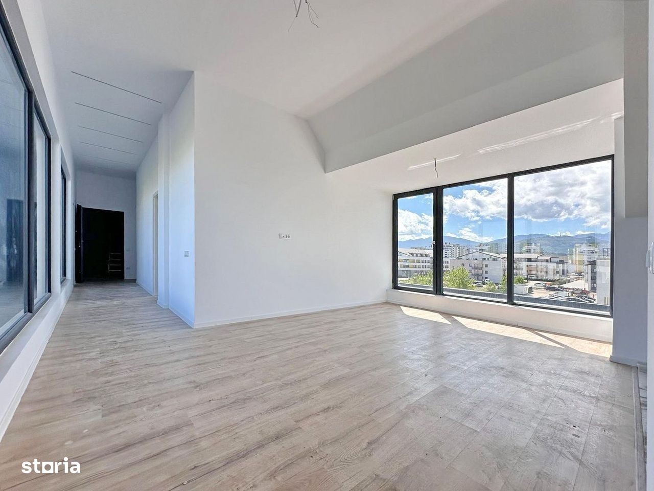 Proprietatea propusa spre achizitionare se afla in zona Coresi, intr-o cladire ce beneficiaza de acces privat si liniste. Apartamentul este dispus pe o structura decomandata, cu compartimentare practica, suprafete vitrate ample, finisaje premium si priveliste neobturata catre Muntele Tampa si Masivul Postavarul, fiind insorit pe intreg parcursul zilei. Spatiul cuprinde zona de zi, bucatarie, doua camere, baie, hol si doua terase generoase, fiind ideal atat pentru un cuplu, cat si pentru o familie. Separat se poate achizitiona un loc de parcare suprateran, la pretul de 8500 euro + TVA.