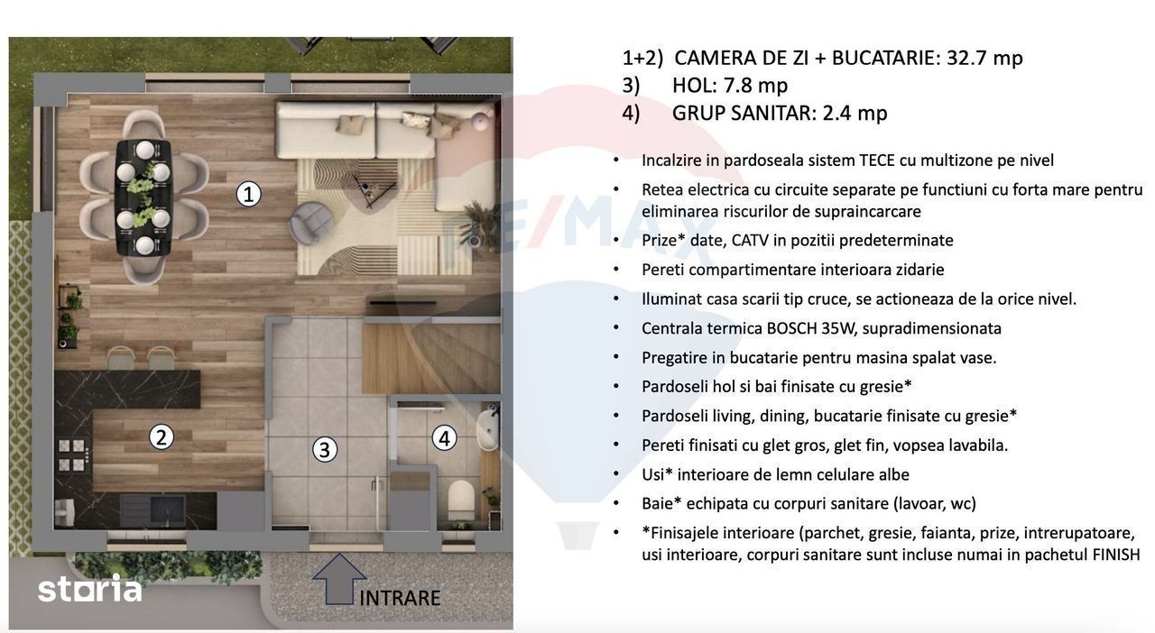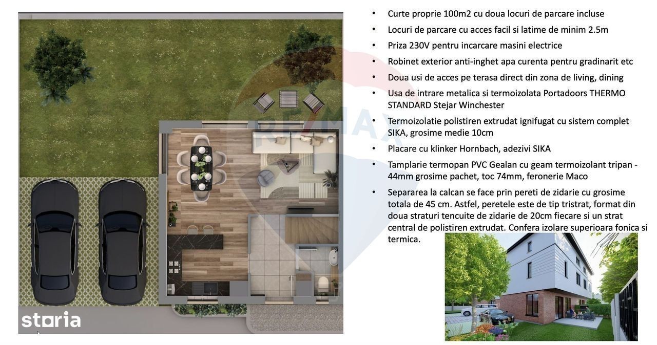 Descoperă noua ta casă, într-un ansamblu rezidențial exclusivist situat în zona Ferme, Otopeni. Un complex modern și sigur, format din doar 8 unități locative, perfect pentru cei care își doresc un stil de viață liniștit, elegant și aproape de natură, fără a renunța la accesibilitatea orașului. Case spațioase, luminoase și bine compartimentate Fiecare duplex are o suprafață generoasă de 147 mp utili, un design modern, cu spații vitrate mari, și o curte privată de 100 mp, perfectă pentru relaxare, grădinărit sau petrecerea timpului alături de cei dragi. Compartimentare inteligentă pentru confort maxim Parter - spațiu deschis, aerisit și primitor Living luminos, cu ferestre ample care oferă o atmosferă caldă și primitoare Bucătărie open-space, ce poate fi închisă, în funcție de preferințe Baie de serviciu Acces direct la terasa privată și curtea proprie Etajul 1 - intimitate și confort pentru întreaga familie Două dormitoare spațioase, fiecare cu baie proprie, pentru un plus de intimitate și confort Mansardă - spațiu versatil, adaptabil nevoilor tale Cameră generoasă, ideală pentru un home office, zonă de relaxare sau un spațiu de joacă Opțiunea de amenajare a unuia sau a două dormitoare suplimentare, cu baie proprie Facilități premium în cadrul ansamblului Acces controlat prin barieră, exclusiv pentru rezidenți Drum interior privat, iluminat nocturn Gospodărie de apă proprie, pentru presiune constantă Sistem de irigare automatizat pentru vegetația perimetrală și jardiniera fațadei Racorduri individuale la toate utilitățile Pregătire fibră optică pentru internet de mare viteză 2 locuri de parcare incluse pentru fiecare unitate Localizare excelentă Situate într-o zonă verde, liniștită și aerisită, aceste case oferă echilibrul perfect între viața de oraș și confortul unei locuințe private. Acces rapid către București, aeroport, centre comerciale, școli și grădinițe de top. Prețuri atractive: La gri - de la 249.000 EUR + TVA La cheie - de la 264.000 EUR + TVA Sună acum pentru o vizionare și hai să descoperi noua ta locuință!