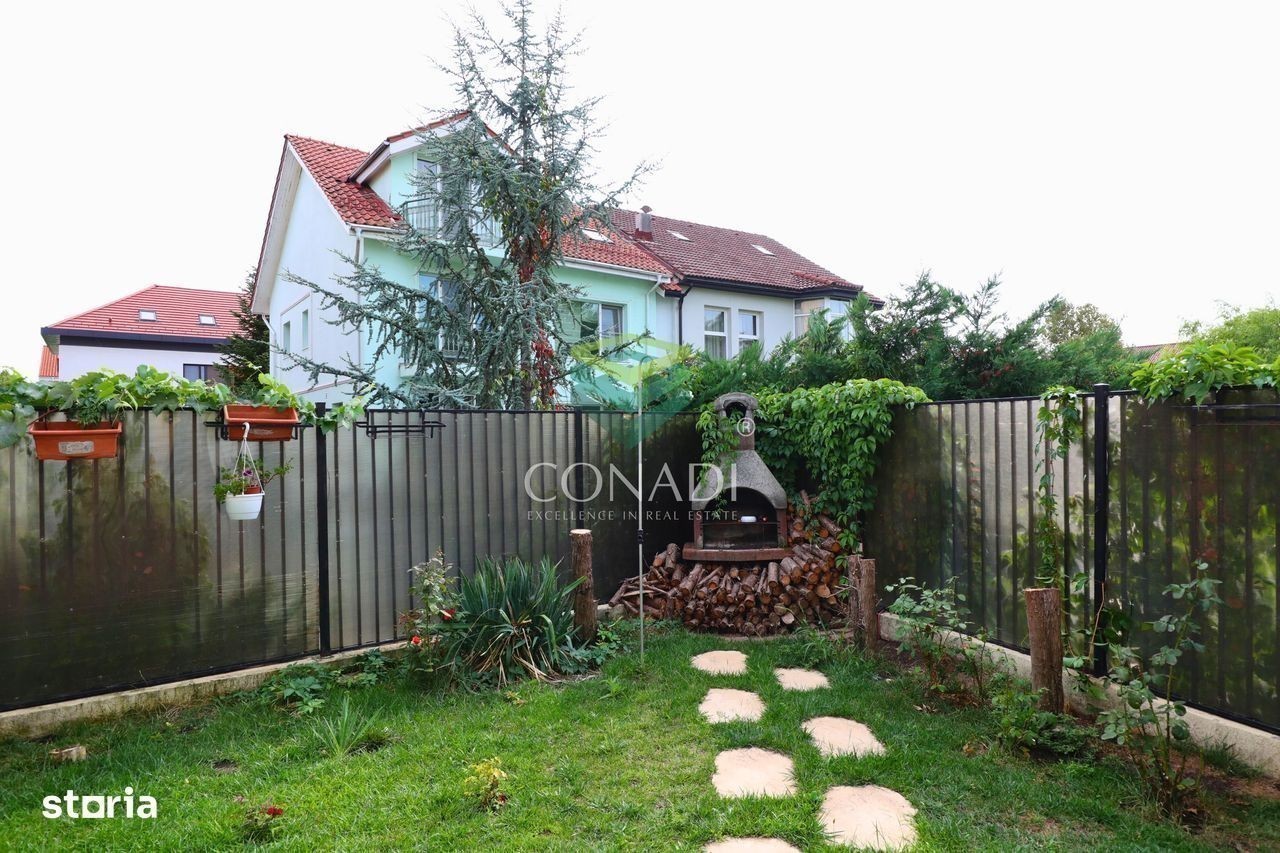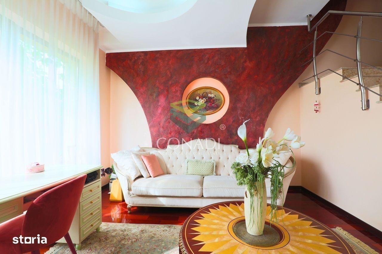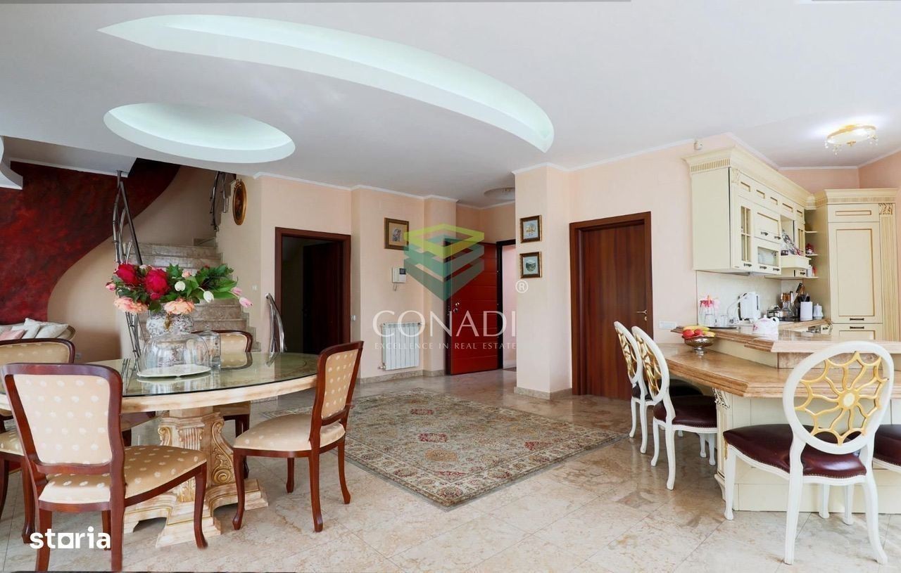 Vila, cu suprafata construita de 356 mp, este situata intr-un perimetru securizat din zona Baneasa- Iancu Nicolae, amplasat in apropiere de padure. In zona se afla: zona de birouri Baneasa, zona de birouri Pipera, Jolie Ville, mall Baneasa, Strip Mall, British School, American School, Discovery School, Baneasa Mall, Olga Gudyn School, Cambridge School, Liceul francez Anna de Noailles, gradinite, magazine, cafenele, restaurante etc. Vila se compune din: - subsol/ open space, spatiu depozitare; - parter/ hol, living, dining, grup sanitar, garaj, terasa; - etaj/ hol, 3 dormitoare, 2 bai, dressing, balcon. Finisaje/amenajari: - parchet din lemn masiv- merbau - marmura - gresie si faianta - centrala termica, calorifere - aer conditionat - scafe - bucatarie mobilata si utilata; mobilier dressing - gradina cu vegetatie matura Locuri de parcare: 3 Pret de vanzare: 570.000 euro