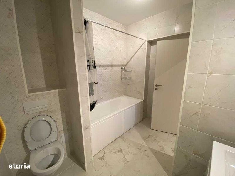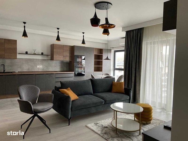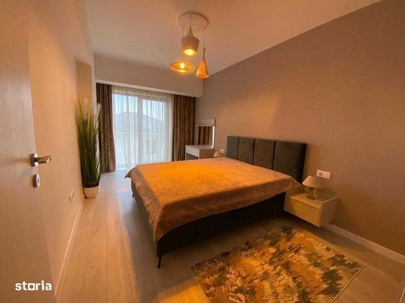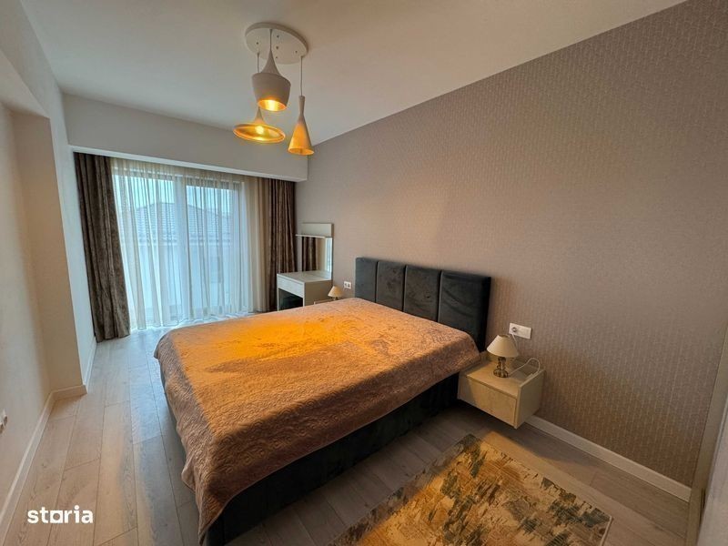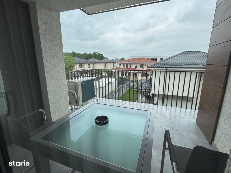 Apartament spatios cu spatii de depozitare generoase, cu aria interioara de 61,5 m2 utili + terasa tip logie 7,7 m2, mobilat si utilat cu atentie la detalii, in gama premium, situat in complexul Tunari Resort Residence, finalizat la sfarsitul anului 2021, format din 3 blocuri cu 3 etaje. Apartamentul se afla la etajul 2 in blocul C, cel mai apropiat de padurea Tunari, retras de la strada. Vederea de pe terasa este libera, neobstructionata, catre apus. Locatia se afla convenabil pozitionata pe strada 1 Decembrie nr 171, in Tunari-Otopeni, cu acces rapid catre zona de business Pipera, aeroportul Otopeni, nordul Bucurestiului, DNCB, A3, Scoala Americana, Parcul Herastrau, Mall Promenada, Baneasa Shopping Mall. Apartamentul dispune de incalzire cu centrala proprie, tip incalzire prin pardoseala si un consum energetic clasa A, cheltuielile lunare fiind minimale. Intrarea in bloc este securizata cu interfon. In pretul de inchiriere este inclus si locul de parcare suprateran, accesul facandu-se pe la bariera de la intrarea in complex. Alte utilitati incluse: aer conditionat, MSR, MSV, cuptor microunde, cuptor electric, frigider incorporat in mobilier, plita inductie, Pe o raza de 1 km se afla doua magazine La Doi Pasi, Mega Image, Lidl si Penny. Padurea se afla la cateva minute distanta de mers pe jos.