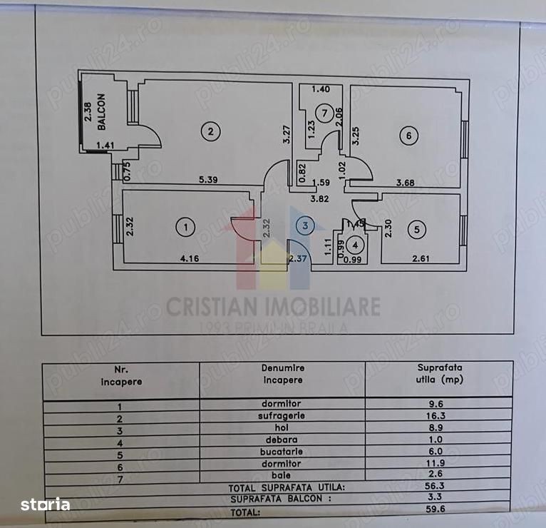 SUPER PRET Apartament 3 camere, confort 1, decomandat, suprafata utila 60 mp, etaj 3 - centrala termica proprie; - termopan PVC (inclusiv in balcon); - parchet lemn natural, faianta, gresie; - usi interioare din lemn; - usa intrare din metal; - interfon; - casa scarii este iluminata natural; - izolat termic; - vedere atat in fata blocului cat si in curtea interioara; - nelocuit, se poate preda oricand. Cristian Imobiliare - din 1993 Primii in Braila CRS6668 &11