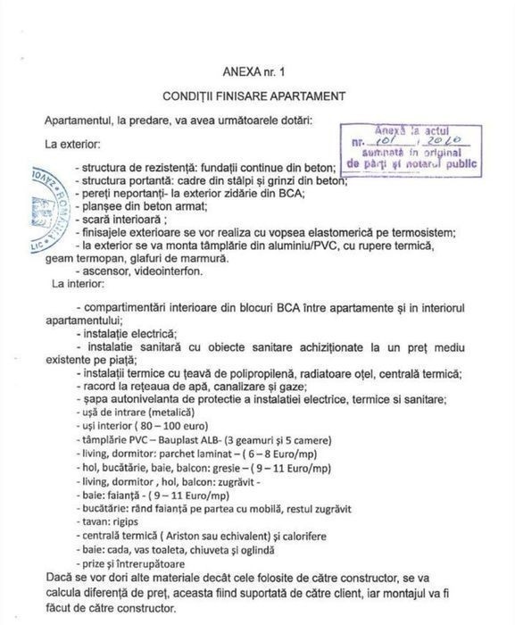 Apartament 2 camere + doua locuri de parcare incluse cu suprafață de 63 mp. Garsoniera 45 mp cu loc de parcare inclus Apartment cu 3 sau 4 camere, suprafața de 125 mp + 4 locuri de parcare incluse Termen de finalizare august 2026, bloc NOU situat pe strada Severinului nr. 32A, intre Mall Promenada și OMV CONDIȚII FINISARE APARTAMENT Apartamentul, la predare, va avea următoarele dotări: La exterior: - structura de rezistență: fundații continue din beton; - structura portantă: cadre din stâlpi și grinzi din beton; - pereți neportanți - la exterior zidărie din BCA cu izolatie din polistiren; - planșee din beton armat; - scară interioară; - finisajele exterioare se vor realiza cu vopsea elastomerică pe termosistem; - la exterior se va monta tâmplărie din aluminiu/PVC, cu rupere termică, geam termopan, glafuri de marmură. - ascensore, videointerfon. La interior: - compartimentări interioare din blocuri BCA între apartamente și în interiorul apartamentului; - instalație electrică; - instalație sanitară cu obiecte sanitare achiziționate la un preț mediu existent pe piață; - instalații termice cu țevă de polipropilenă, încălzire pardoseala, centrală termică; - racord la rețeaua de apă, canalizare și gaze; - șapa autonivelantă de protecție a instalației electrice, termice și sanitare; - ușă de intrare (metalica) - uși interior ( 80 - 100 euro) - tâmplărie PVC - (3 geamuri și 5 camere) - living, dormitor: parchet laminat - ( 6 - 8 Euro/mp) - hol, bucătărie, baie, balcon: gresie - ( 9 - 11 Euro/mp) - living, dormitor, hol, balcon: zugrăvit - - baie: faianță - ( 9 - 11 Euro/mp) - bucătărie: rând faianță pe partea cu mobilă, restul zugrăvit - tavan: rigips - centrală termică ( Ariston sau echivalent) și calorifere - baie: cadă, vas toaletă, chiuvetă și oglindă - prize și întrerupătoare Dacă se vor dori alte materiale decât cele folosite de către constructor, se va calcula diferența de preț, aceasta fiind suportată de către client, iar montajul va fi făcut de către constructor.