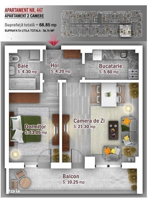 Habitat Group Estate va prezinta un apartament de 2 camere decomandat avand o suprafata totala utila de 58,7 mp la pretul promotional de 124.630 Eur TVA inclus. Apartamentul este FINALIZAT cu ACTE GATA DE MUTARE si se afla la o distanta de doar 5 minute de metrou A.Saligny. Apartamentul de 2 camere este situat la etajul 4 al unui bloc P+4E+5R+6R+7R niveluri, cu o compartimentare ideala pentru familia dumneavoastra, suprafata utila totala de 58,7 mp. Apartamentul este utilat cu gresie, faianta, parchet, usi interior si cea de exterior securizata, centrala proprie in condensatie de 24 kw, baile echipate si utilate. Apartamentul va fi predat la cheie bransat la toate utilitatile Enel, Engie si Apanova. Amplasat la doar 5 minute de statia de metrou Anghel Saligny, in apropriere de supermarket Auchan, IKEA, JUMBO, gradinite, scoli, farmacii, spitale, spatii verzi si de agrement, confera confortul mult dorit pentru familia dumneavoastra. Oferim asistenta in vederea intocmirii dosarului de creditare. Comision 0%. Optional se poate achizitiona separat si loc de parcare acoperit la pretul de 12.000 Eur fara TVA sau loc parcare suprateran neacoperit la pretul de 10.000 Eur fara TVA. Poze reale din acest ansamblu rezidential. Locatie birou vanzari dezvoltator : strada Postasului nr.29, Sector 3 Waze: Habitat Group Estate Program vizionari: Luni - Vineri : 10:00 - 18:00 si Sambata : 10:00 - 14:00 Recomand vizionare Bogdan Mavrogheorghe