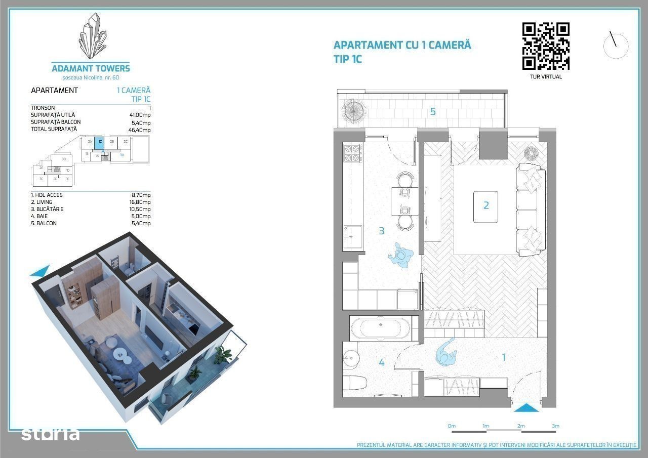 Apartament finalizat de 1 cameră 46.4mp, decomandat, situat la etajul 8 din 10 din blocul 1 cu o suprafaţă utilă de 41 mp si un balcon tip terasă de 5.4mp. Situat în Șos. Nicolina 54, în zona CUG - Rond Vechi Iași, complexul se află la doar 7-8 minute de Palas Mall, oferă acces ușor la stații de transport public (vizavi de complex), piață alimentară, grădinițe, supermarket-uri.