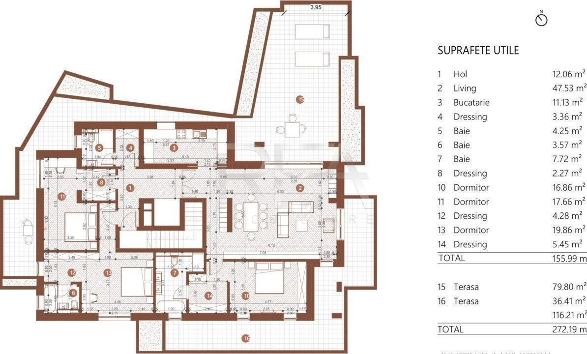 R.E.A. Imobiliare Penthouse de 4 camere, singur pe etaj, cu spatii vitrate si FINISAJE LA ALEGERE, aflat la etajul 6 retras al unui imobil format din Parter + 5 etaje + 2 etaje retrase, in zona Mosilor, la doar câțiva pași de strada Mihai Eminescu si Bulevardul Dacia, cu acces rapid atât către Obor, cât și către Universitate. Acces rapid la transport public: 3 minute pana la statiile STB, 8 minute pana la metrou Obor. Termen de finalizare 31 Mai 2026 - Suprafață totală de 272,19 mp: 159,99 mp utili+ 79,8 mp terasa+ 36,41 mp terasa. - Configurație: 3 dormitoare, living, bucatarie, hol, 4 dressing-uri, 3 bai si 2 terase. - Incalzire prin pardoseala Tecce Germania, centrala proprie. - Parcare subterană tip Klaus independent 30.000 EUR / loc. Informatii suplimentare: - Parchet din lemn stratificat; - Ceramica perete / pardoseala in bai si parti comune, fabricatie Italia; - Obiectele sanitare gama moderna Rocca, accesorii HansGrohe; - Accesorii electrice Bticino prize / intrerupatoare, gama Premium; - Usi interior MDF pantografate, cu toc plan si pervaz drept, cu broasca magnetica, Pinum fabricatie Italia; - Usa intrare apartament metalica, blindata cu inchideri multipunct si balamale ascunse, Pinum fabricatie Italia; - Tamplarie PVC cu sticla termoizolanta tripan Salamander Blue Edition; - Inchiderile perimetrale si compartimentarile dintre apartamente din caramida Wienerberger de 36cm, iar compartimentarile interioare tot din caramida Wienerberger de 15cm; - Fatada ventilata: vata bazaltica 15cm, alucobond plus fibrociment; - Acces securizat in cladire, videointerfon si supaveghere video perimetrala si spatii comune. Acces la transport public: 3 minute pana la statiile STB, 8 minute pana la metrou Obor. Pentru detalii și vizionări, contactați-ne specificând codul de identificare P6509.