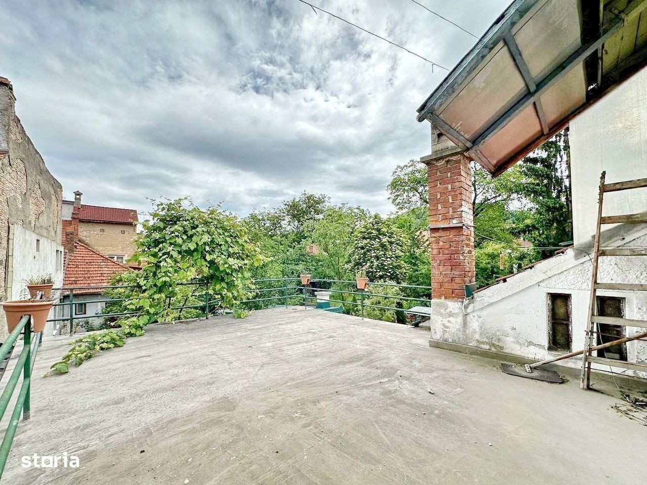 Proprietatea propusa spre achizitionare se afla in zona 15 Noiembrie, intr-o cladire din 1901, cu camere inalte si aerisite, cu acces facil atat catre Centrul Istoric, cat si catre centrul administrativ. Locuinta se desfasoara pe intreg etajul intai, este compusa din patru camere, bucatarie, baie, grup sanitar, hol, balcon si o terasa (40.9 mp) cu priveliste directa catre Muntele Tampa si se tranzactioneaza la pachet cu podul de deasupra (cu o suprafata aproximativa de 120 mp). Spatiul este dispus pe o structura circulara, cu compartimentare practica si suprafete vitrate ample, ce confera multa lumina naturala. Interiorul pastreaza o parte importanata din elementele originale ale casei, ce pot fi reconditionate si puse in valoare, in functie de preferinte. De asemenea, imobilul detine si un beci de tip crama (21 mp) si cota parte din curte si spatiile comune/ anexe.