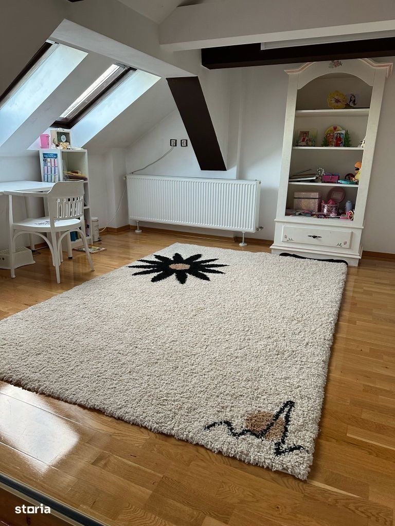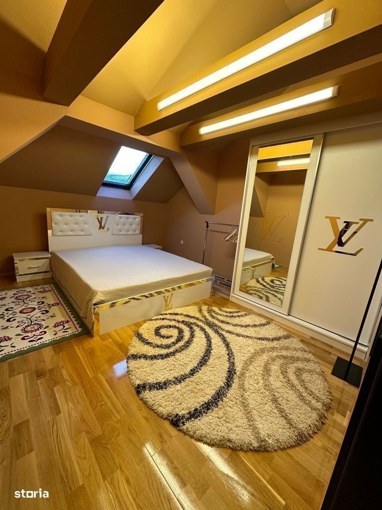 Suprafața totală a terenului este de 555 mp, Suprafața construită pe două niveluri este de 400 mp, suprafață utilă 300 mp. Suprafața curții 250 mp din care terase acoperite 100 mp. Casa este compusă din: - antreu 9 mp, - living de 100 mp, - dormitor 50 mp, pictat 3D cu culori fluorescente de artiști plastici de elită, mobilat complet Mobexpert (dormitor Alexander), cu covoare spectaculoase imperiale din Ucraina, - dressing de cca 8 mp, - baie de 8 mp cu jacuzzi. Din living se poate ieși pe gazon în curtea interioară sau în - bucătăria amenajată cu mobilier Louis Philippe de la Mobexpert, dotată cu aparatură modernă: plită cu inducție, cuptor, hotă, chiuvetă, baterie, tocător de legume sub chiuvetă, toate FRANKE, filtru de apă Amway, mașină de spălat vase încorporată Miele, cuptor de pizza Ferrari. La etaj-mansardă: - două dormitoare, de 30 și respectiv 15 mp, - baie generoasă 10 mp cu cabină de duș mare de 2 mp, - loc de depozitare de cca 9 mp, - spălătorie-uscătorie de cca 8 mp, dotată cu mașină de spălat de 10 kg cu inverter, - loc de mașină de uscat haine - uscător natural extensibil de 4 m.