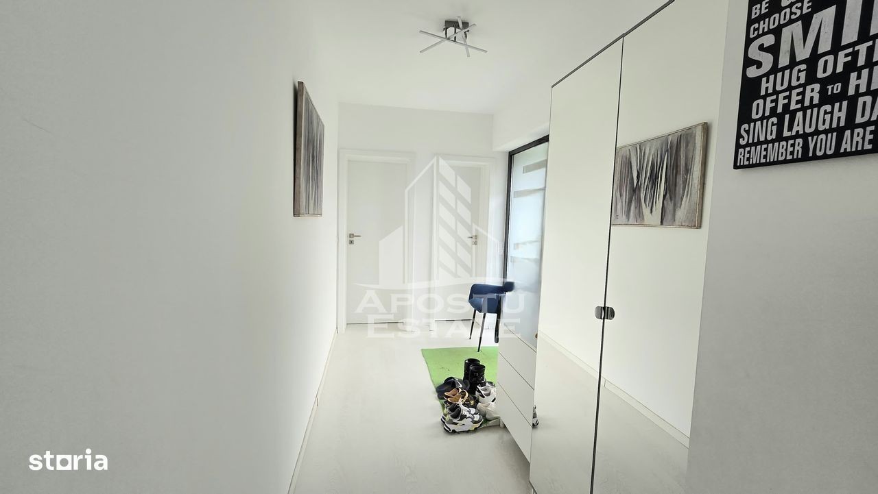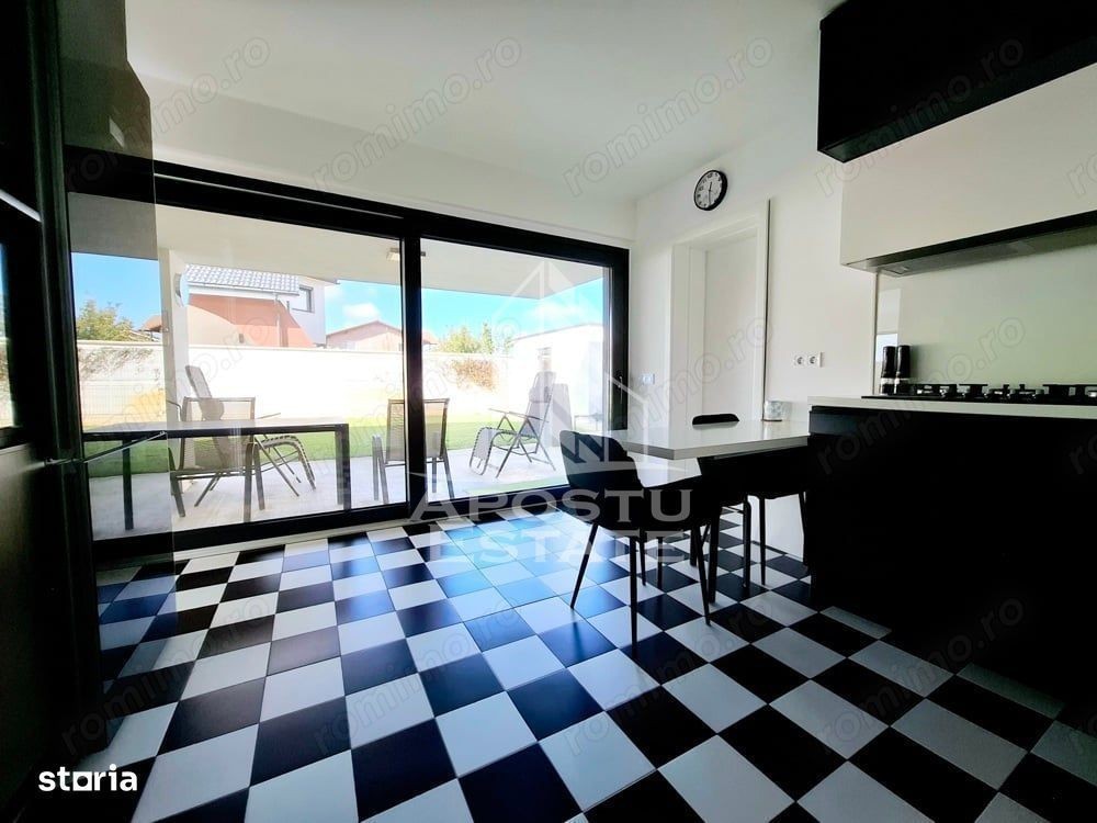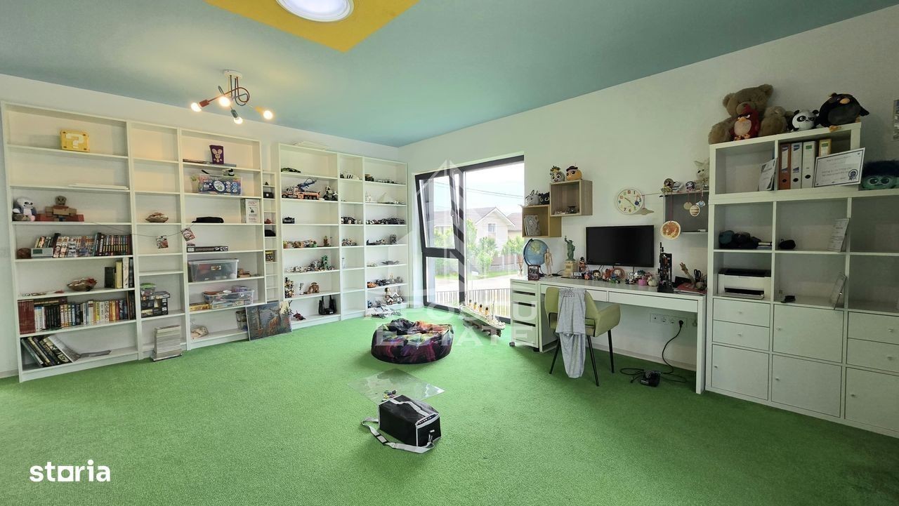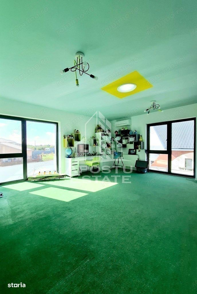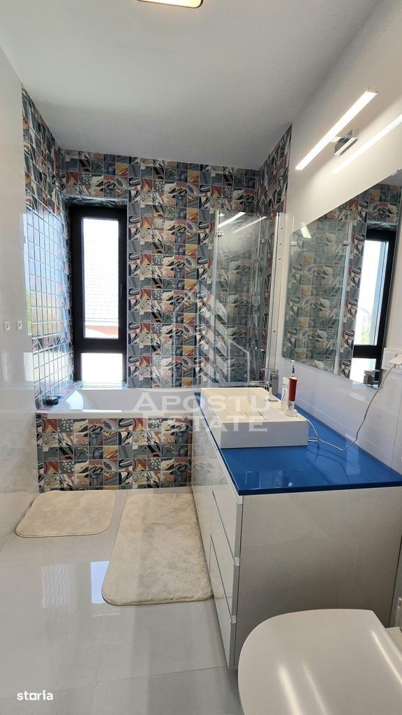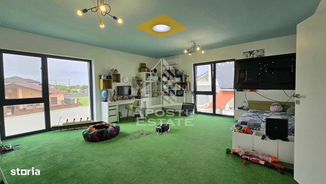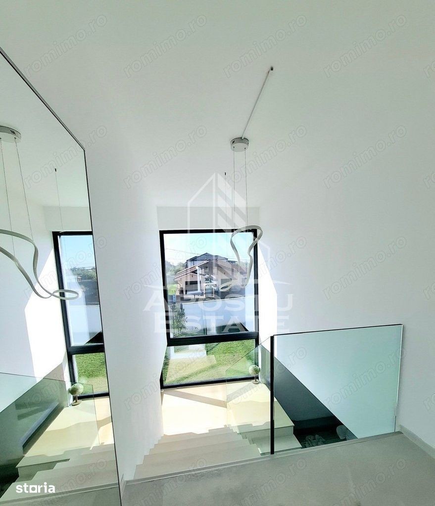 Pentru persoanele care doresc o proprietate intr-adevar unica, cu un aspect deosebit si design modern, luminoasa si la un pas de toate punctele de interes ale zonei. Construita in 2020 pe un teren de 634 mp cu 2 fronturi stradale, si intabulata in octombrie 2021, casa are o suprafata utila de 180 mp, foarte bine impartiti (fara spatii nefunctionale), la care se adauga 2 spatii anexe si anume: - o MAGAZIE (cu acces la apa curenta si electricitate), care se poate transforma usor intr-o bucatarie de vara; si - un BECI cu acces din interior si aerisire naturala (geam). Pentru ca s-au dorit spatii incapatoare si aerisite, aceasta e impartita astfel: Parter: -hol de acces - baie - birou - living luminos cu acces la o terasa neacoperita (de folos in anotimpul rece); - debara - bucatarie cu ieșire la o terasa acoperita (de folos in anotimpul cald); - ETAJ: - HOL incapator; - camera matrimonială, cu baie și dressing propriu -camera copilului cu baie și dressing propriu Confortul termic se realizeaza - in sezonul rece cu ajutorul centralei termice (VIESMANN) legata la un sistem de incalzire prin pardoseala la parter sistem cu calorifere (Purmo) la etaj; - in sezonul cald cu ajutorul celor 3 aparate de aer conditionat (MITSUBISHI) montate - unul la parter si 2 la etaj. La constructia casei calitatea a fost conditia primordiala. Astfel, aceasta beneficiaza de: - termoizolatie exterioara din polistiren de 25 cm (inclusiv fundatia); - invelitoare tip terasa din membrana hidroizolatoare; - tamplarie PVC ALUMINIU Salamander BluEvolution92 cu 2 camere 3 foi de sticla; - parchet special pentru incalzire in pardoseala (Proges); - lemn masiv la scara interioara; - mocheta cu underlay de 10 mm - Raveli; - usi interioare PORTA DOORS; - balustrada din sticla securizata; - Obiecte sanitare cabine de dus: marca GROHE REA ROMSTAL; - Mobilier facut la comanda (INTEGRA DIVANISSIMI) si IKEA; - Electrocasnice MIELE BOSCH exclusiv; Curtea, mare si aerisita, este amenajata cu gazon si alei din beton clasic (pentru ca asa s-a dorit) si piscina supraterana. Exista 2 terase: - una neacoperita pe partea de sud; - una acoperita, pe partea vestica; Gazonul este intretinut cu ajutorul sistemului de irigatie automat, prevazut cu robot si senzor de ploaie, cu dubla alimentare (din foraj sau din reteaua publica). MAGAZIA este complet finisata si amenajata cu blat de lucru, rafturi, spatii de depozitare. Ca si amplasare, locuinta se afla in apropiere de tot ceea ce va intereseaza si va este util in zona: Shopping Mall-ul M CITY se afla la 5 minute de mers pe jos. La fel ca si brutaria, farmaciile, Primaria sau magazinul de bricolaj. Pentru ca toate dotarile si mobilierul au fost special gandite si achizitionate pentru a pune in valoare acest spatiu, vindem casa complet mobilata si utilata. Pretul de vanzare este usor negociabil.