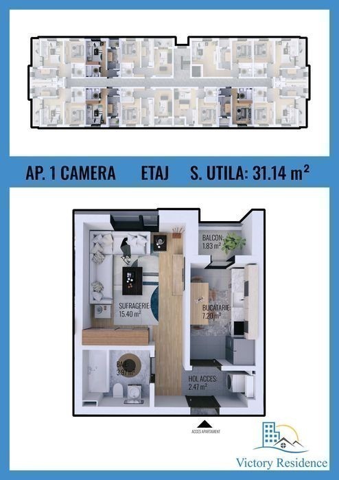 Pentru mai multe apartamente accesati site-ul: www.victoryresidence.ro Descoperă confortul și eleganța la „VICTORY RESIDENCE REZERVELOR” - un ansamblu rezidențial modern, situat într-o zonă verde și liniștită din Militari-Roșu, pe Strada Rezervelor nr. 65. „Victory Residence Rezervelor” este compus din 3 blocuri de dimensiuni mici, cu un total de 184 de apartamente, oferind un mediu ideal pentru o viață confortabilă și liniștită. Apartamentele disponibile: Oferim spre vânzare garsoniere și apartamente cu 2 camere, toate total decomandate, cu bucătării închise și balcoane generoase, perfect concepute pentru confortul familiei tale. Fiecare apartament este construit la cele mai înalte standarde de calitate, cu finisaje moderne și dotări de ultimă generație. Detalii tehnice: • Structura: P+4 etaje, pe cadru de beton solid, cu compartimentare din căramidă Porotherm (interior și exterior). • Izolație: Polistiren de calitate superioară pentru eficiență energetică. • Finisaje: Gresie, faianță, parchet de calitate, obiecte sanitare (WC, cadă, lavoar suspendat). • Încălzire: Sistem de încălzire în pardoseală, cu centrala proprie pe condensare. • Predare la cheie: Apartamentele vor fi pregătite pentru a te muta imediat. • Lift: Inclus pentru un acces facil la fiecare etaj. Locație excelentă: • Situat într-o zonă rezidențială liniștită, dar totodată aproape de tot ce ai nevoie. • Acces rapid la transport public: La doar 10-15 minute de mers pe jos de stația de metrou Preciziei, iar în fața ansamblului vei găsi stații de autobuz (linie 478, 483, 278, 178, 138) și maxi-taxi, la doar 2-3 minute pe jos. La doar câțiva pași de toate facilitățile: • Parcul Comercial Militari (Auchan, Metro, Brico Depot, KFC, Decathlon, Bebe Tei, C&A, H&M, McDonald's, Starbucks), Cora Lujerului, Mall AFI Palace, Lidl, Mega Image, Complexul comercial La Strada, Piscina Aqua Garden Militari și multe altele. • Școli, grădinițe, policlinică și alte facilități esențiale în imediata apropiere. Facilități și avantaje: • Acces la credit bancar - acceptăm credit, fără rate la dezvoltator. • Predare la cheie - mută-te fără griji! Alege Victory Residence Rezervelor pentru un viitor mai bun și mai liniștit într-un ansamblu modern, într-o locație deosebită, aproape de toate facilitățile. Te așteptăm să descoperi apartamentul visurilor tale!