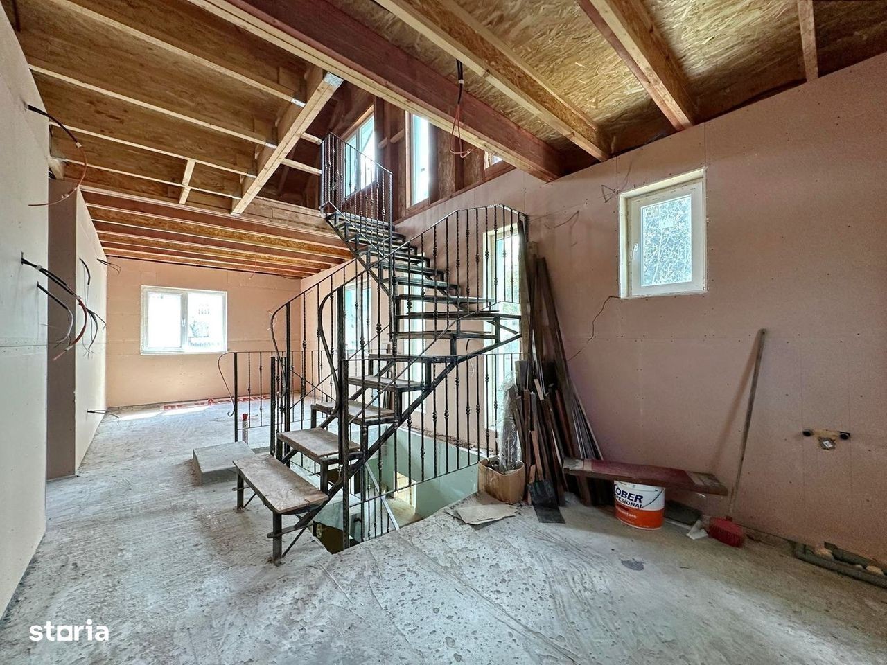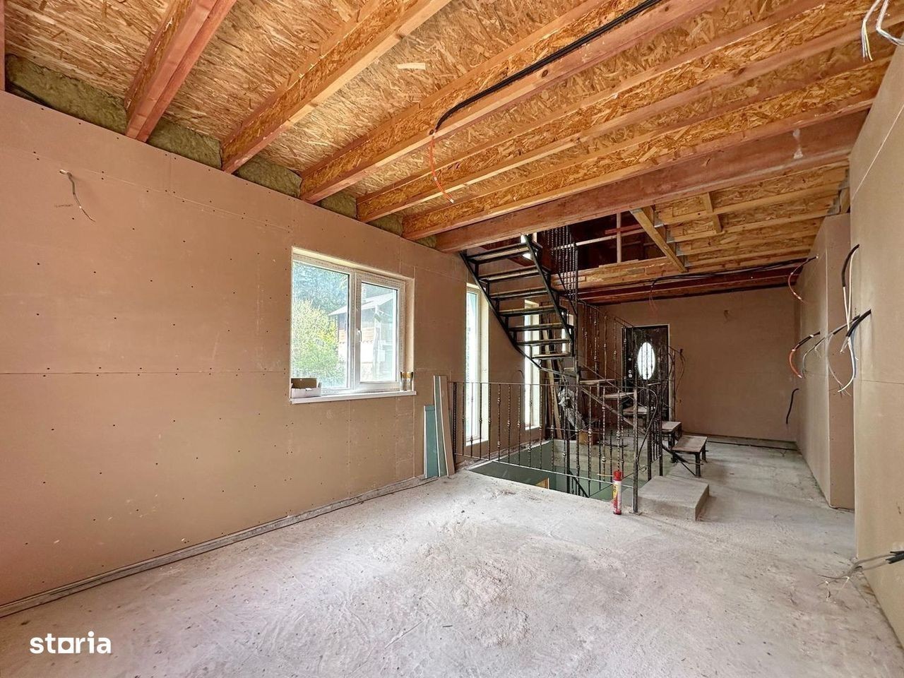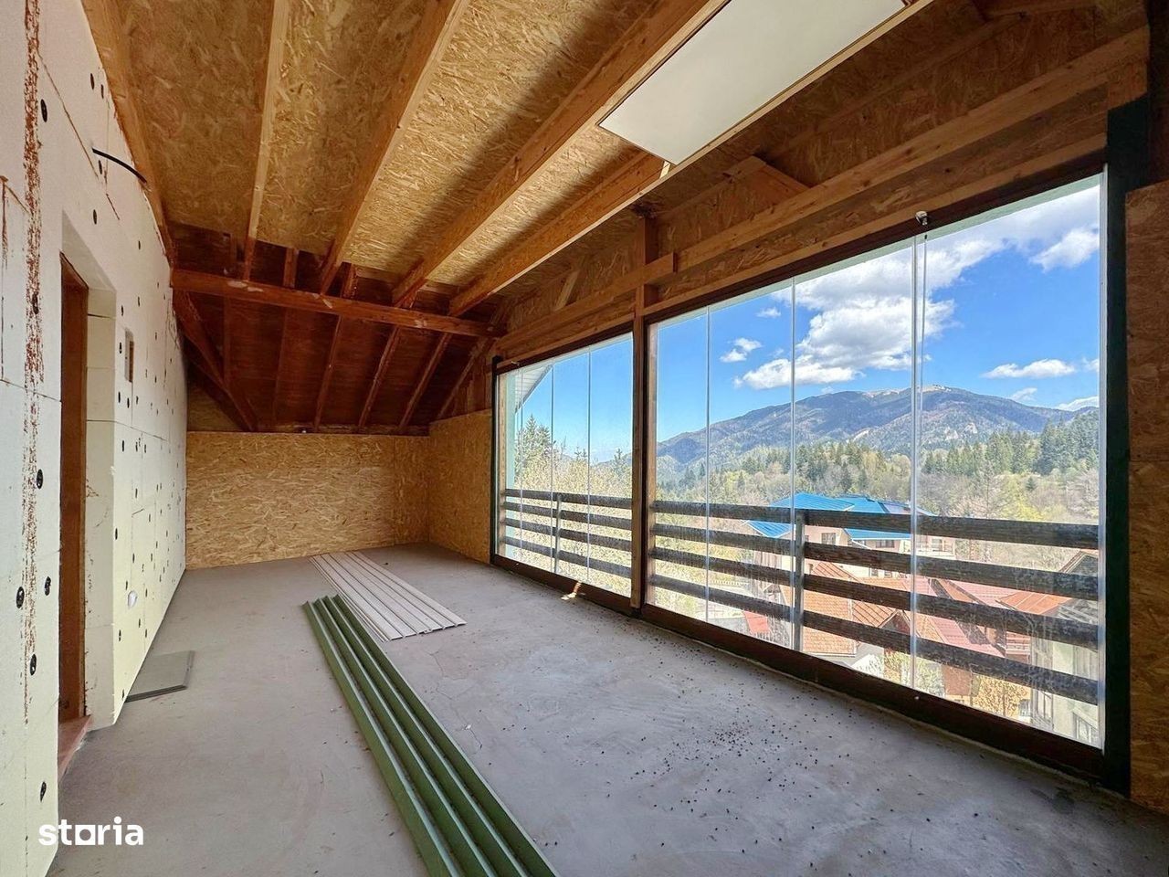 Vă propunem spre vânzare o vilă situată într-o zonă liniștită din Predeal, beneficiind de o panoramă deosebită asupra împrejurimilor. Imobilul este construit din beton și cărămidă, fiind izolat termic cu polistiren și vată. Proprietatea dispune de o suprafață utilă de 480 mp, o suprafață desfășurată de 632 mp și este amplasată pe un teren de 712 mp. Compartimentare: Demisol: două camere, două băi, cameră tehnică, beci și garaj. Parter: recepție, birou (sau dormitor), cameră de zi, dormitor cu baie proprie, baie de serviciu, bucătărie, cămară, balcon de 10 mp și terasă de 31 mp. Etaj: patru camere, fiecare cu baie proprie, plus două camere de zi si terasa de 18mp. Mansardă: neamenajată. Imobilul se vinde în stadiul de „la gri”, ceea ce permite amenajarea interioară după propriul gust, iar ca utilitati racordate avem: apa, curent, gaz si canalizare prin fosa septica.