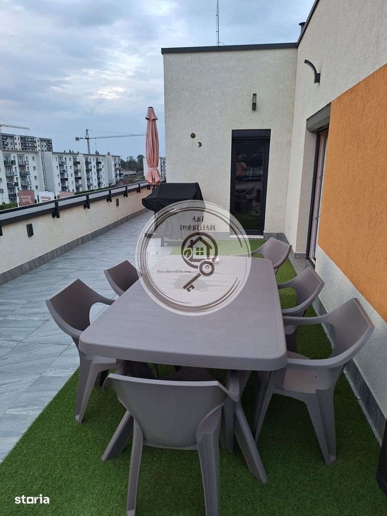 ABI IMOBILIARE vă prezintă spre vânzare un penthouse elegant, situat într-un bloc nou, finalizat în 2022, în zona Tractorul - GRANDIS RESIDENCE. * Suprafață utilă de 77 mp, completată de o terasă spectaculoasă de 66 mp, cu vedere panoramică către Muntele Tâmpa, Masivul Postăvarul și Munții Bucegi * Terasa este amenajată cu zonă de barbeque, mobilier de grădină și chiuvetă dedicată Compartimentare interioară: * Bucătărie complet echipată (mașină de spălat vase, frigider, plită, cuptor, hotă), cu acces direct pe terasă * Living luminos, cu ieșire în terasă * Dormitor matrimonial cu baie proprie și dressing * Dormitor secundar * Baie principală dotată cu cadă * Debara (spațiu de depozitare) Dotări și finisaje premium: * Mobilier realizat manual din lemn masiv, produs la Cristuru Secuiesc * Tapet de designer Trussardi * Încălzire în pardoseală * Jaluzele verticale fonice și termice * Pervazuri din granit la ferestre * Iluminare exterioară terasament * Hidroizolație profesională cu cauciuc siliconat etanșat * Izolație suplimentară la nivelul acoperișului (față de standardul dezvoltatorului), culoare albă - ideală pentru reducerea acumulării de căldură vara * Aer condiționat instalat din faza de construcție - fără cabluri vizibile Alte facilități: * Loc de parcare acoperit inclus în preț Preț: 265.000 euro (cu parcare inclusă) Comision: 2% din prețul vânzării Pentru mai multe detalii și vizionare ma puteți contacta - Biriș Ionela