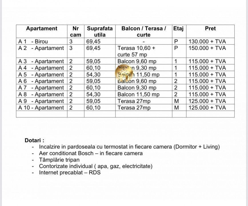 Apartamente noi Otopeni - zona Odăi | 2 camere | Dotări premium Situate într-o zonă liniștită și în dezvoltare din Otopeni - Odăi, aceste apartamente noi sunt ideale pentru locuit sau investiție. Imobilul oferă compartimentări eficiente, terase generoase și finisaje premium. Apartamente 2 camere - aproximativ 60 mp utili, cu balcoane sau terase de până la 27 mp Preț vanzare 115.000 € + TVA Dotări incluse: • Încălzire în pardoseală cu termostat în fiecare cameră (Living + Dormitoare) • Aer condiționat Bosch în fiecare cameră • Tâmplărie tripan de înaltă calitate • Contorizare individuală (apă, gaz, electricitate) • Internet RDS preinstalat • Terase, balcoane sau curți generoase • Etaje disponibile: Parter, Etaj 1, Etaj 2, Etaj retras Avantaje locație - Otopeni, zona Odăi: • Acces rapid către DN1, București și Aeroportul Henri Coandă • Zonă liniștită, cu infrastructură în dezvoltare • Ideal pentru familii sau investiție pe termen lung Contact: Laura Sava Consultant imobiliar cu portofoliu generos de proprietati în Otopeni și Mogoșoaia. Vă invit cu drag la vizionare - vă pot ajuta să găsiți locuința perfectă pentru dvs.!