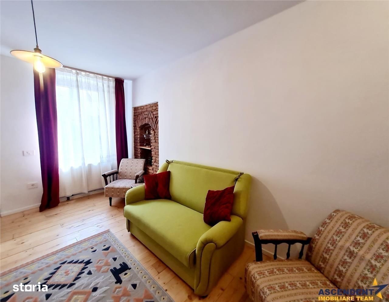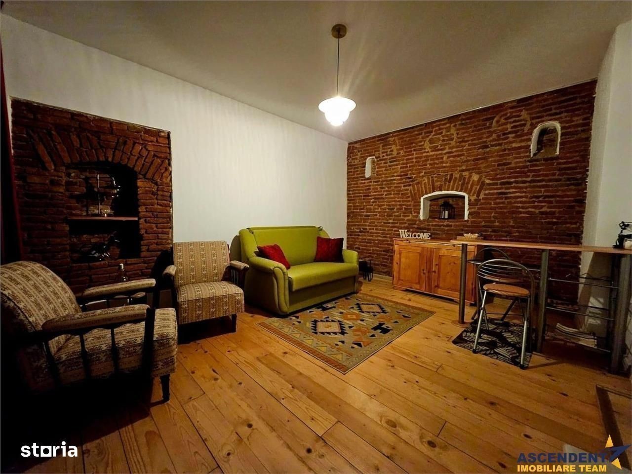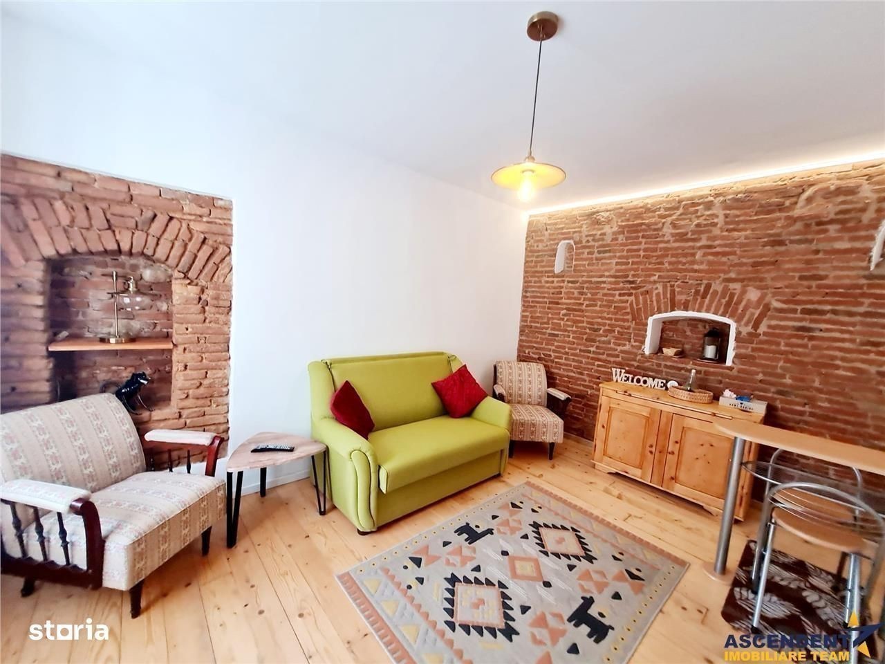 Comision cumparator: 2% + TVA, din valoarea de tranzactionare. Ascendent Imobiliare va prezinta un apartament pozitionat excelent in zona centrala a orasului Brasov. Proprietatea complet renovată are o nota vintage, data de designul de interior, astfel incat se armonizeaza perfect cu cladirile istorice ale centrului Brasov. Cu o structura semidecomandata, avem urmatoarea configuratie: - living cu zona de dinning, hol, dormitor matrimonial, bucatarie micuta complet echipata, baie cu cada Este o proprietate cocheta, pe un nivel inalt de parter, care poate fi preluata imediat pe segmentul investitional sau in care va puteti muta rapid fara sa necesite renovari. Rezidenta cu sistem de alarma pe senzori. Curtea este comuna, dar extrem de generoasa si spatioasa. Beneficiati de loc de parcare în curtea interioara. Are posibilitatea de extindere mansarda. Proprietatea se preda complet mobilata si utilta. Accesul este facil catre toate punctele de interes, statie RAT in proximitate, la 5 minute distanta de centrul istoric. Forma de plata: achizitie cu plata cash (prin transfer bancar) Consultant specializat pe oferta: doamna Gilda Georgescu Tel Whapp