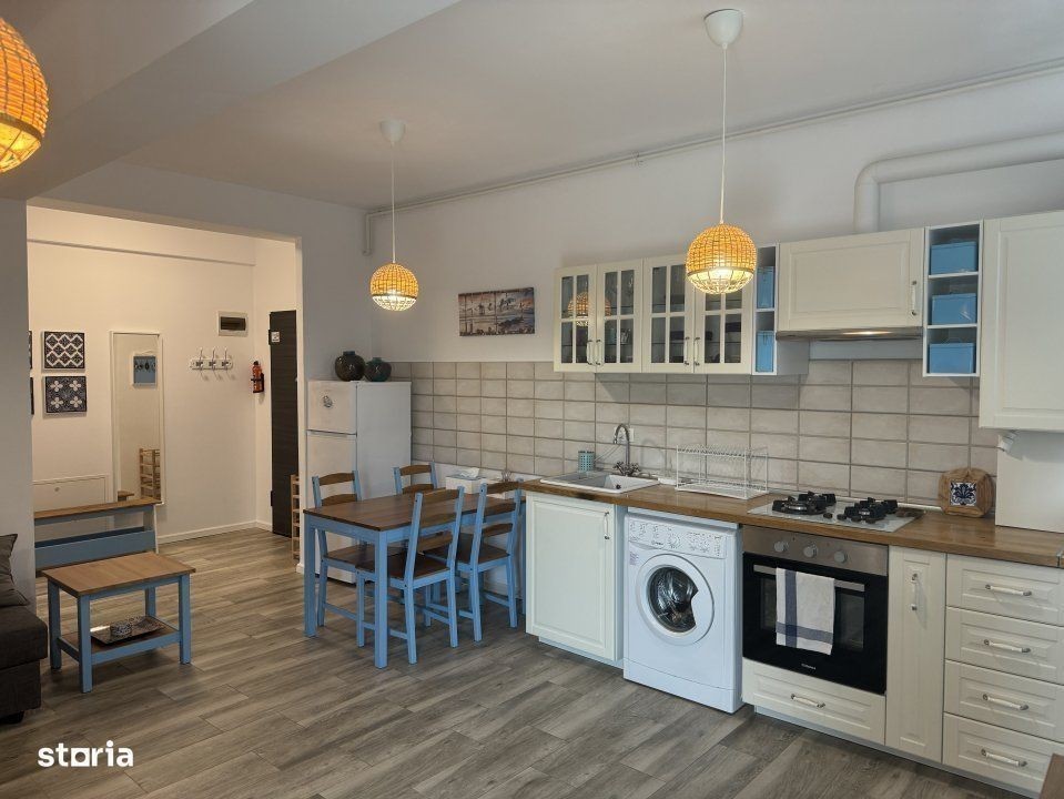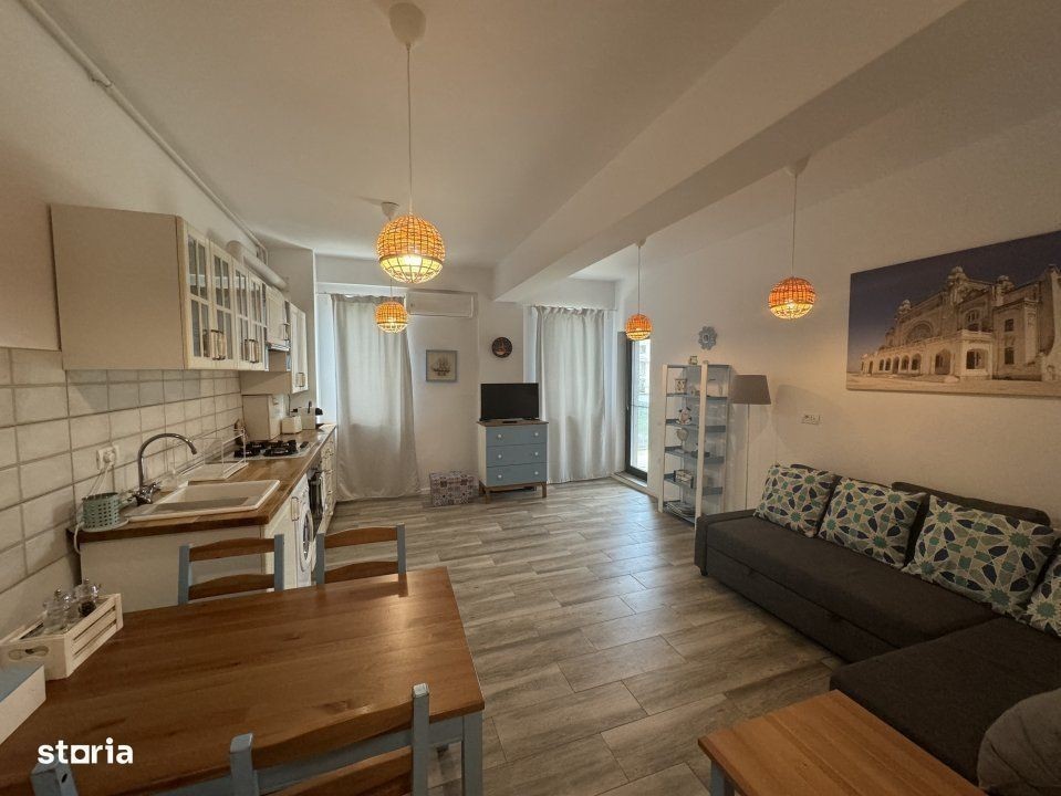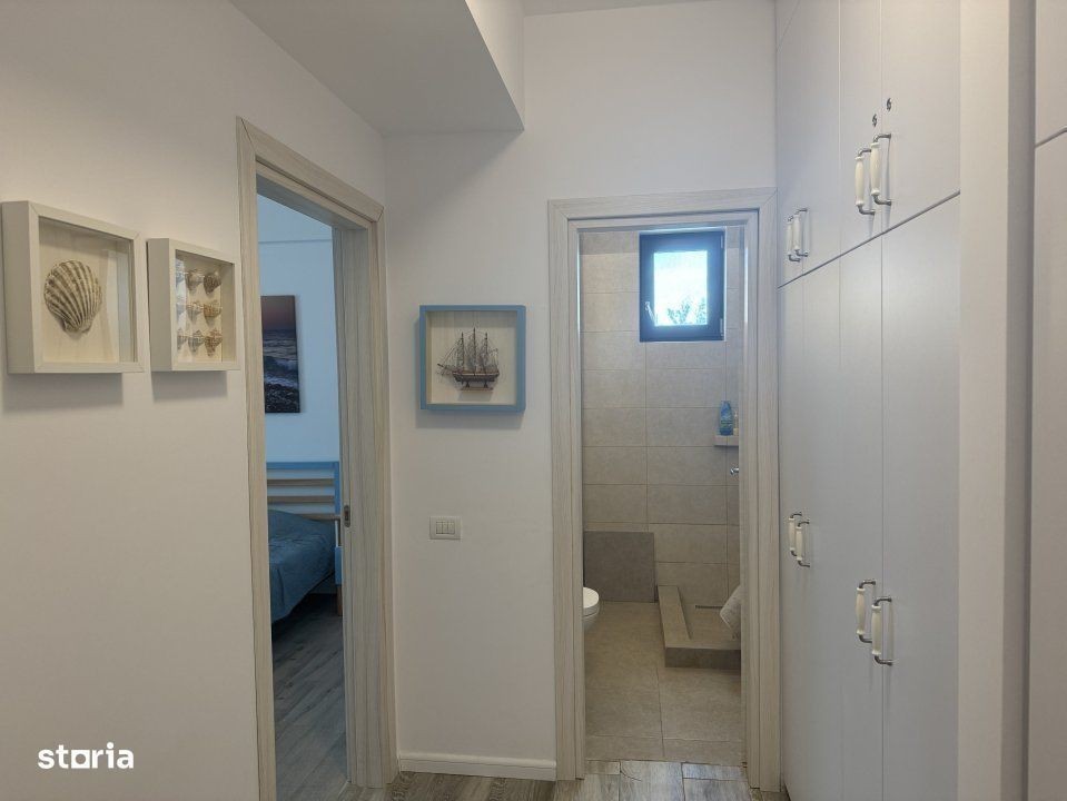 Va propun spre vanzare un superb apartament de 2 camere situat in chiar pe faleza Marii Negre in zona Mamaia Nord -Navodari in cadrul Building Stefan, la 50 m de plaja,intr-un imobil dat in folosinta in anul 2018. Apartamentul propus se afla la etajul 2, are vedere spre laterala si spatele imobilului, este format din hol intrare, bucatarie cu living open space, acces la o terasa superba de 8mp, loc unde poti savura cafeaua de dimineata, dormitor, baie cu dus si aerisire naturala.Apartamentul este decorat in stil maritim, se vinde complet mobilat si utilat, astfel incat poate fi valorificat inca din prima zi din care va fi achizitionat de noul proprietar. Apartamentul este gandit si mobilat in cel mai mic detaliu, apartament in care s-a investit mult timp si suflet, astfel incat o sa ai senzatia de vacanta ori de cate ori ii treci pragul. Este un apartament ideal pentru cei ce isi doresc un apartament pentru investitie la malul Marii Negre, cat si pentru cei ce isi doresc un o proprietate unde sa "evadeze" departe de zgomotul si stresul vietii de zi cu zi. Datorita pozitiei, plaja este la nici un minut de mers pe jos, unul dintre cele mai bune restaurante din zona sunt la 2 pasi de imobil. Pretul este fix