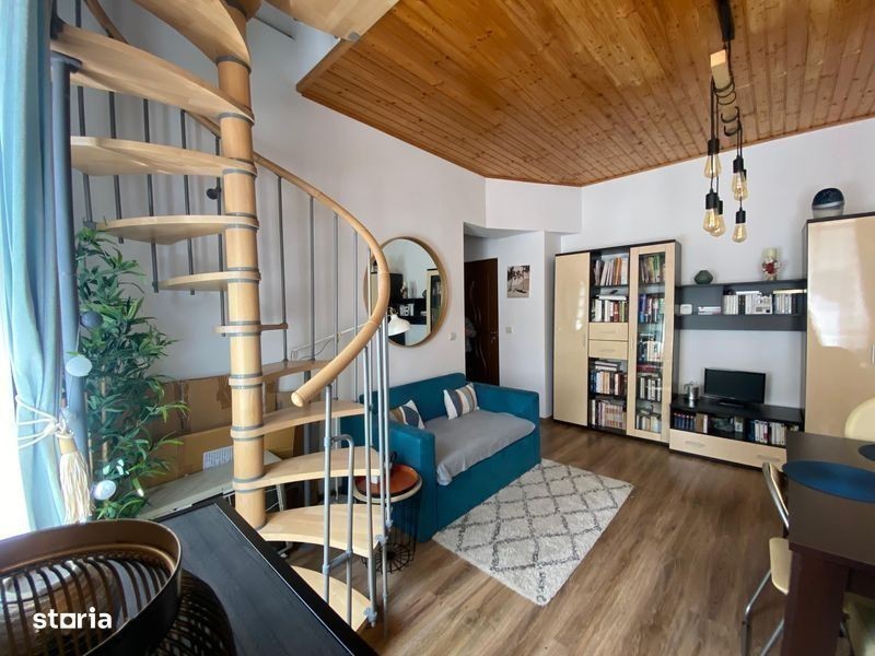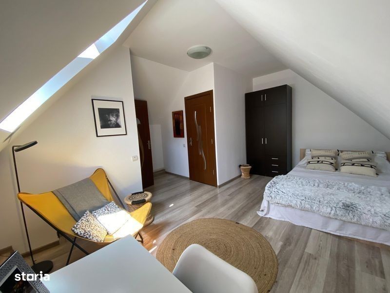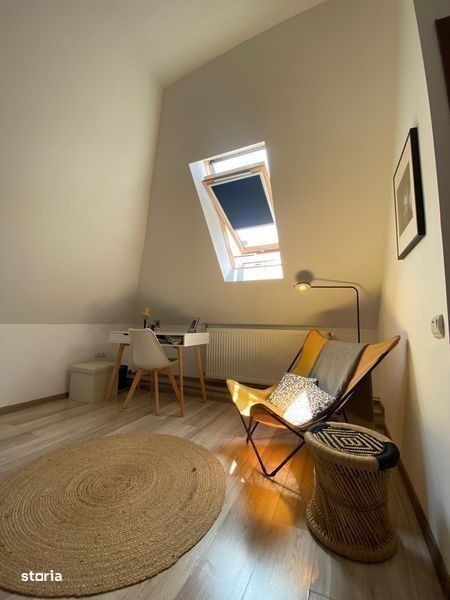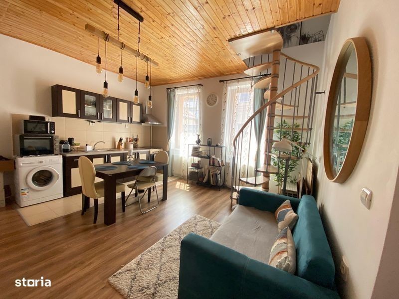 Apartament la casa compus din: salon cu bucatarie open space, baie cu dus la parter.O camera,o baie cu vana si un spatiu de depozitare la mansarda.Acces individual.Zona calma.Posibilitate de parcare a unui vehicul.Proprietatea dispune de un spatiu beci neamenajat.Tip de incalzire centrala pe gaz. Apartamentul necesita schimbarea usii.Proprietatea se vinde complet utilata si mobilata conform fotografiilor exceptand obiectele personale si de apropiere : statie transport in comun,lidl,centru comercial Afi,parcuri,scoli,spital. Foarte aproape de centrul Brasovului.Imobilul se preteaza foarte bine si pentru regim hotelier prin pozitionare si structura.