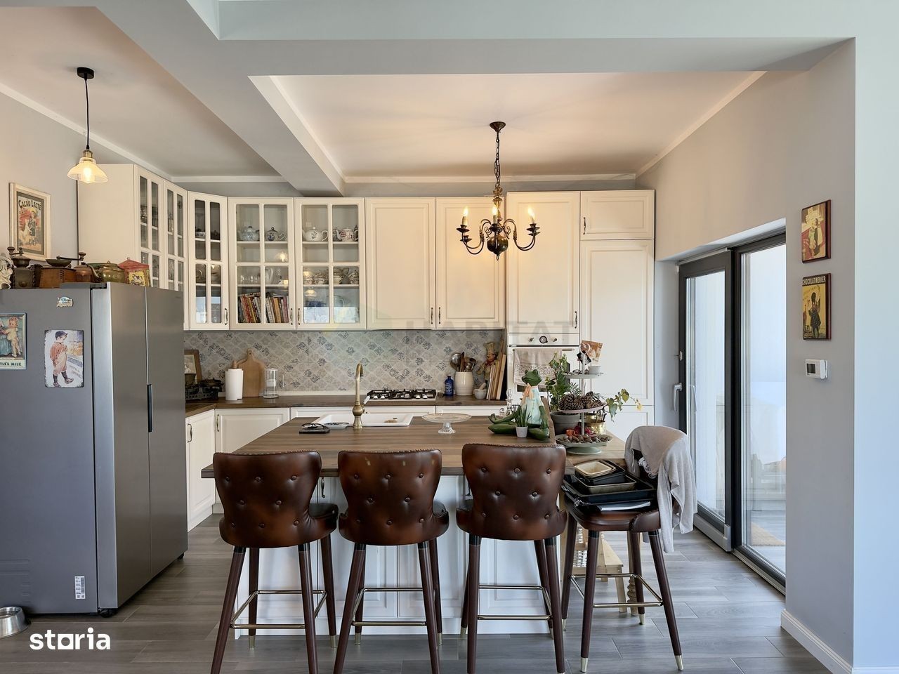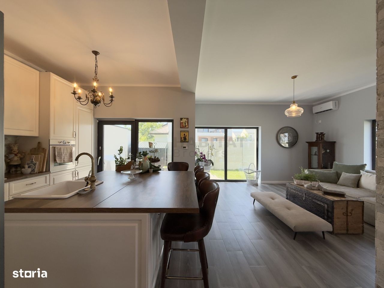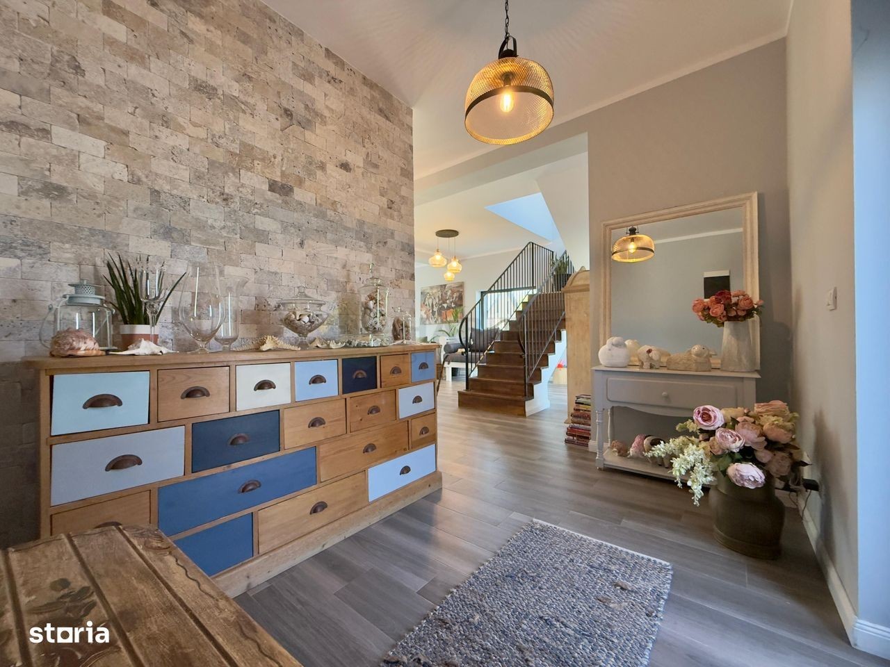 Reducere de pret de la 320.000 euro! Situată într-un cartier liniștit din Tunari, această vilă cochetă îmbină armonios funcționalitatea modernă cu un aer cald și primitor. O locuință ideală pentru cei care își doresc un spațiu intim, bine organizat și frumos amenajat. Exteriorul impresionează printr-o curte de 200 mp, complet amenajată cu plante decorative și pomi fructiferi, oferind un colț verde de relaxare perfect pentru dimineți liniștite sau seri petrecute în aer liber. Sunt disponibile două locuri de parcare în fața casei. Parterul este gândit deschis, cu un living generos și o bucătărie integrată, mobilată complet într-un stil romantic, shabby chic - un spațiu luminos și aerisit, în care fiecare detaliu a fost ales cu grijă. Tot aici se află și un grup sanitar discret, precum și zone de depozitare bine poziționate. Etajul găzduiește trei dormitoare confortabile, dintre care unul matrimonial cu baie proprie. Celelalte două camere împart o baie modernă, iar balconul oferă un plus de deschidere și lumină. Dotări moderne: Încălzire în pardoseală, cu termostate individuale în fiecare cameră Centrală termică pe gaz Ferestre mari ce asigură lumină naturală din plin Complex rezidențial închis, cu acces securizat Această proprietate este ideală pentru o familie care caută un loc bine construit, cald și funcțional, într-o zonă ferită de agitația orașului, dar cu acces facil către Nordul Capitalei.