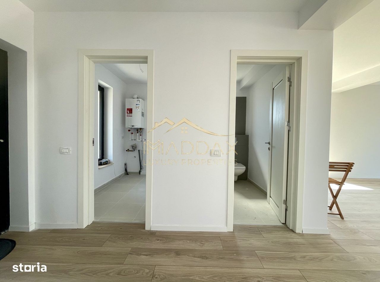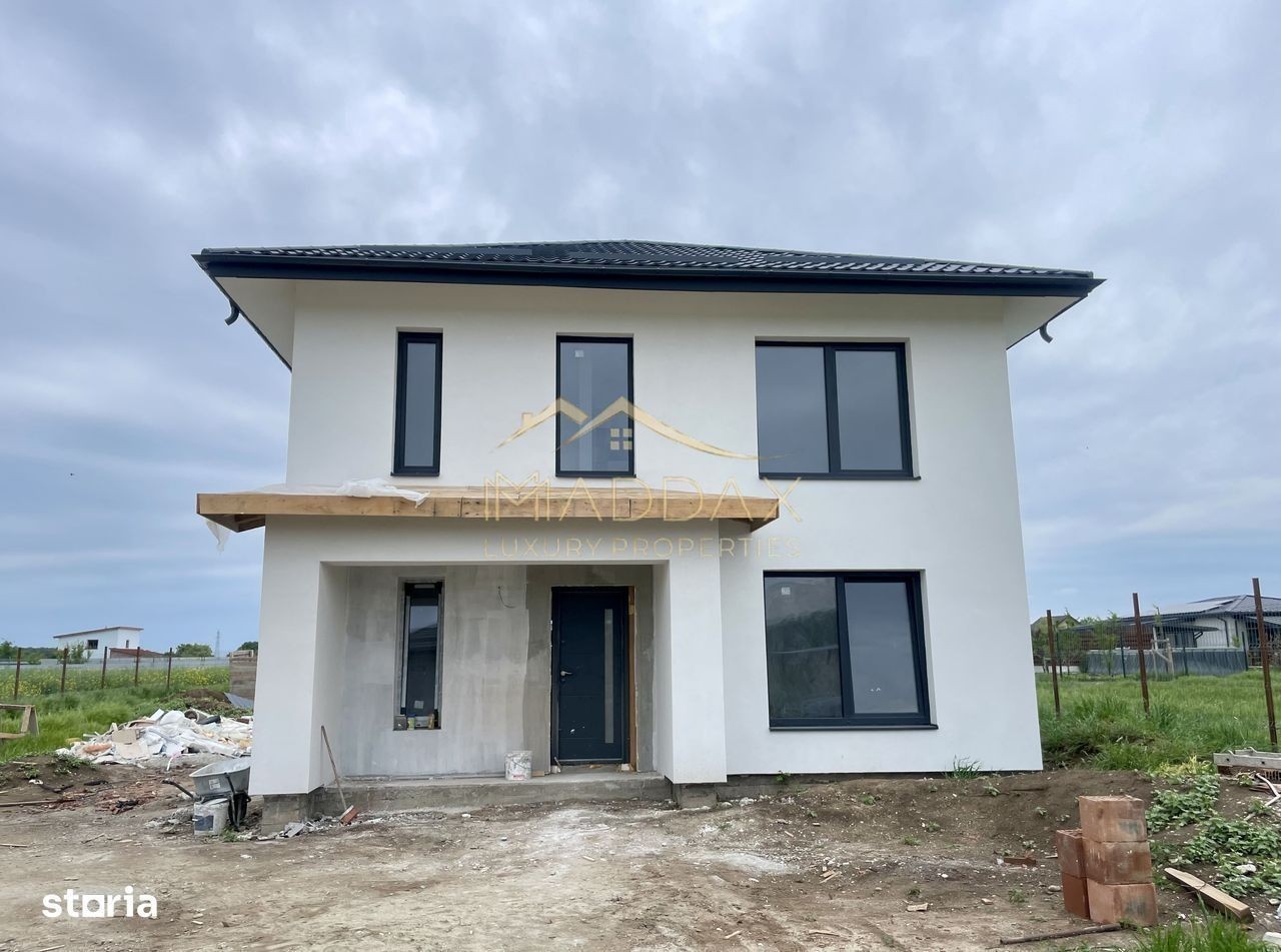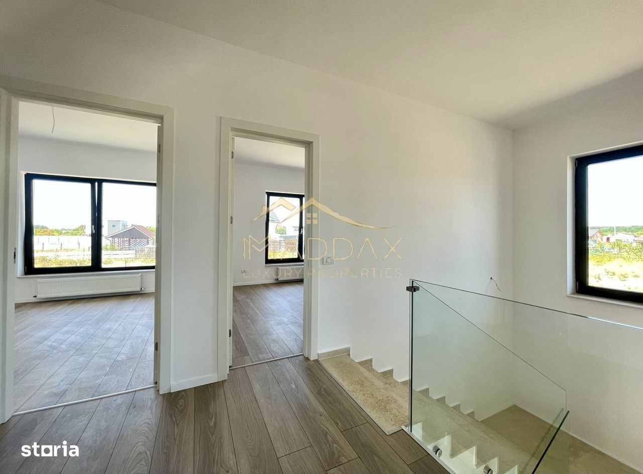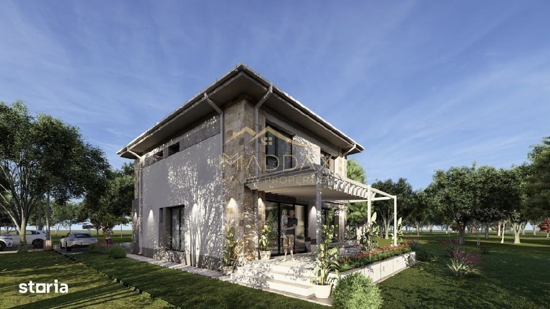 MADDAX Luxury Properties are placerea de a va prezenta spre vanzare o vila eleganta, tip P+1, situata intr-o comunitate exclusivista din localitatea Balotesti. Locatia se afla intr-un cadru natural deosebit, langa padure, si beneficiaza de o pozitionare strategica, oferind acces facil la marile artere ale capitalei: DN1, autostrazile A3 si A0. In proximitate (la ~2,5 km) se regasesc: Edenland Park, Drumbrava Vlasiei. Lucrarile la metroul spre Otopeni (Magistrala 6) sunt deja demarate, ceea ce va oferi un plus de valoare proprietatilor si conexiune rapida cu capitala. Regiunea este in plina dezvoltare, vilele noi construite in zona fiind amplasate pe suprafete generoase de teren, ceea ce asigura confort si intimitate. Vila impresioneaza printr-o compartimentare excelenta, perfecta pentru stilul de viata contemporan. Parterul cuprinde livingul spatios + zona de dining (25.88 mp), terasa pavata cu travertin (25.36 mp), bucatarie (11.88 mp), camera pentru hobby/birou/dormitor oaspeti (13.63), camera tehnica (3.45 mp) si baie (3.68 mp). La etaj regasim 3 dormitoare (17.97 mp/15.12 mp/11.88 mp), dressing (5 mp) si 2 bai (6.19 mp/4.51 mp). Suprafețele vitrate generoase permit luminii naturale să inunde spațiile interioare, creând o atmosferă luminoasă și primitoare. *Casa se preda complet finisata, cu materiale de inalta calitate selectate de designer. Incălzirea în pardoseală se afla pe toata suprafata parterului, avand incorporat sistem wireless pentru reglarea temperaturii. La etaj sunt montate calorifere de otel, iar in bai radiatoare portprosop. *Constructia este realizata pe fundatii continue din beton armat, structura cu stalpi, grinzi si planseu armat peste parter de 15 cm grosime. *Fundatiile sunt hidroizolate cu bitum pensulat si placate cu polistiren de 5 cm. Zidaria este executata din blocuri ceramice cu grosimea de 30 cm. Invelitoarea este din tigla metalica marca BILKA. Toate compartimentarile interioare sunt din caramida, peretii tencuiti si gletuiti, sapele elicopterizate. *Se acorda garantie pentru lucrarile aparente timp de 2 ani de la data predarii, pentru orice defectiune aparuta. *Casa dispune de doua locuri de parcare amenajate cu pavaj, curte nivelata pregatita pentru insamantarea gazonului, sursa de apa cu robinet montata in curte, cabluri de iluminat pentru intreaga proprietate, senzori de gaze, instalatie de impamantare. Vila este complet finisata si pregatita pentru a primi noii proprietari. *Si daca aveti o familie de prieteni pe care vi-i doriti aproape, dezvoltatorul are disponibila o casa similara chiar vizavi. Astfel, veti putea impartasi zi de zi bucurii, momente si amintiri impreuna. Va oferim oportunitatea unui nou inceput, intr-o casa care are tot ce va doriti: spatiu, lumina, confort, intimitate, aer curat si natura. Pentru mai multe detalii, suntem aici pentru dumneavoastra, Echipa MADDAX Luxury Properties