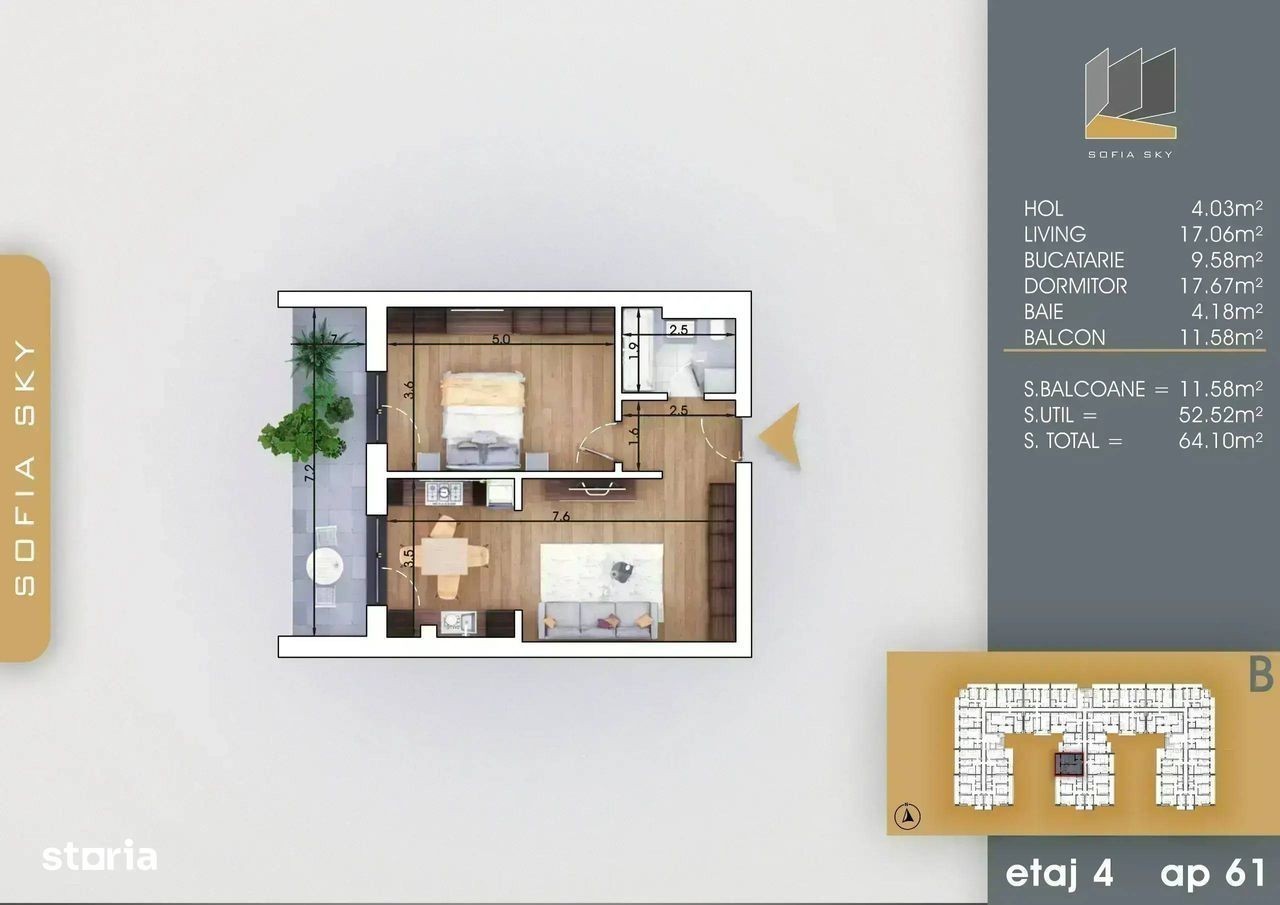 Va oferim un apartament cu 2 camere intr-un ansamblu rezidential in constructie, cu regim de inaltime P+ 12E, in sectorul 3, la cateva minute de metrou Nicolae Teclu. Apartamentul se afla la etajul 2/12 si are o suprafata totala de 64.11 mp, cu living de 17.06 mp, cu bucataria 9.58 mp, dormitor 17.67 mp, hol 4.03 mp, baie de 4.18, si un balcon generos de 11.58 mp. De asemenea, locuinta dispune de un sistem performant de incalzire prin pardoseala. Predarea apartamentului se va face in noiembrie 2025. Pretul afisat este pentru plata surse proprii si nu include tva. Pentru un avans de 15%,pretul este 105 500 euro+ tva Te asteptam la biroul nostru de vanzari Titan Park pentru a-ti gasi locuinta viitoare! Andreia Corpaci