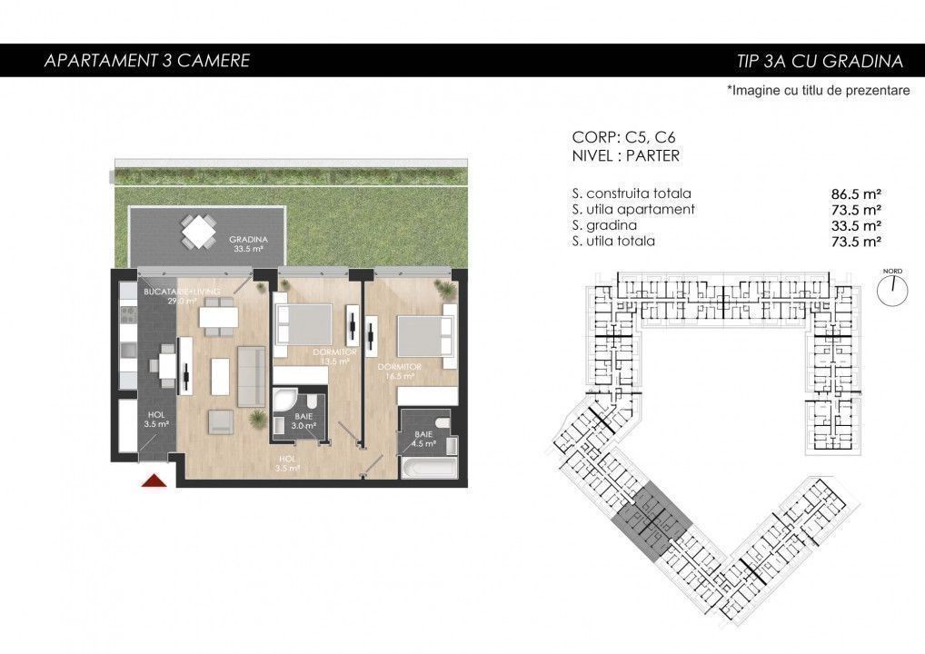La pretul afisat se adauga TVA! Atria Urban Resort - Stil de viață modern într-un ansamblu aerisit, intim si inconjurat de spații verzi și relaxare. Atria Urban Resort redefinește conceptul de locuire urbană, oferind un echilibru rar între confort, natură și conectivitate, la doar câteva minute de Bucureștii Noi și Băneasa. Proiect dezvoltat în etape, format din clădiri cu regim de înălțime P+4 și P+6, care păstrează un echilibru între intimitate și spațiu. 75% din suprafața complexului este dedicată zonelor verzi, piscinelor, aleilor de promenadă, locurilor de joacă, piațetelor și locurilor de parcare. Spațiile dintre blocuri sunt generoase, gândite pentru relaxare și confort, oferind grădini interioare, spații de socializare și locuri de joacă sigure. Atria Urban Resort este alegerea perfectă pentru cei care vor să se bucure de liniștea unei comunități prietenoase, în timp ce rămân aproape de oraș. Apartament 3 camere - 74 mp utili + terasă 13,5 mp Apartamentul propus este situat la etajul 4 și îți oferă: Living luminos, cu loc de dining/birou și acces direct pe terasă Bucătărie inchisa, cu iesire pe terasa Dormitor matrimonial spațios, cu dressing si baie proprie Dormitor secundar/spatiu birou cu acces la terasa Baie modernă cu cada, cu finisaje de calitate Terasă generoasă de 13,5 mp, perfectă pentru relaxare în aer liber Dotări și finisaje Încălzire în pardoseală cu centrală proprie Ferestre mari pentru lumină naturală optimă Ușă metalică și video interfon Finisaje moderne, în tonuri neutre Atria Urban Resort - facilități și beneficii pentru un stil de viață modern și sustenabil Piscină privată pentru rezidenți Parcuri, spații verzi și alei de promenadă între clădiri Piațete și locuri de joacă pentru copii Locuri de parcare pentru rezidenți și vizitatori, integrate armonios în peisajul complexului Standard de construire nZEB (Nearly Zero Energy Building) - eficiență energetică ridicată pentru costuri de întreținere reduse Panouri solare pentru încălzirea apei menajere - soluție sustenabilă pentru confort sporit Acces securizat și pază 24/7 Comunitate modernă, cu infrastructură completă și vecini prietenoși Localizare și acces Aproape de Băneasa Shopping City, Colosseum Mall și zona comercială Bucureștii Noi Acces facil la DN1, Centura Capitalei și Aeroportul Otopeni Transport public în apropiere - metrou Străulești și linii STB