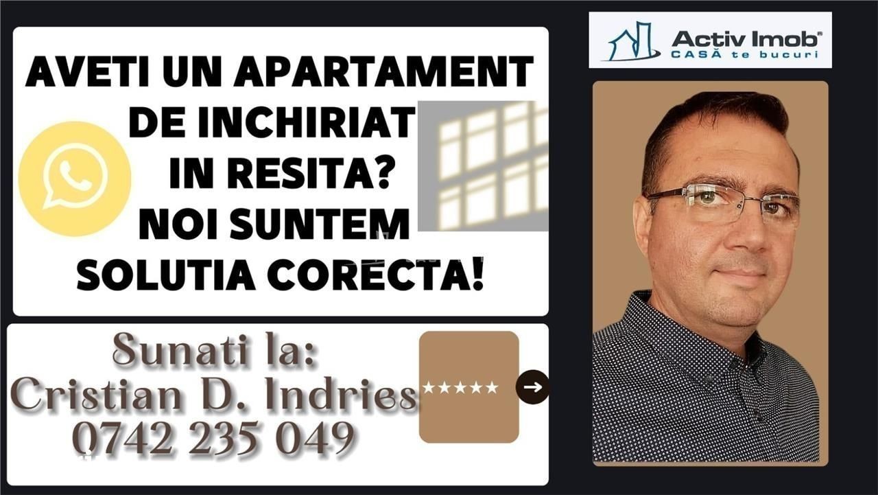 BENEFICII PENTRU CLIENTII ACESTEI OFERTE: 1. Proprietatea are 2 camere cf. 2, dintre care un dormitor, o sufragerie, o bucatarie tip open space, mobilata si utilata, o baie, un balcon inchis in termopan, un hol, se afla la et. 4 al unui bloc de 4 etaje si are o suprafata totala de circa 42 Mp. Detine centrala termica, geamuri termopan (dormitor, baie, bucătărie), iar la sufragerie unul din lemn, usa metalica la intrare, usi interioare schimbate. Are aplicat parchet laminat, gresie si faianta de buna calitate iar baia este prevazuta cu aerisire. Blocul din care face parte apartamentul este izolat pe exterior iar casa scarii este ingrijita. Se închiriază mobilat si utilat (aragaz, frigider, masina de spalat rufe) Dacă si dumneavoastra aveti o proprietate in Resita sau in Judetul Caras-Severin si doriti sa o vindeti sau sa o inchiriati, va rugam sa sunati la numerele de telefon