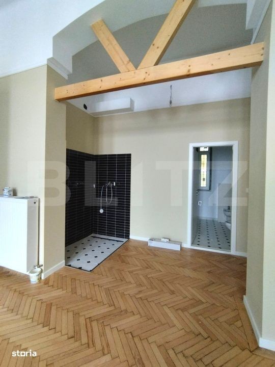 Blitz va propune un apartament în care nu intri, ci pășești. Pentru că încă de la primul pas, te întâmpină lumina filtrată generos prin ferestre înalte, podelele de lemn natural, ușile elegante și sentimentul acela rar - că ești într-un spațiu care "se așază" perfect. Situat la etajul 1 al unei vile istorice aflate în curs de renovare, acest apartament cu 100 mp utili este o invitație la echilibru. Spațiul este gândit în jurul unui living generos, aerisit, cu zonă de dining și bucătărie, care te cucerește nu prin opulență, ci prin liniștea estetică dată de tonuri naturale, texturi blânde și accente discrete de design industrial. Cele două dormitoare sunt separate. Dormitorul principal devine o mică suită privată, cu baie proprie și duș integrat în cameră - un detaliu arhitectural modern și funcțional, fără a rupe armonia întregului. Atmosfera generală este una calmă, dar actuală. Parchetul de lemn masiv, ușile originale recondiționate, corpurile de iluminat discrete, ferestrele înalte - toate contribuie la un spațiu coerent, matur, dar deloc rigid. Zona este verde și liniștită, la doar câteva minute pietonal de centrul istoric al Timișoarei. Accesul este rapid, dar liniștea din interiorul apartamentului și din jurul clădirii te face să uiți că ești în oraș. Un apartament care nu e doar de văzut, ci de simțit. Și care poate deveni acasă pentru cineva care caută mai mult decât metri pătrați - caută senzația de acasă.