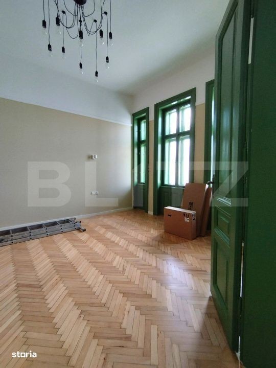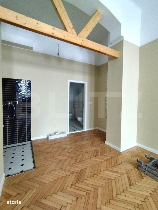 Blitz va propune un apartament în care nu intri, ci pășești. Pentru că încă de la primul pas, te întâmpină lumina filtrată generos prin ferestre înalte, podelele de lemn natural, ușile elegante și sentimentul acela rar - că ești într-un spațiu care "se așază" perfect. Situat la etajul 1 al unei vile istorice aflate în curs de renovare, acest apartament cu 100 mp utili este o invitație la echilibru. Spațiul este gândit în jurul unui living generos, aerisit, cu zonă de dining și bucătărie, care te cucerește nu prin opulență, ci prin liniștea estetică dată de tonuri naturale, texturi blânde și accente discrete de design industrial. Cele două dormitoare sunt separate. Dormitorul principal devine o mică suită privată, cu baie proprie și duș integrat în cameră - un detaliu arhitectural modern și funcțional, fără a rupe armonia întregului. Atmosfera generală este una calmă, dar actuală. Parchetul de lemn masiv, ușile originale recondiționate, corpurile de iluminat discrete, ferestrele înalte - toate contribuie la un spațiu coerent, matur, dar deloc rigid. Zona este verde și liniștită, la doar câteva minute pietonal de centrul istoric al Timișoarei. Accesul este rapid, dar liniștea din interiorul apartamentului și din jurul clădirii te face să uiți că ești în oraș. Un apartament care nu e doar de văzut, ci de simțit. Și care poate deveni acasă pentru cineva care caută mai mult decât metri pătrați - caută senzația de acasă.